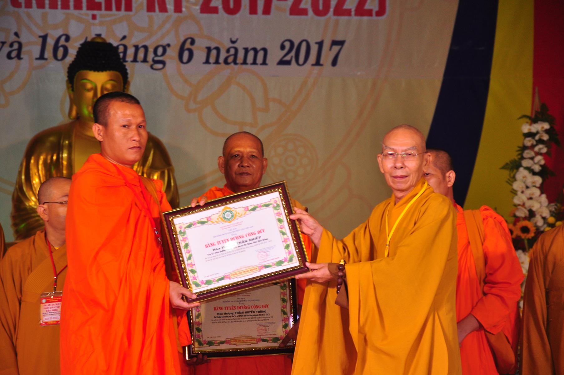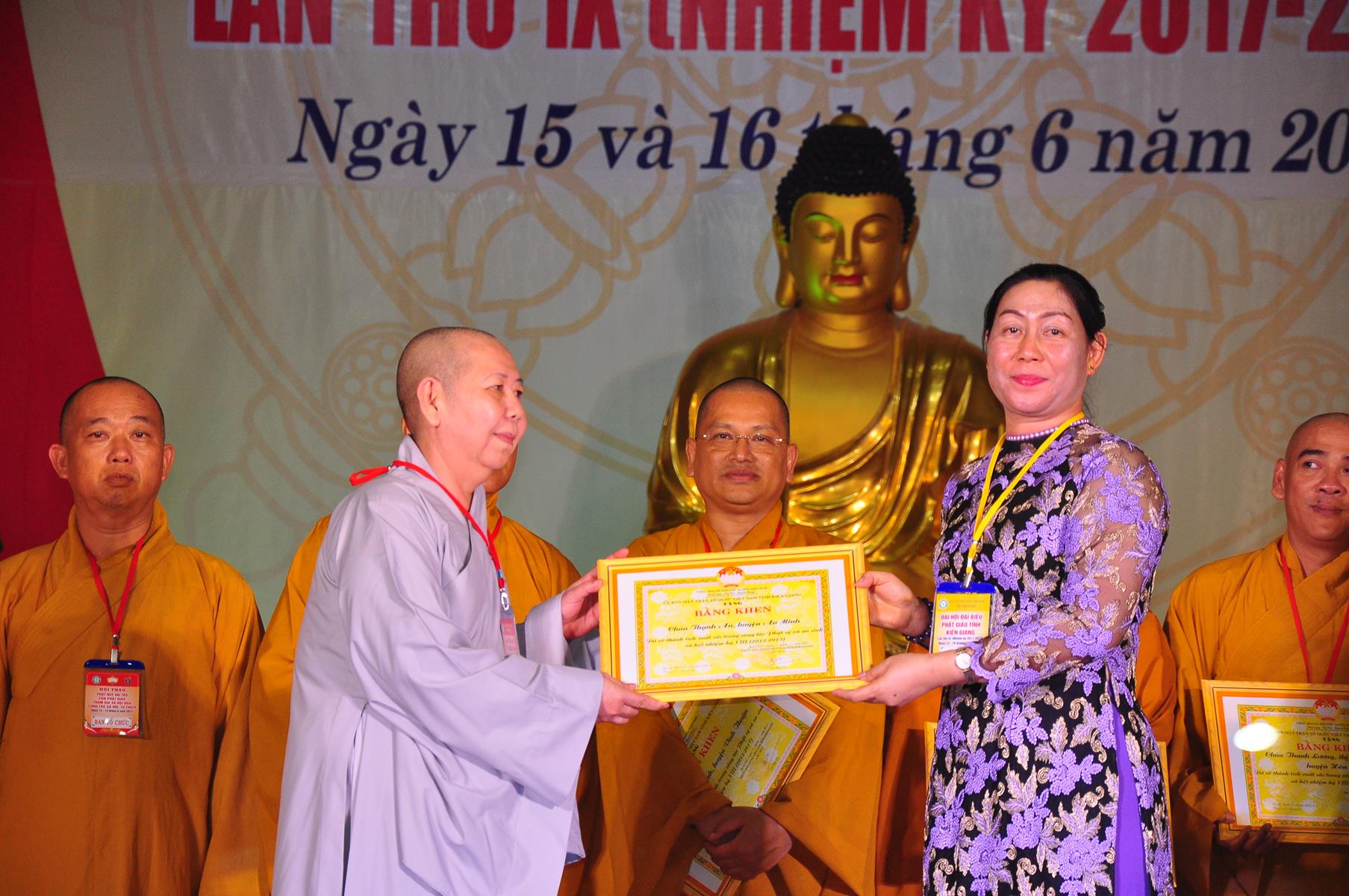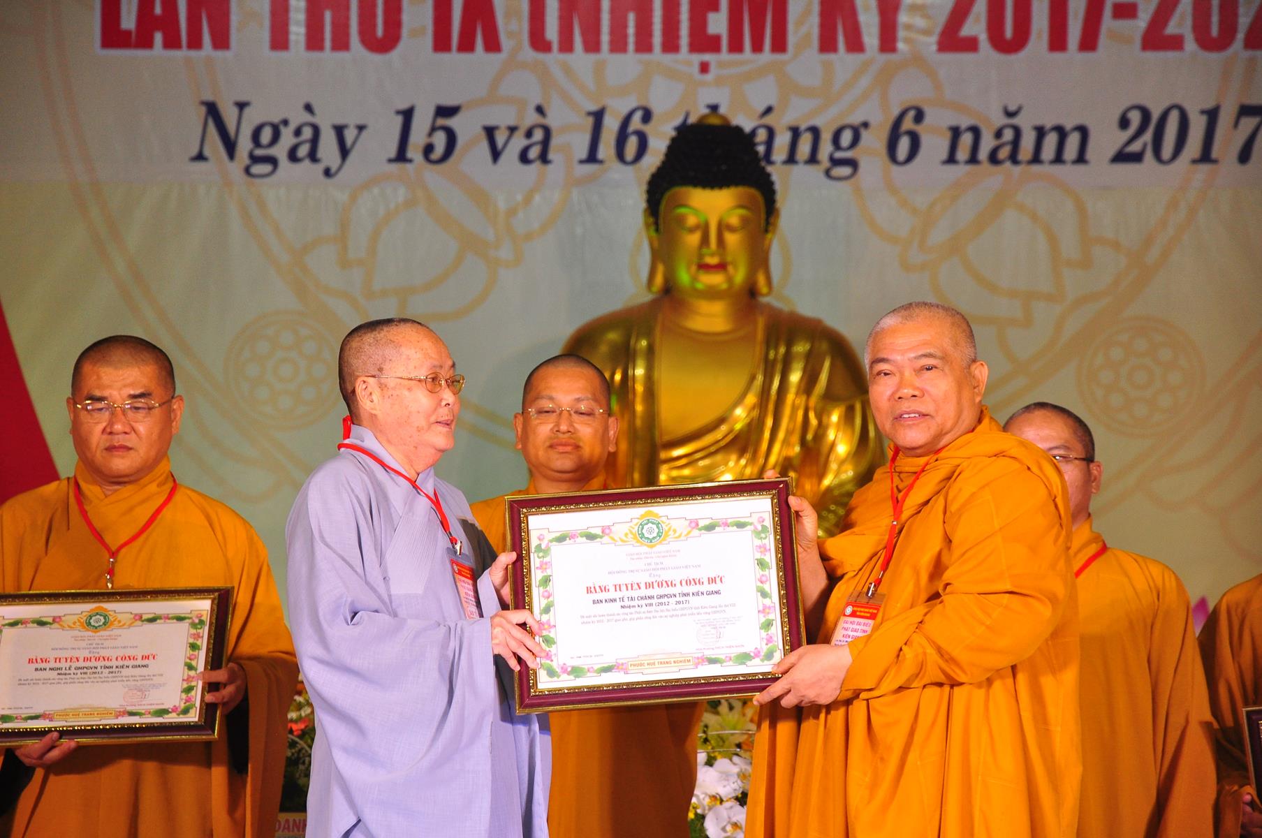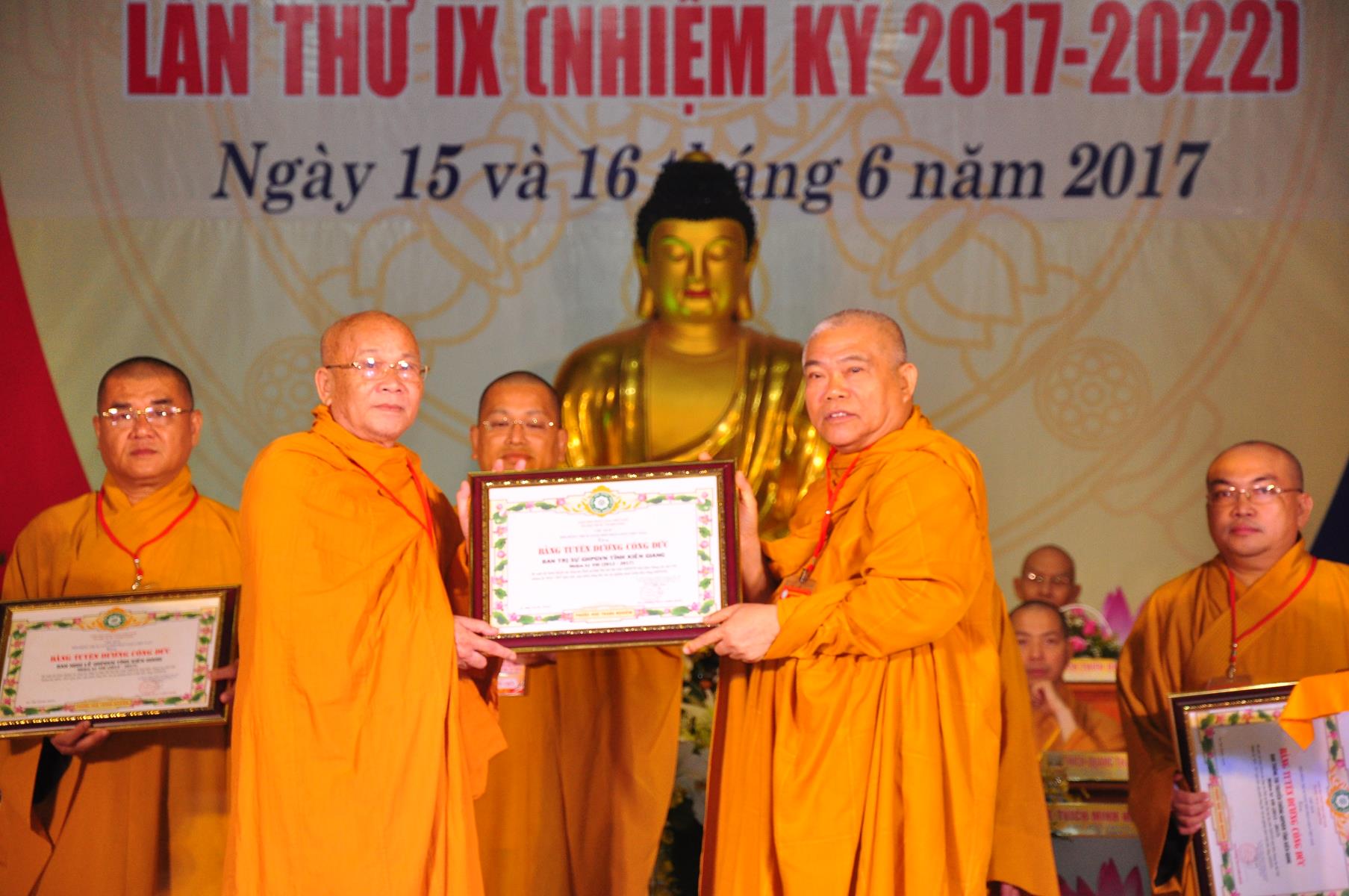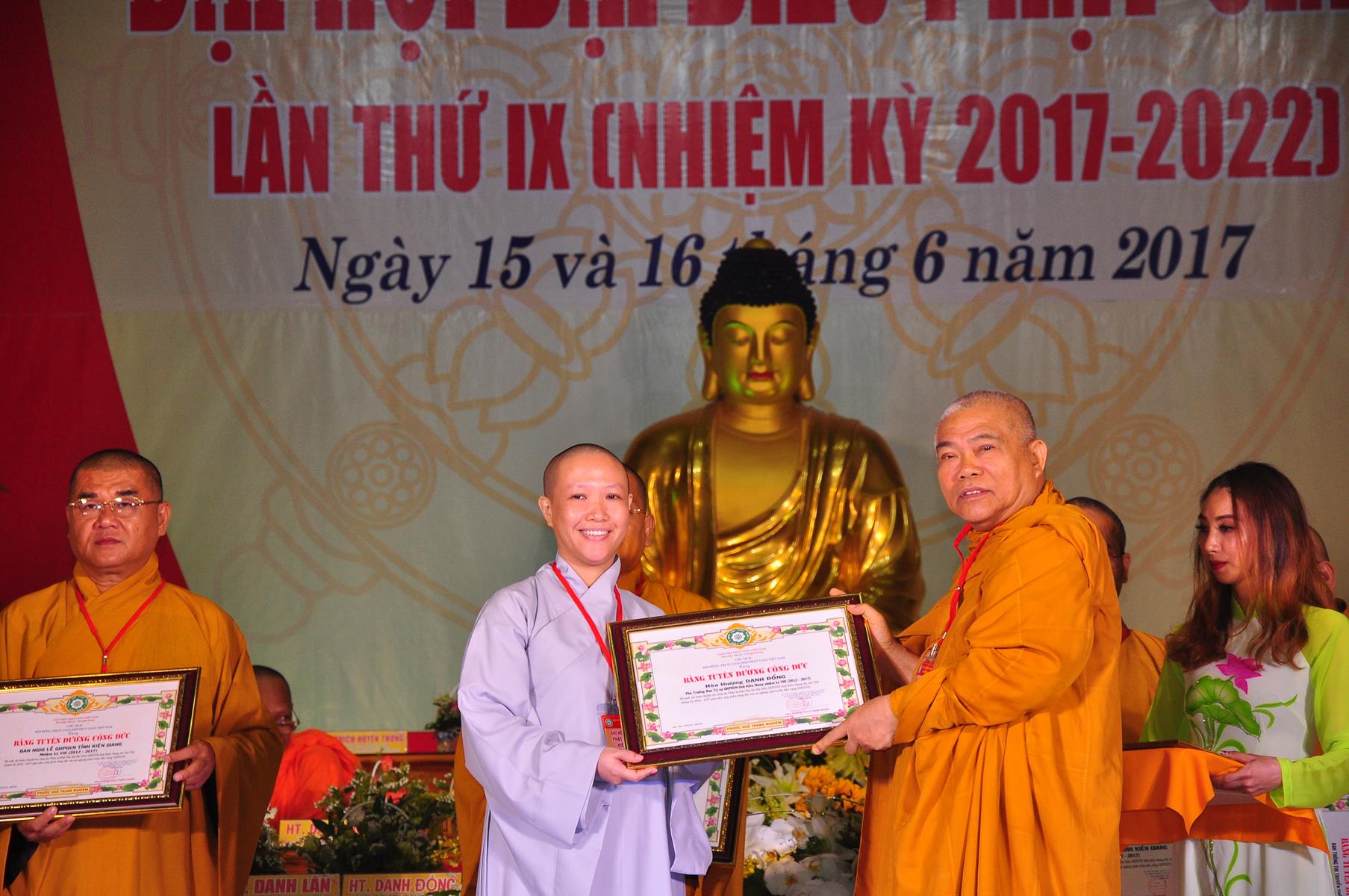 Tại Đại hội, Thường trực HĐTS quyết định tặng Bằng Tuyên Dương Công Đức cho 13 tập thể và 35 cá nhân xuất sắc trong hoạt động Phật sự nhiệm kỳ qua; Đồng thời, TT HĐTS tặng bằng Tuyên Dương Công Đức cho Ủy ban MTTQVN tỉnh Kiên Giang.