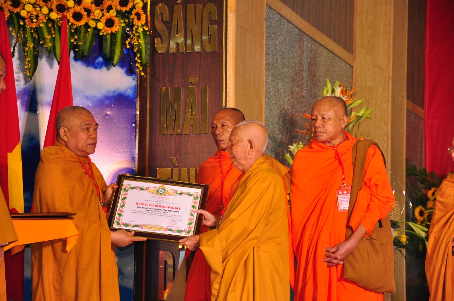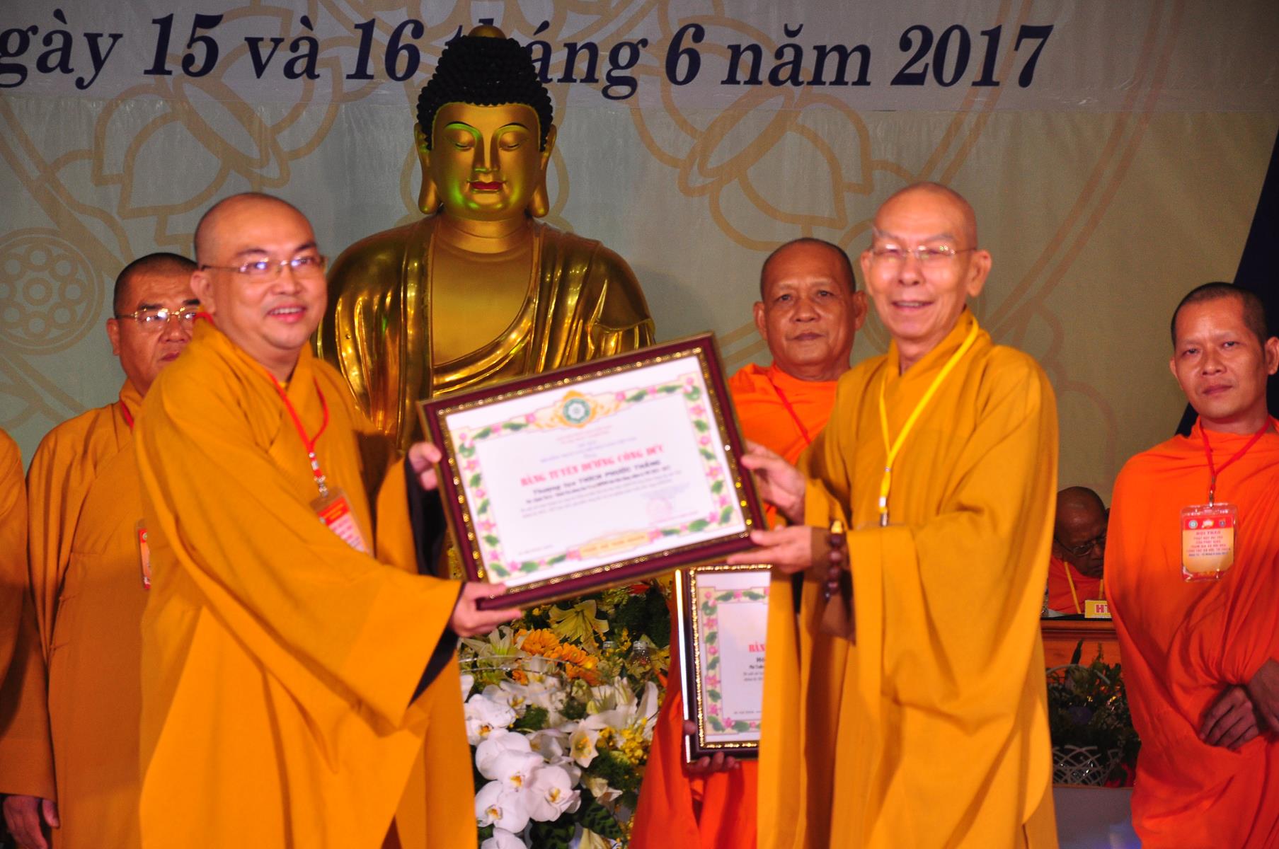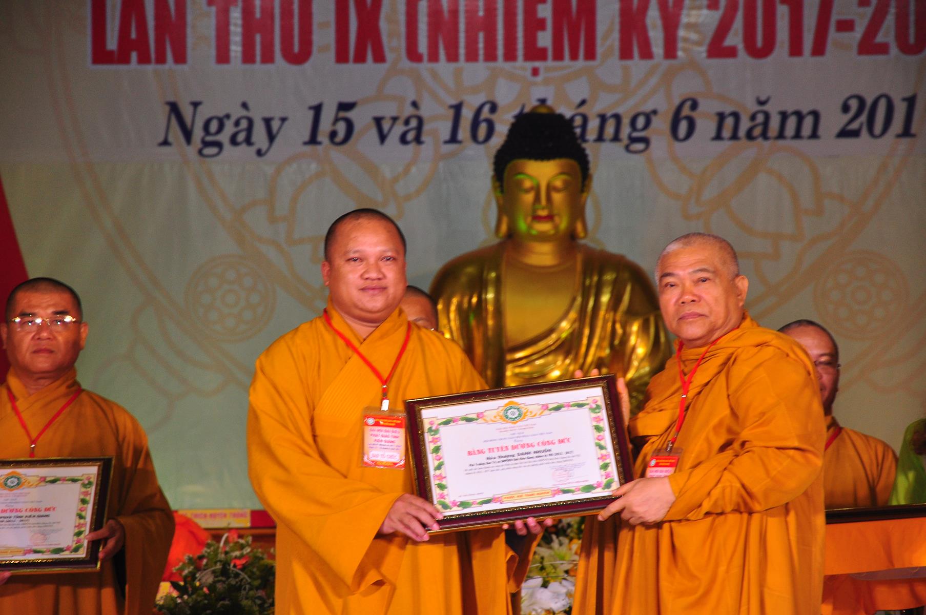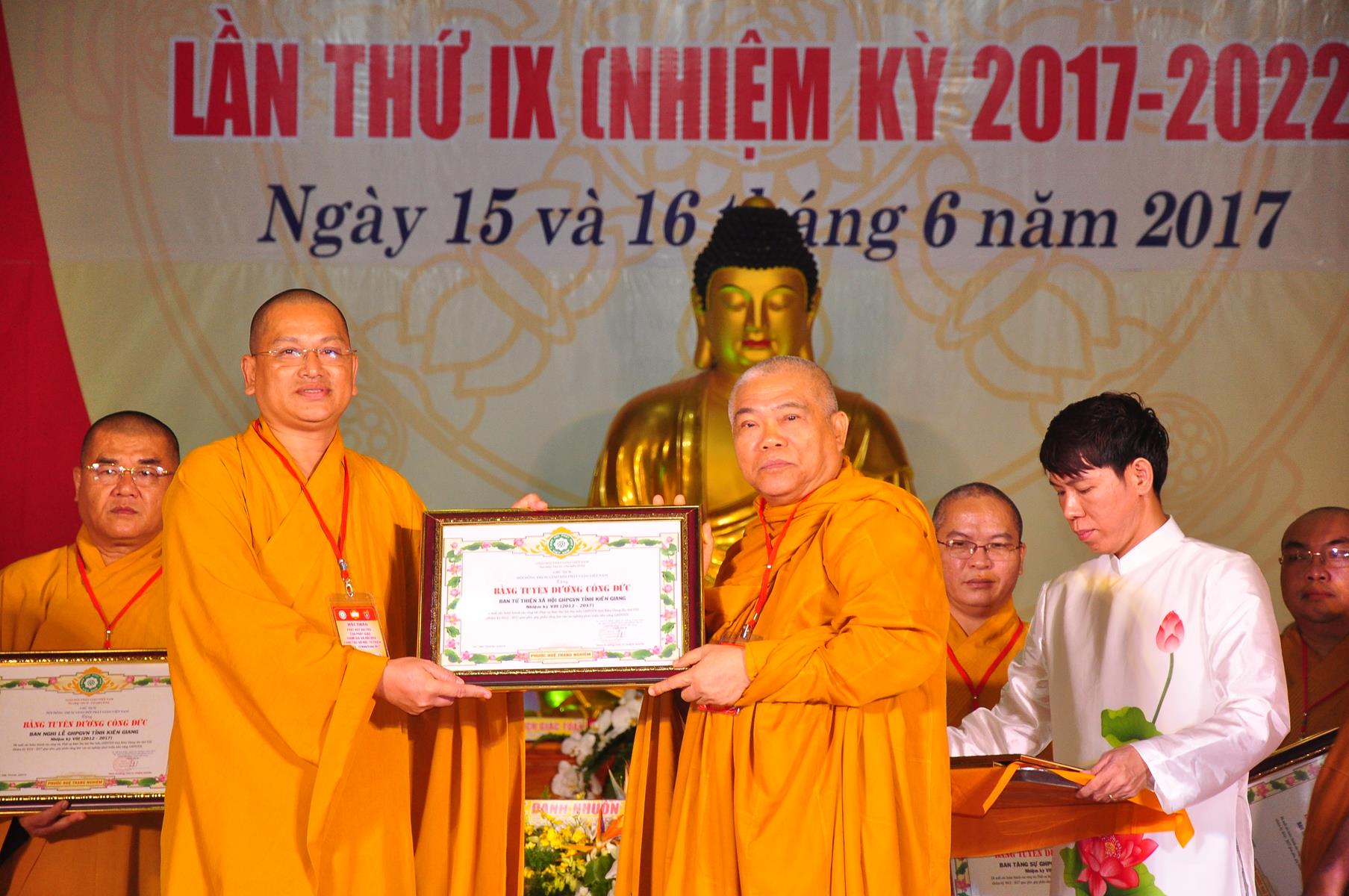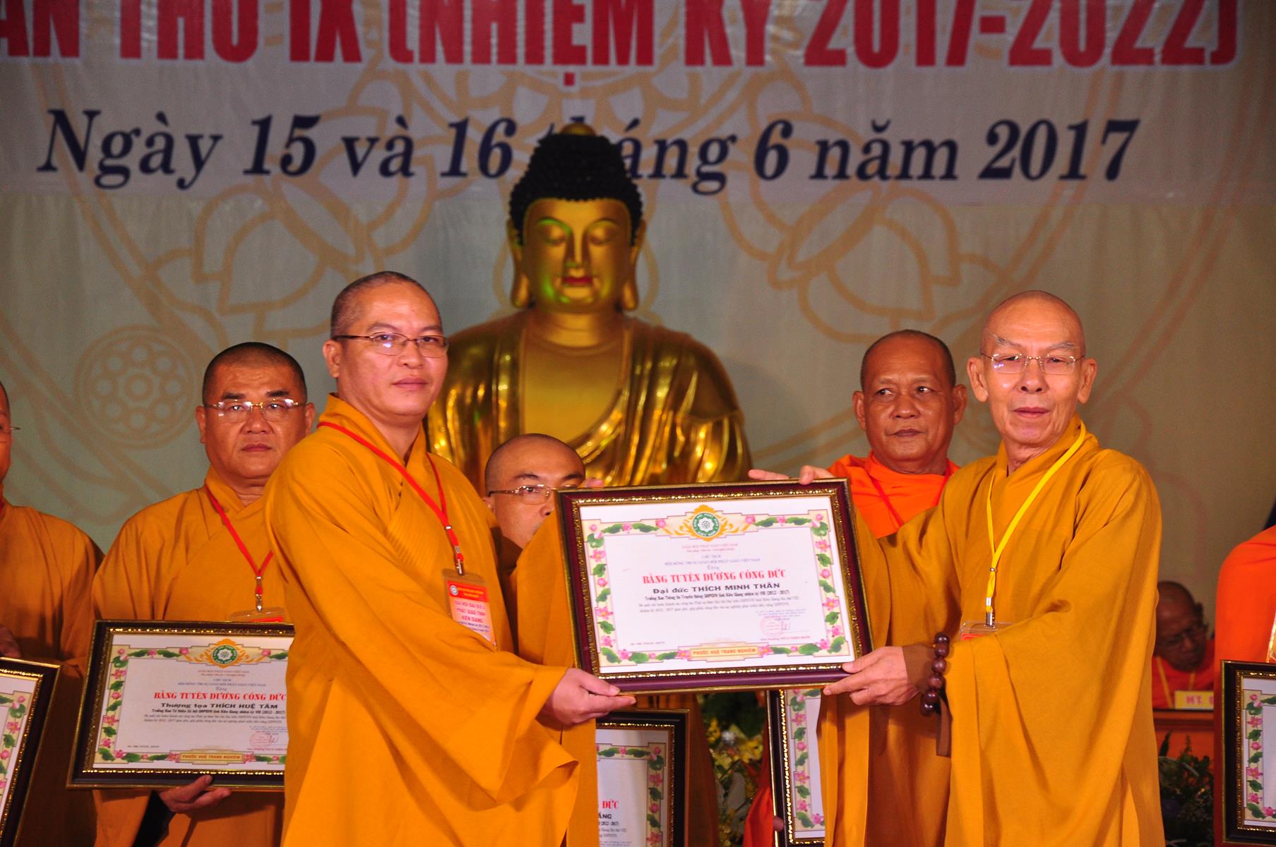 Tại Đại hội, Thường trực HĐTS quyết định tặng Bằng Tuyên Dương Công Đức cho 13 tập thể và 35 cá nhân xuất sắc trong hoạt động Phật sự nhiệm kỳ qua; Đồng thời, TT HĐTS tặng bằng Tuyên Dương Công Đức cho Ủy ban MTTQVN tỉnh Kiên Giang.