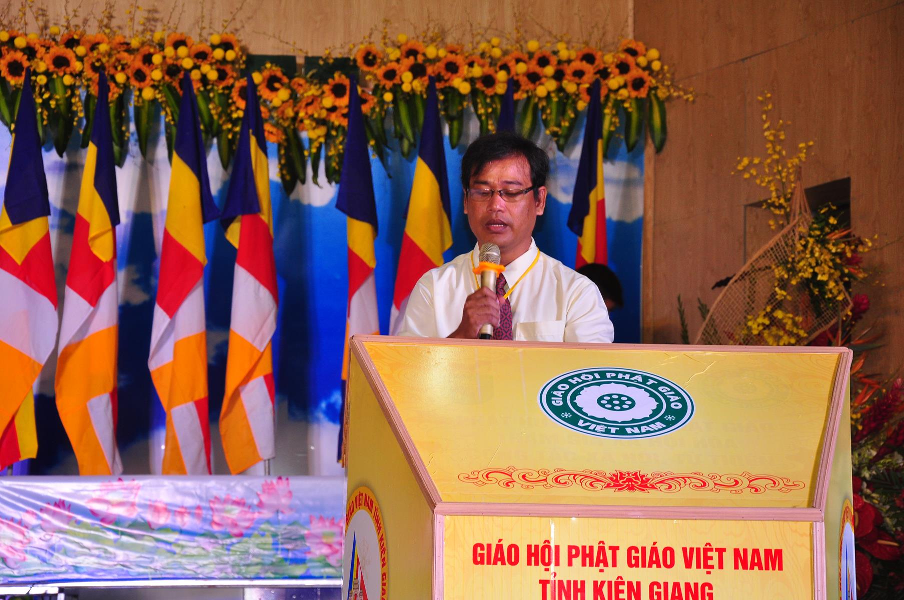 Ông Mai Văn Huỳnh: Phó Chủ tịch UBND tỉnh phát biểu chúc mừng Đại hội. Ông đánh giá cao sự đóng góp của Phật giáo Kiên Giang vào công cuộc xây dựng và bảo vệ tổ quốc, luôn đồng hành, gắn bó cùng dân tộc. Ông khẳng định sau hơn 40 độc lập, thống nhất, Tăng Ni Phật tử tỉnh Kiên Giang đã tiếp tục dấn thân vào vận mệnh mới của Đất nước, tích cực hưởng ứng nhiều phong trào thi đua yêu nước, nhiều cuộc vận động, do Đảng, Nhà nước, Mặt trận và các đoàn thể các cấp phát động, đặc biệt là hoạt động từ thiện, an sinh xã hội, về bảo vệ khí hậu, bảo vệ môi trường, đoàn kết tôn giáo. Trong nhiệm kỳ qua, có 55 vị Tăng Ni tham gia Đại biểu HĐND, 28 vị là ủy viên MTTQVN các cấp. Ông hy vọng nhiệm kỳ sau, Ban Trị sự tiếp tục phát huy hơn nữa để góp phần xây dựng quê hương Đất nước ngày càng văn minh, giàu đẹp.