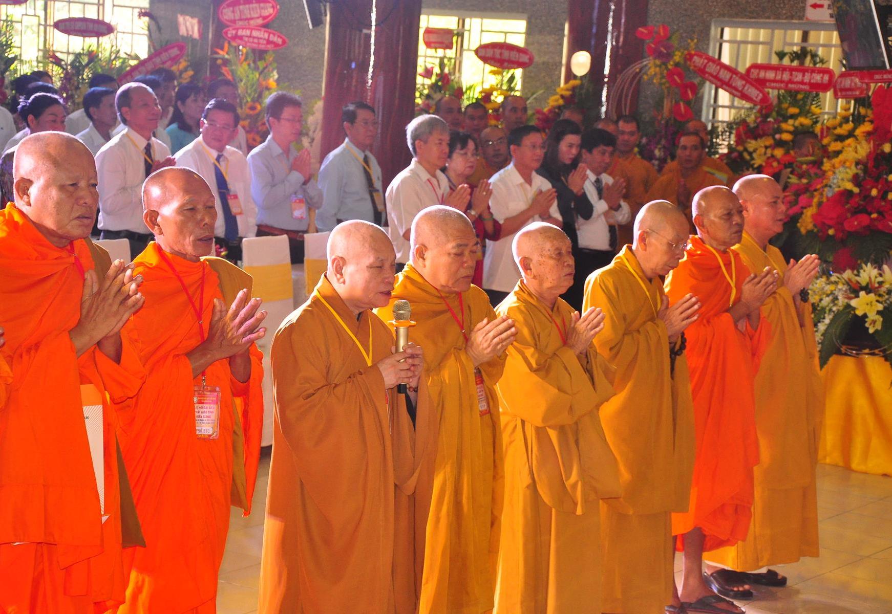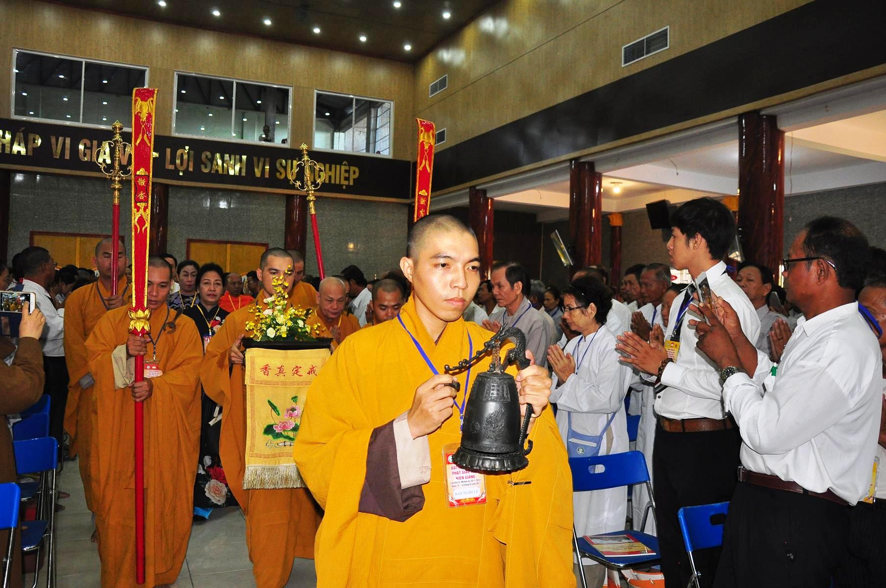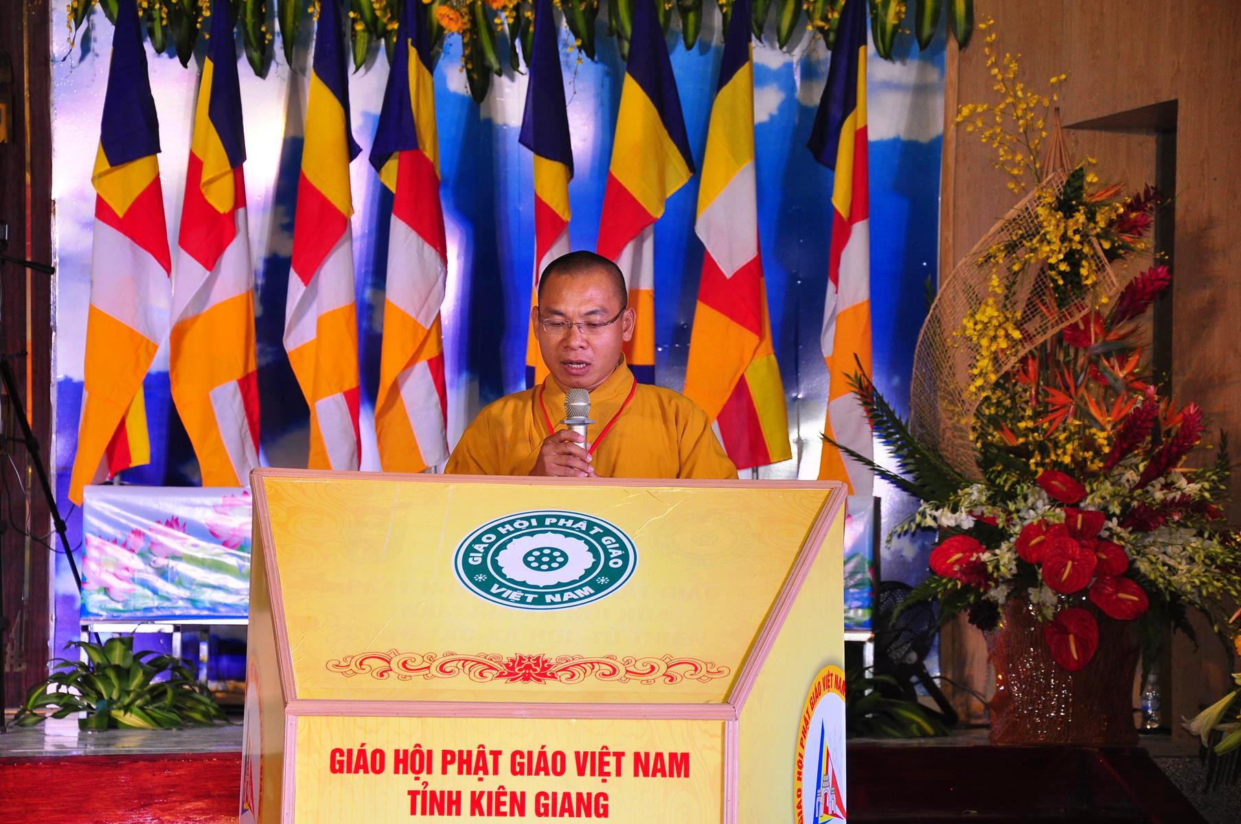Sau nghi thức niệm Phật cầu gia bị, chào quốc kỳ và đạo kỳ; tuyên bố lý do, giới thiệu thành phần tham dự, HT Thích Huyền Thông: UV HĐTS, Phó Trưởng ban Thường trực BTS GHPGVN tỉnh Kiên Giang phát biểu khai mạc. Hòa thượng cho biết: “Trong 05 năm qua, Phật giáo tỉnh nhà cơ bản đã hoàn thành nhiệm vụ được giao phó, nhiều Phật sự đã thành tựu viên mãn. Để phát huy những kết quả đạt được và khắc phục những Phật sự còn tồn đọng trong nhiệm kỳ qua, Phật giáo Kiên Giang cần có một Ban Trị sự mới với những thành viên có đầy đủ uy tín, đạo đức, kinh nghiệm, năng lực và trình độ để có thể hoạch định phương hướng hoạt động Phật sự vừa phù hợp với giáo lý đạo Phật, hiến chương GHPGVN, phát luật Nhà nước, nhất là sự chỉ đạo nhất quán của TWGH, vừa đáp ứng nhu cầu và nguyện vọng của các hệ phái thành viên của Giáo hội, của Tăng Ni Phật tử các tự viện”.