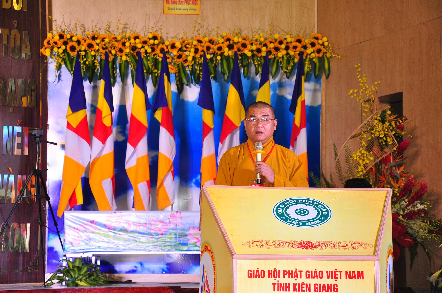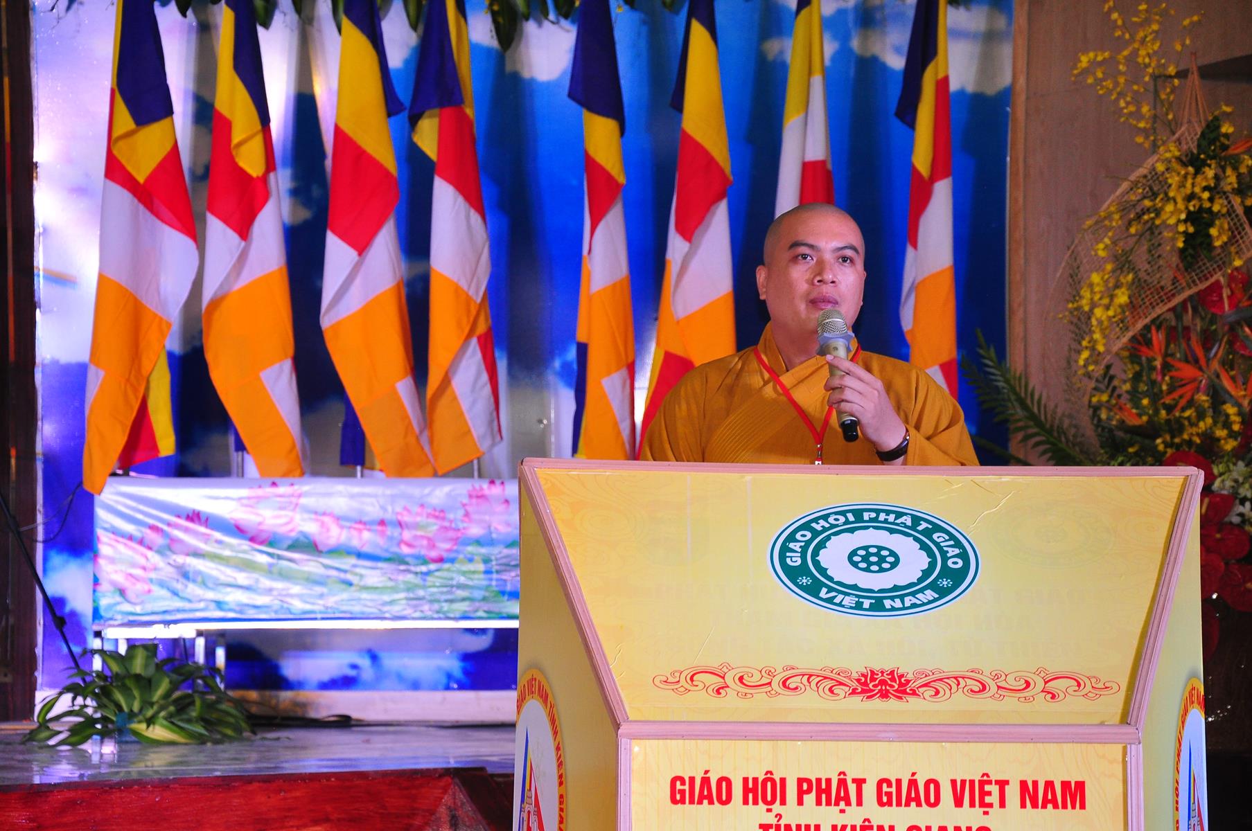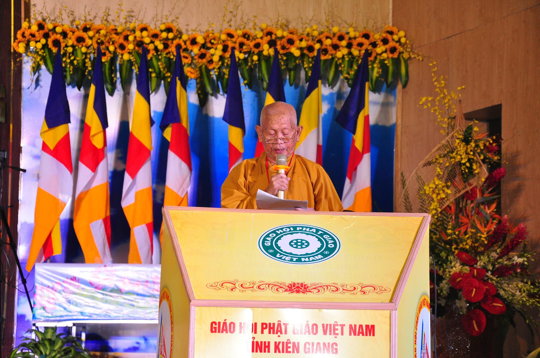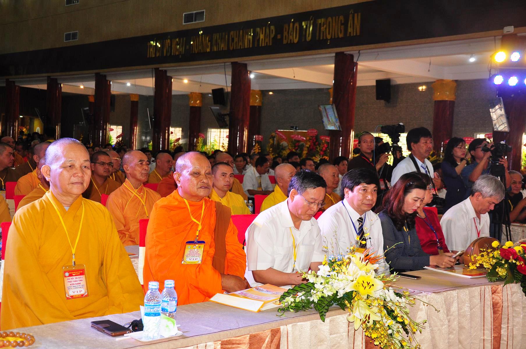 Sau nghi thức niệm Phật cầu gia bị, chào quốc kỳ và đạo kỳ; tuyên bố lý do, giới thiệu thành phần tham dự, HT Thích Huyền Thông: UV HĐTS, Phó Trưởng ban Thường trực BTS GHPGVN tỉnh Kiên Giang phát biểu khai mạc. Hòa thượng cho biết: “Trong 05 năm qua, Phật giáo tỉnh nhà cơ bản đã hoàn thành nhiệm vụ được giao phó, nhiều Phật sự đã thành tựu viên mãn. Để phát huy những kết quả đạt được và khắc phục những Phật sự còn tồn đọng trong nhiệm kỳ qua, Phật giáo Kiên Giang cần có một Ban Trị sự mới với những thành viên có đầy đủ uy tín, đạo đức, kinh nghiệm, năng lực và trình độ để có thể hoạch định phương hướng hoạt động Phật sự vừa phù hợp với giáo lý đạo Phật, hiến chương GHPGVN, phát luật Nhà nước, nhất là sự chỉ đạo nhất quán của TWGH, vừa đáp ứng nhu cầu và nguyện vọng của các hệ phái thành viên của Giáo hội, của Tăng Ni Phật tử các tự viện”.