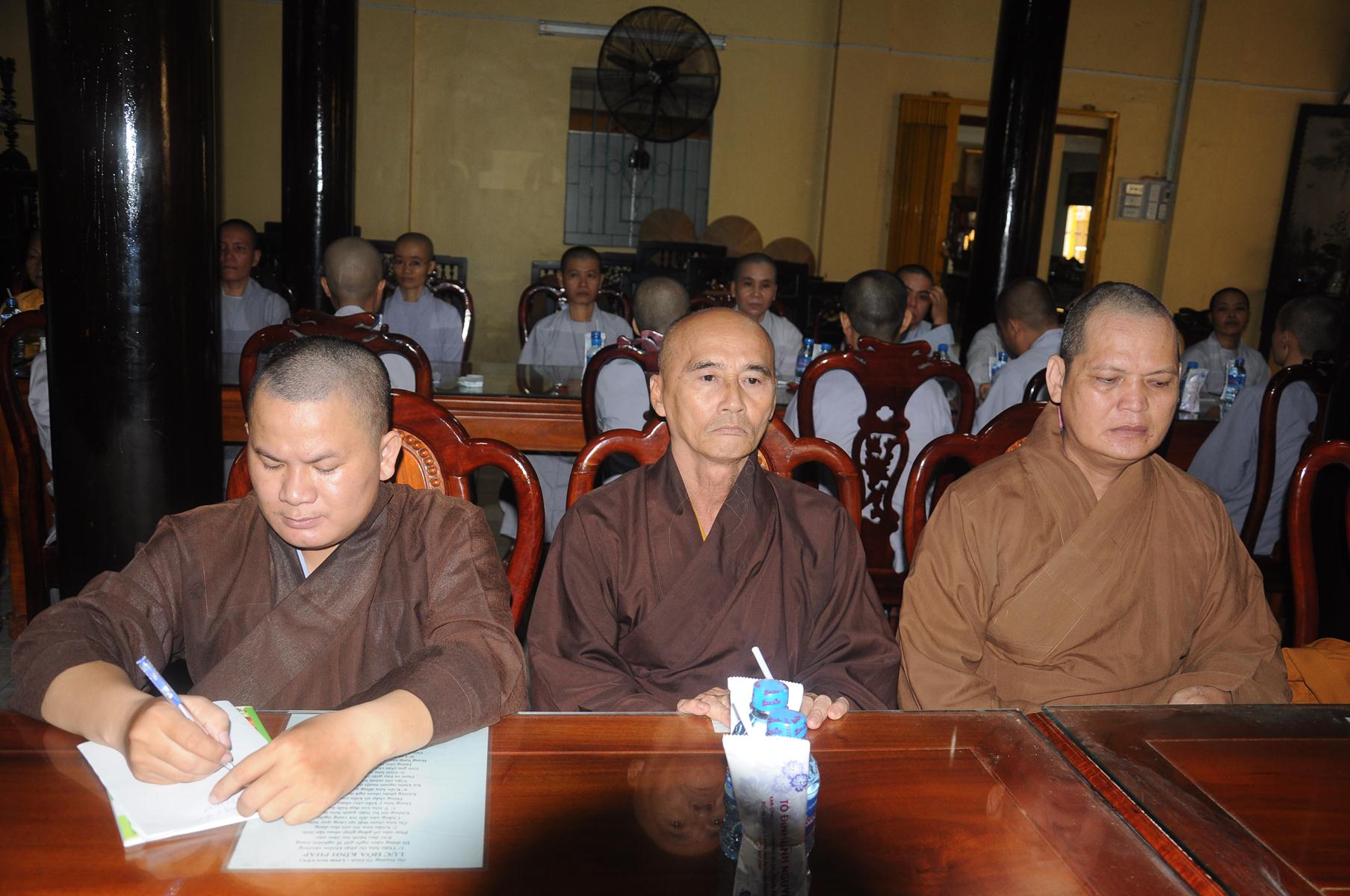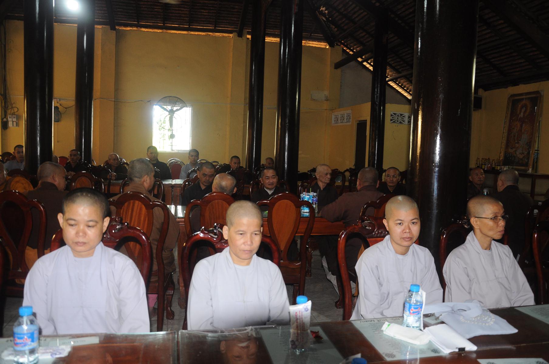 - Phật giáo liên huyện có nhiều Tăng Ni được đào tạo tại “trường lớp”, nhiều cơ sở tự viện, tuy nhiên vì một số nguyên nhân chủ quan, khách quan mà nhiều cơ sở tự viện chưa được cấp quyền sử dụng đất và chưa được bổ nhiệm trụ trì. Hòa thượng khẳng định sẽ phối hợp với các cấp lãnh đạo chánh quyền, sở Tài nguyên Môi trường giải quyết cấp quyền sử dụng đất cho các cơ sở tự viện còn lại. Đồng thời, hòa thượng khuyến khích Tăng Ni theo học Khóa VI (2017-2019) lớp Sơ cấp Phật học sẽ được khai giảng tại chùa Pháp Minh vào ngày 12/8/Đinh Dậu, Trung cấp Phật học và các khóa Bồi dưỡng trụ trì. Bởi vì đây là cơ sở để BTS tỉnh Bổ nhiệm Trụ trì.