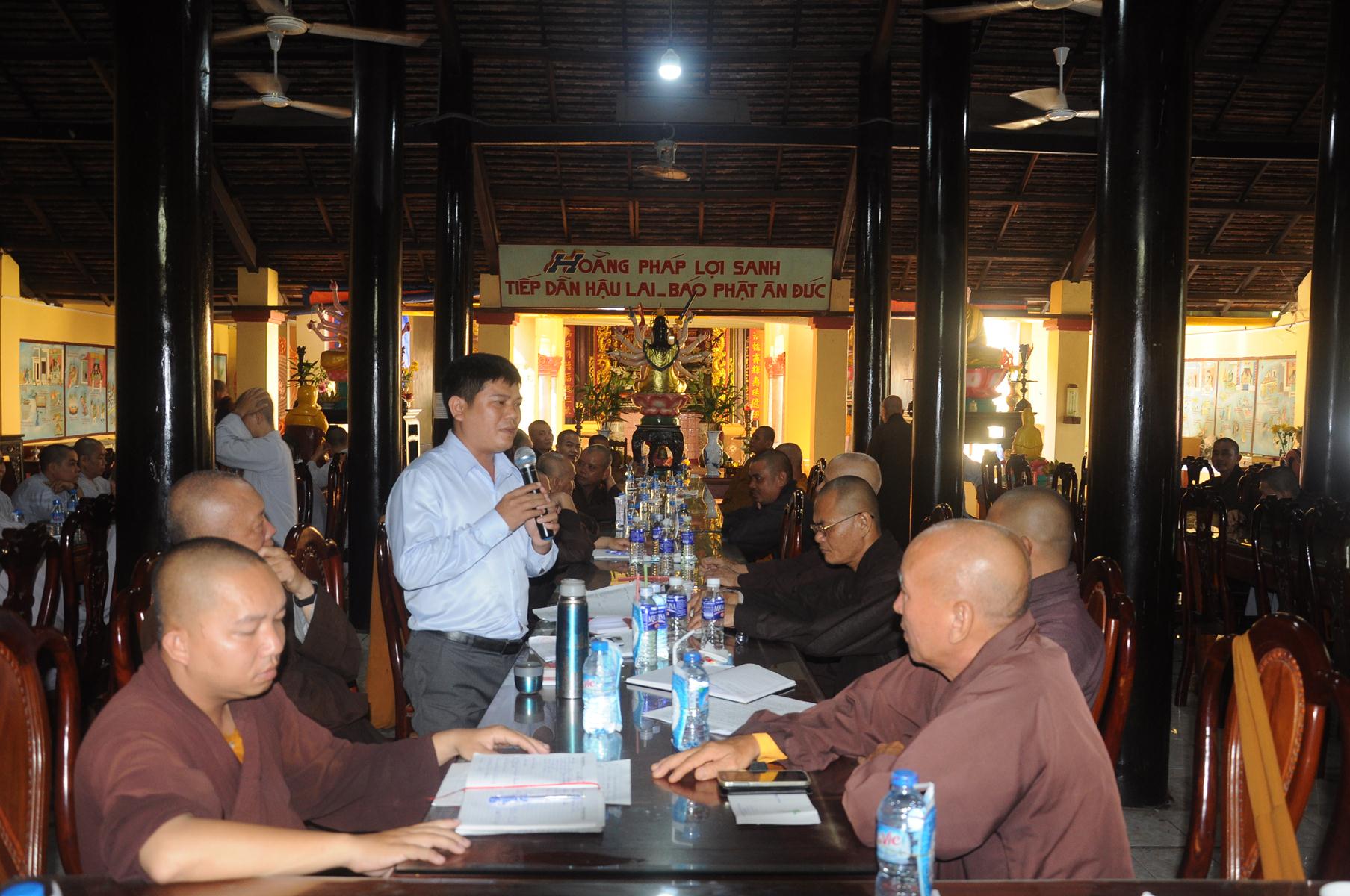 Tiếp theo, Đạo hữu Lệ Kiệt cung cấp cho Chư Tôn đức về số lượng cơ sở tự viện, số lượng Tăng Ni trên toàn tỉnh. Riêng tại địa bàn huyện Đức Hòa, Đức Huệ còn nhiều cơ sở tự viện chưa được cấp quyền sử dụng đất và chưa bổ nhiệm trụ trì.