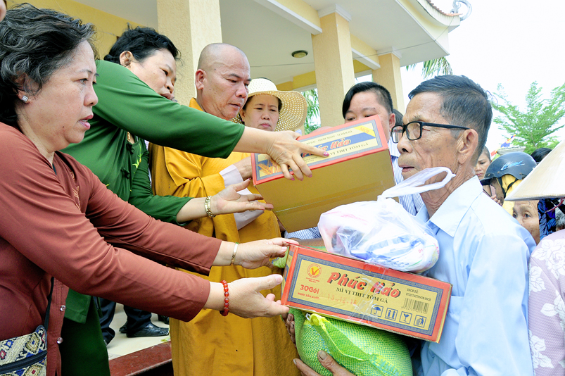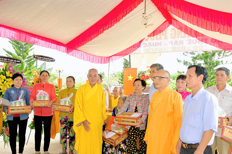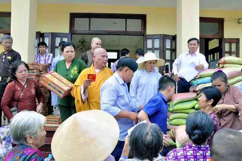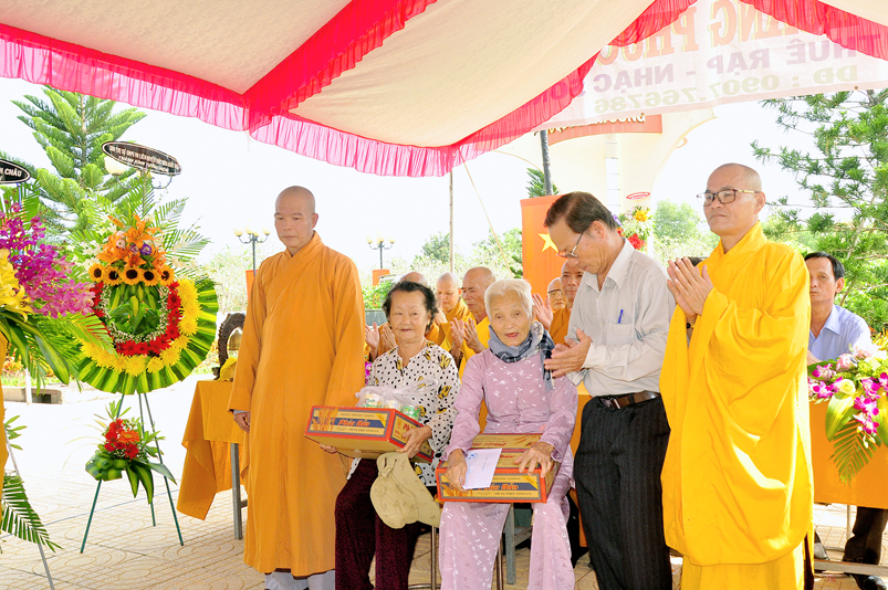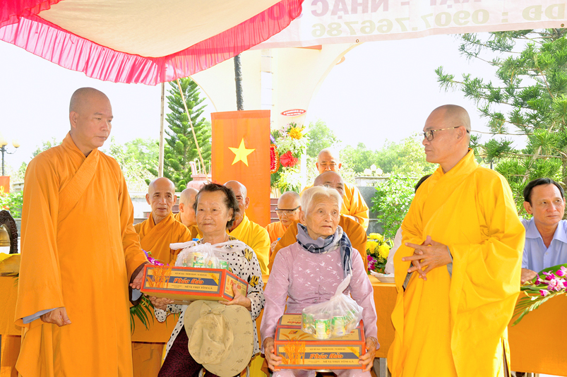 Long trọng và thấm tình đạo vị hơn khi được Đại đức Thích Thiện An – Trưởng ban Pháp chế BTS GHPGVN liên huyện Đức Hòa – Đức Huệ, Phó Ban tổ chức đã hướng dẫn Phật tử, mạnh thường quân xa gần hỗ trợ, phát 320 phần quà cho gia đình các mẹ VNAH, gia đình chính sách của liệt sĩ, các gia đình hoàn cảnh khó khăn. Tổng trị giá là 130 triệu đồng.
