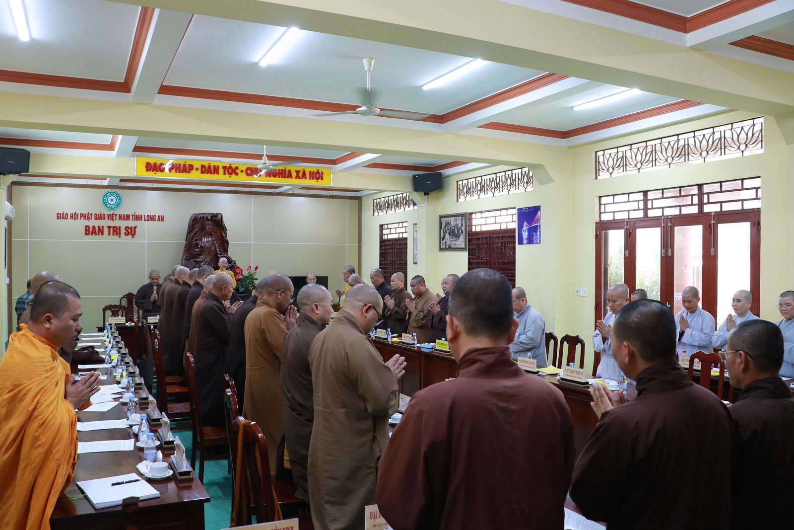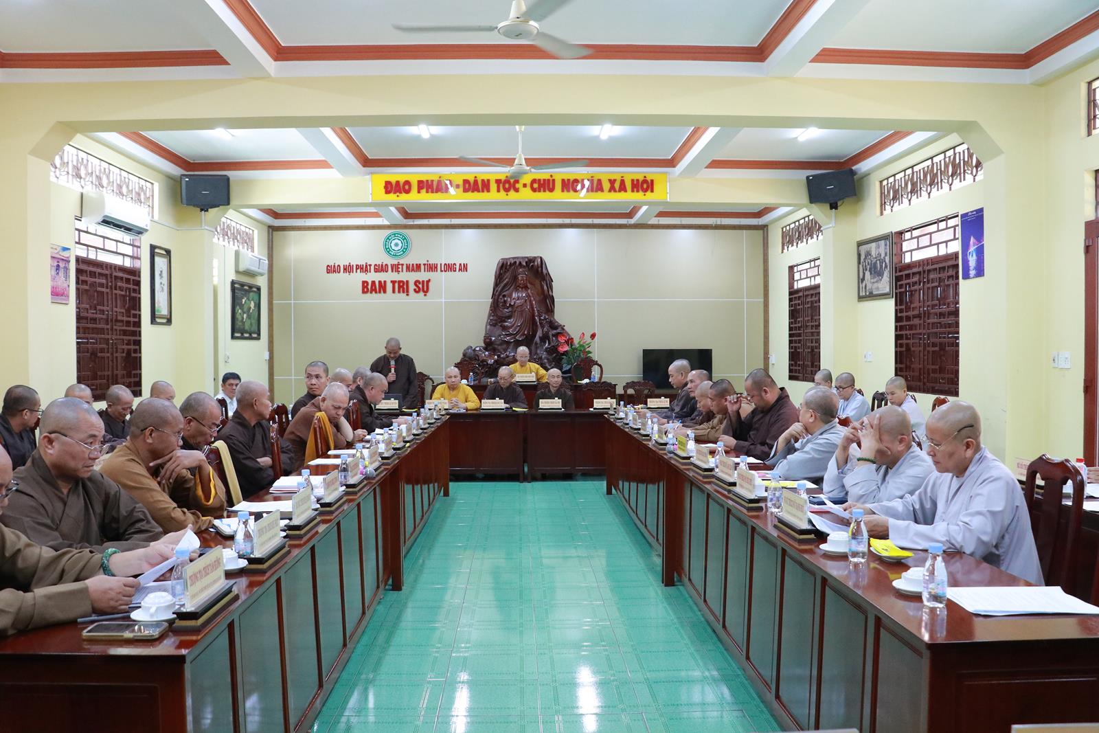 Mở đầu phiên họp, ĐĐ. Thích Lệ Duyên – Phó ban kiêm Chánh Thư ký BTS GHPGVN tỉnh đã tuyên bố lý do, giới thiệu thành phần tham dự, thông qua chương trình làm việc. Sau đó, Đại đức đã báo cáo khái quát những Phật sự nổi bậc của tỉnh nhà và các huyện, thị trong tháng qua. Phật giáo tỉnh nhà đã cùng lãnh đạo chính quyền tổ chức lễ công bố điểm nhóm sinh hoạt tôn giáo tập trung Ngọc Viên (huyện Tân Hưng) và Từ Khánh Thiền Lâm (huyện Đức Huệ). Trong đó, các Phật sự nổi bật phải kể đến như cung đón Đức Đệ tứ Pháp Chủ quang lâm lễ húy kỵ tại chùa Linh Nguyên, đón tiếp Ngài Takebe Tsutomu, Cố vấn đặc biệt Liên minh nghị sĩ hữu nghị Nhật – Việt tại chùa Pháp Minh. Công tác an sinh xã hội của Phật giáo toàn tỉnh đạt trên 12.376.170.000 đồng (Mười hai tỷ ba trăm bảy mươi sáu triệu một trăm bảy mươi nghìn đồng).