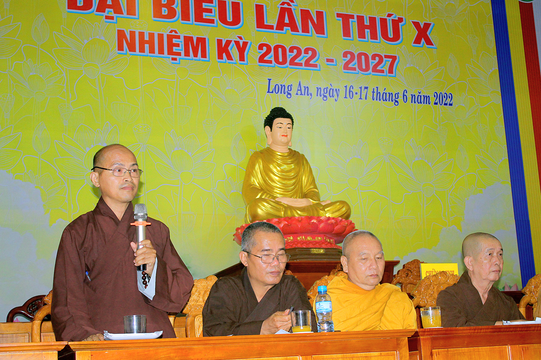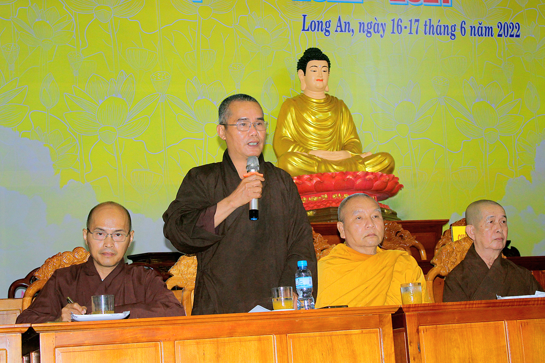 Mở đầu Phiên họp, Đại đức Thích Lệ Duyên – Chánh Thư ký kiêm Trưởng ban Phật giáo Quốc tế tỉnh Long An thay mặt Bộ phận Văn phòng và Thư ký báo cáo các công tác chuẩn bị tổ chức Đại hội và xin ý kiến chỉ đạo của Hòa thượng Trưởng ban và chư Tôn đức hiện tiền để kiện toàn các công tác cho Đại hội Đại biểu Phật giáo tỉnh Long An sẽ diễn ra vào ngày 16-17 tháng 06 năm 2022 (nhằm ngày 18-19/5/Nhâm Dần).