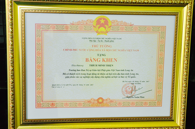 Trước đó, sáng nay, HT. Thích Minh Thiện đã đón nhận bằng khen của thủ tướng chính phủ Nguyễn Xuân Phúc.