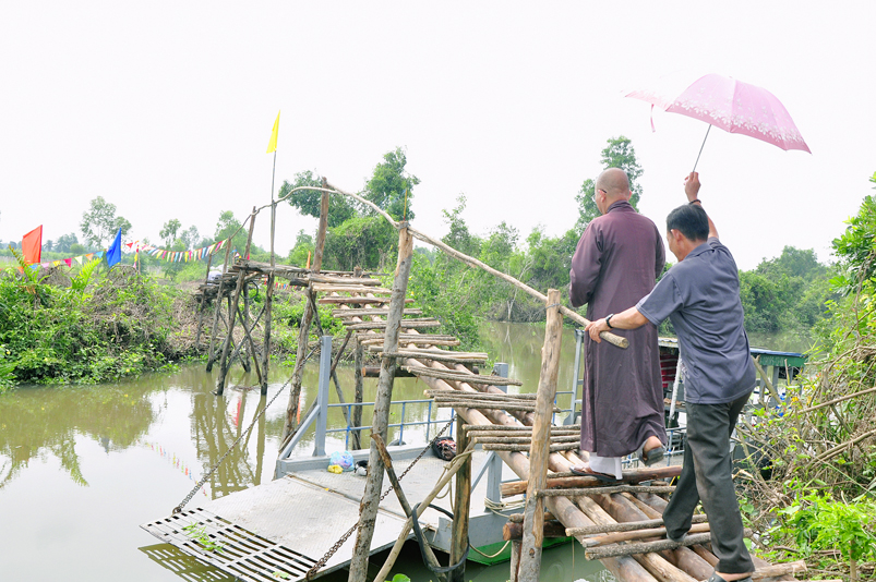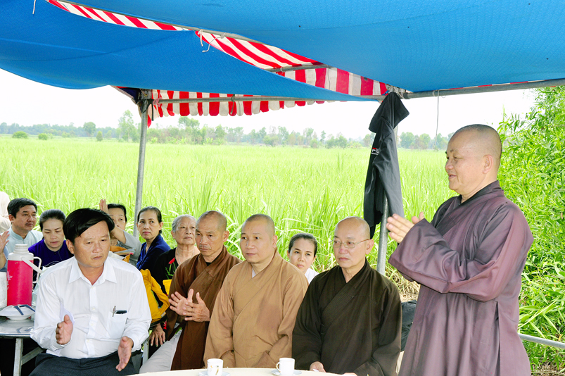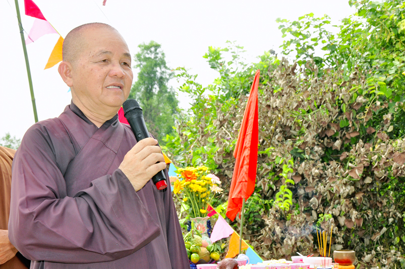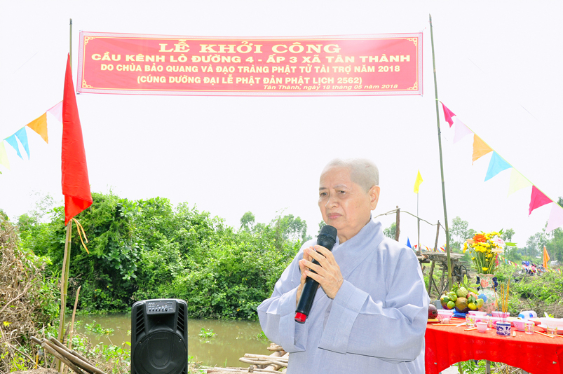 Trong lời phát biểu Hoà thượng chia sẻ “ Chào mừng Đại lễ Phật đản Phật lịch 2562, GHPG Long An đã phát động trong nhiều phong trào, mô hình lập thành tích chào mừng Đại lễ Phật Đản, hiện nay đã có rất nhiều mô hình công trình được thực hiện. Trong đó GHPG khuyến khích thực hiện công trình thể hiện tinh thần ghi ơn, nhớ ơn như: Thắp hương tưởng nhớ các anh hùng liệt sĩ đã hy sinh để bảo vệ đất nước,… thật vô cùng ý nghĩa khi Ni Trưởng Thích Nữ Như Lộc và Đại Chúng cùng Đạo Tràng Phật Tử chùa Bảo Quang, quận Tân Phú -TP HCM tài trợ kinh phí xây dựng cầu kênh Lò Đường 4-ấp 3 xã Tân Thành nối liền giao thông giữa xã Tân Thành huyện Thủ Thừa – xã Bình Đức, xã Tân Hòa của huyện Bến Lức. Đây là 3 xã thời gian qua là vùng kháng chiến, chiến tranh đã để lại nhiều mất mát hy sinh đối với bà con nhân dân nơi đây. Cầu Lò Đường ấp 4 ngoài mang ý nghĩa đền ơn còn thể hiện tinh thần phụng sự chúng sinh của Đạo Tràng Phật Tử. Giáo hội PGVN tỉnh Long An rất vui mừng đón tiếp và cảm ơn Ni Trưởng Thích Nữ Như Lộc và Đại Chúng cùng Đạo Tràng Phật Tử chùa Bảo Quang, quận Tân Phú -TP HCM đã không ngại đường sá xa xôi về địa phương để giúp đỡ dân nghèo.