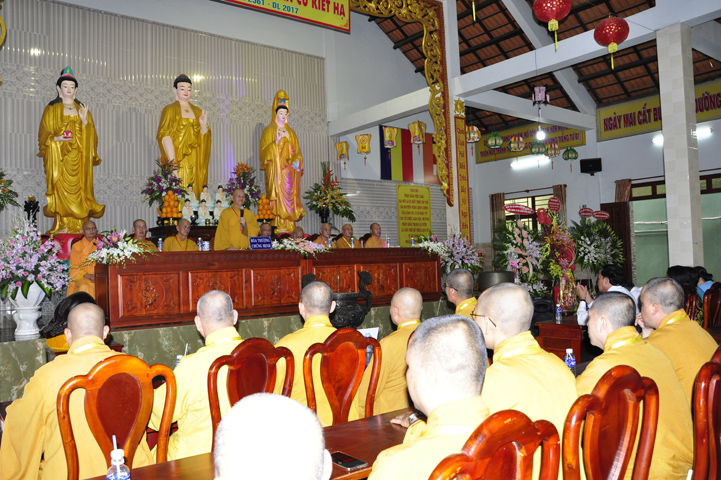 Buổi lễ còn được Hoà thượng Thích Minh Thiện: Uỷ viên trực Hội Đồng Trị sự Trung ương, Phó ban Hoằng pháp kiêm Trưởng giảng sư đoàn Trung ương giáo hội Phật giáo Việt Nam, Trưởng ban Trị sự Giáo hội Phật giáo Việt Nam tỉnh Long An đạo từ. Hòa thượng khi khen ngợi hành giả an cư và nhắn nhủ Tăng Ni phát huy vai trò “ Hộ quốc an dân” từ khi Phật giáo mới du nhập và mãi mãi về sau. Hòa thượng nhắc đại chúng về tôn chỉ hoạt động của Trung ương giáo hội “ Trí tuệ – Kỷ cương – Hội nhập – Phát triển” mong rằng Tăng Ni sau khi mãn hạ về trú xứ của mình tu và học trên tinh thần ấy.