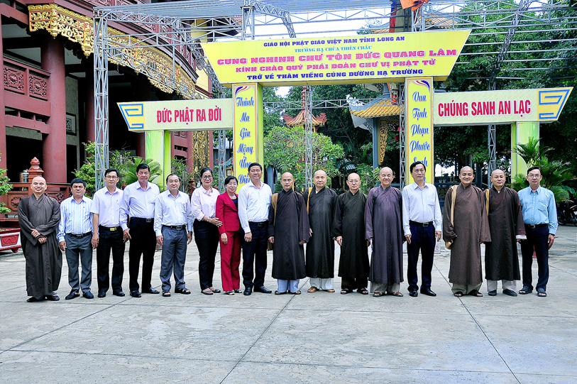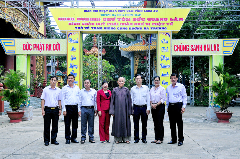 Tiếp đoàn có: HT.Thích Minh Thiện – Ủy viên HĐTS, Phó Trưởng Ban Hoằng pháp TW, Trưởng Ban Trị sự Phật giáo tỉnh Long An; TT. Thích Quảng Tâm – Ủy viên HĐTS, Phó Thường trực Ban Trị sự Phật giáo tỉnh Long An; Đại đức Thích Đức Hoàng – Phó Trưởng Ban Trị sự GHPGVN tỉnh Long An;  ĐĐ. Thích Lệ Trí – Ủy viên HĐTS, Phó Trưởng ban kiêm Trưởng Ban Giáo dục Phật giáo tỉnh Long An; Đại đức Thích Lệ Duyên – Chánh thư ký BTS Phật giáo Long An; cùng chư tôn đức Tăng thường trực BTS Phật giáo tỉnh Long An.