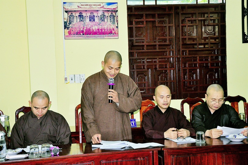 Tiếp đến, Đại đức Thích Lệ Duyên – Chánh thư ký BTS Phật giáo Long An có sự báo cáo tổng quát thành tựu Phật sự của các ban ngành trực thuộc Ban Trị sự GHPGVN tỉnh Long An từ ngày thành lập đến nay như: Ban Trị sự GHPGVN tỉnh Long An được thành lập vào ngày 16 tháng 12 năm 1983, đến nay đã trải qua 9 nhiệm kỳ; có ó 314 cơ sở tự viện (01 Tổ đình; 267 Chùa; 16 Tịnh xá; 27 Tịnh thất; 02 Thiền viện và 01 Tu viện); Tăng Ni có 1.534 vị; Trường Trung Cấp Phật Học Long An được thành lập vào năm 1992, hiện nay đang đào tạo Trung cấp khóa VII và đã có có 809 Tăng Ni  tốt nghiệp; về an sinh xã hội tổng trị giá hoạt động từ thiện của Phật giáo Long An qua 9 nhiệm kỳ ước đạt trên 600 tỷ đồng Việt Nam. Đặc biệt, năm 2012, được sự cho phép của Sở giáo dục đào tạo tỉnh, Phật giáo Long An đã thành lập Trường Tư thục Bồ đề Phương Duy tại chùa Long Thạnh, huyện Thủ Thừa, tỉnh Long An do thượng tọa Thích Quảng Tâm-Phó Trưởng ban Thường trực, Trưởng ban Từ thiện Phật giáo Long An trực tiếp điều hành. Trường đào tạo với 3 cấp học: tiểu học, trung học cơ sở và trung học phổ thông cho các em cơ nhở, có hoàn cảnh khó khăn. Có thể nói, đây là ngôi trường tư thục đầu tiên do Phật giáo thành lập trên phạm vi cả nước. Trường nổi tiếng với tiêu chuẩn “ba không”: không học phí, không nhận lương, không trượt tốt nghiệp; Đại đức cũng nêu ra những thực trạng chưa thựa hiện được theo Luật Tín ngưỡng tôn giáo như: Biểu mẫu 162 không có phần cơ quan chủ quản, cơ quan đơn vị và số ký hiệu văn bản; Luật Tín ngưỡng tôn giáo không quy định về trách nhiệm người đứng đầu cơ sở tôn giáo của vị trụ trì; nhiề cá nhân, tổ chức lợi dụng uy tín của GHPGVN tạo dựng, tổ chức trái phép v.v.