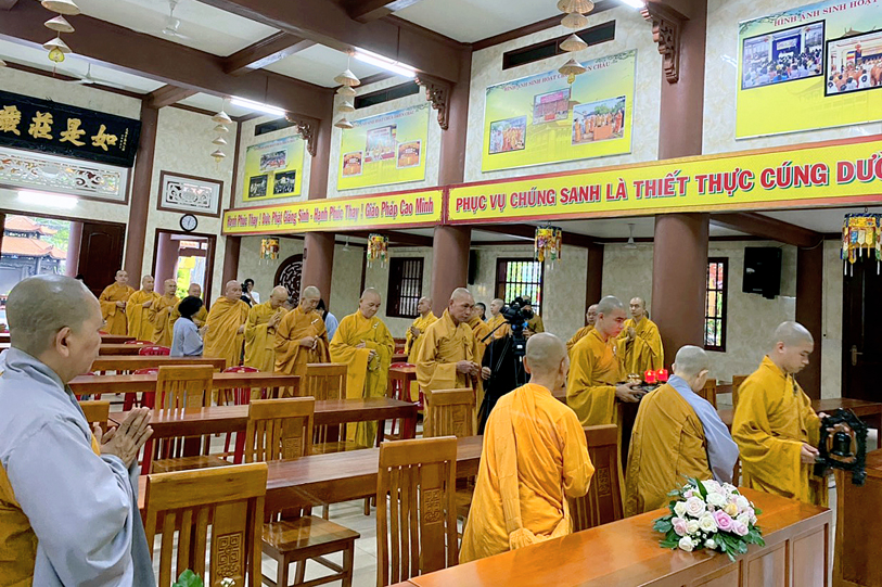 Đúng 6 giờ, chư tôn đức tăng cử ba hồi chuông trống Bát nhã rước lễ Đản sanh. Trong khoảnh khắc thiêng liêng, toàn thể Ban Trị sự và Phật tử chắp tay nguyện cầu bình an.