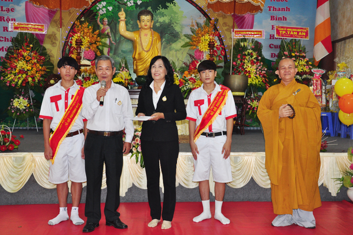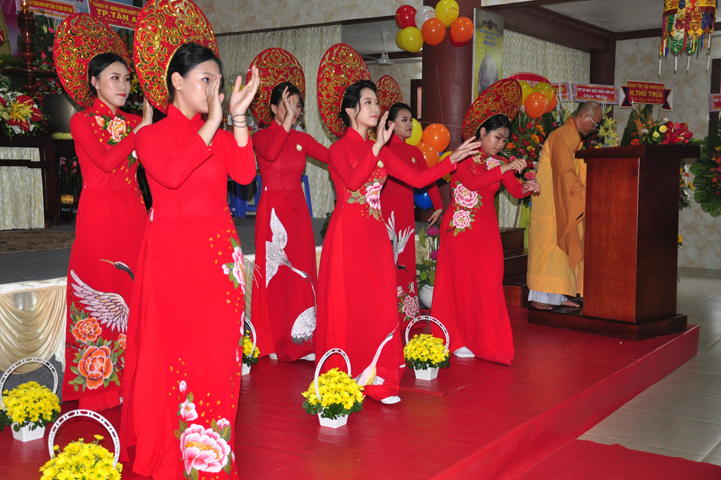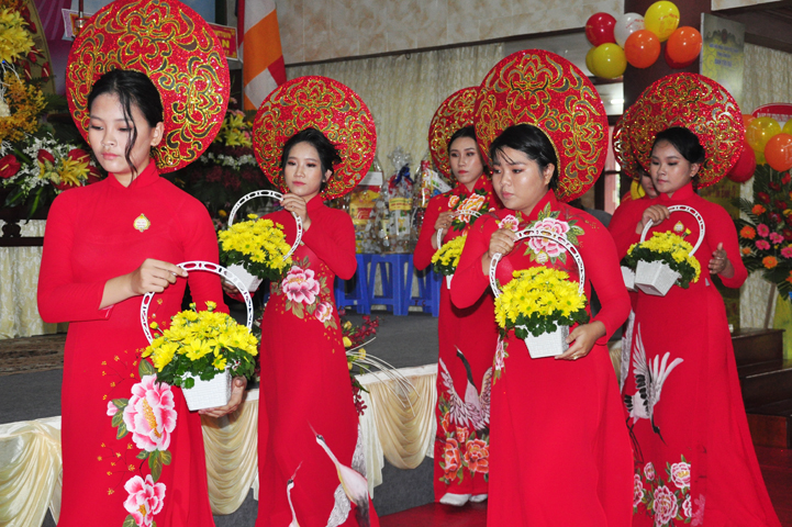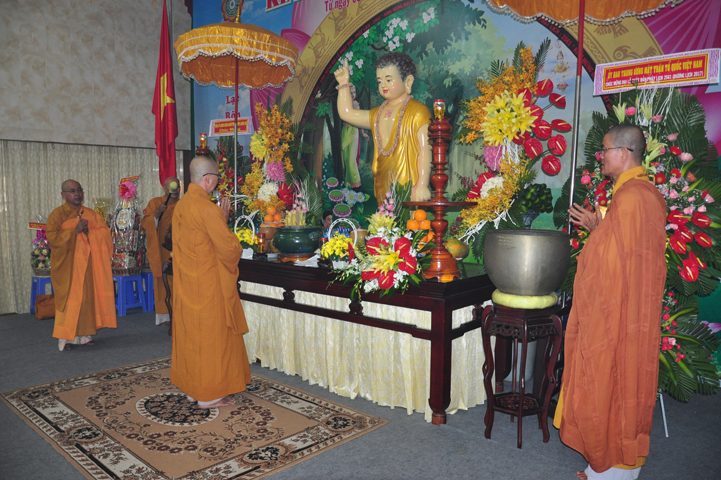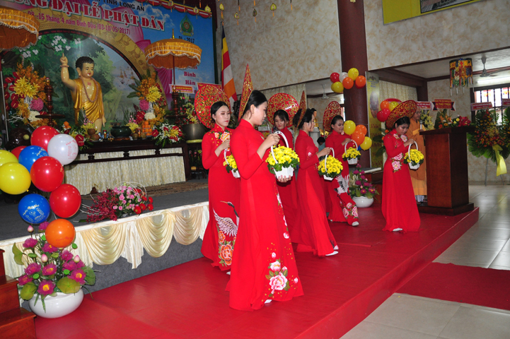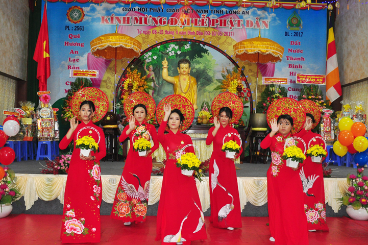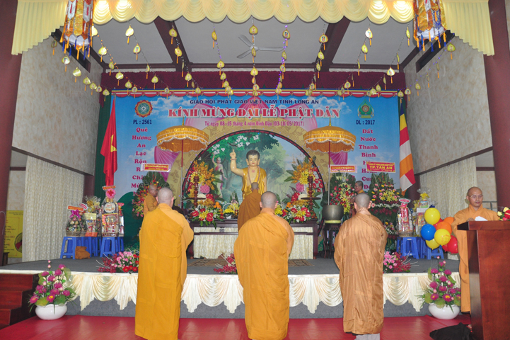 Mở đầu buổi lễ với các nghi thức: niệm Phật cầu gia hộ, chào quốc kỳ, đạo kỳ, một phút nhập từ bi quán tưởng nhớ đến các Thánh tử đạo, Anh hùng chiến sĩ đã hy sinh cho sự nghiệp bảo vệ Tổ quốc. Các nghi thức tiếp diễn hòa trong tiếng trống, kèn oai hùng do các em học sinh Bồ Đề Phương Duy thực hiện; và vô cùng trang trọng với tiết mục dâng hoa cúng dường Phật đản của các em thanh thiếu nữ Phật giáo Long An.