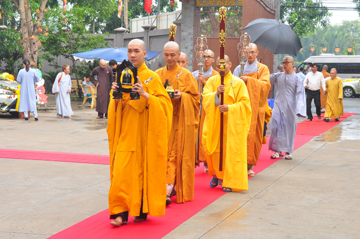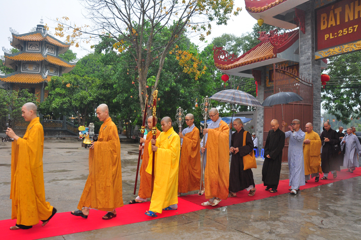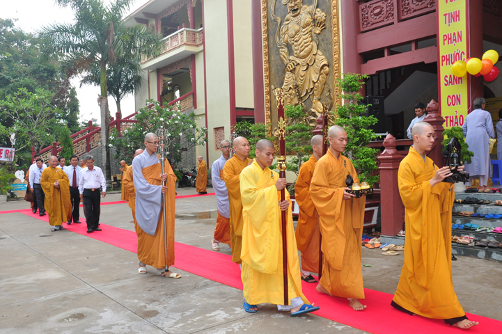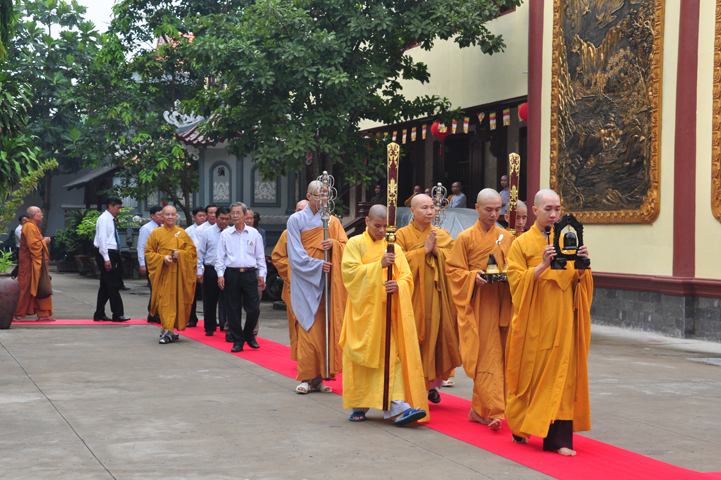 Đúng 8h, Đại lễ chính thức được cử hành. Ban nghi lễ cung đối trước chư tôn đức giáo phẩm tác bạch cung thỉnh quý ngài và quý vị lãnh đạo thân lâm lễ đài.