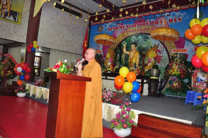 Tiếp theo chương trình Đại lễ, HT. Thích Thiện Huệ- Chứng minh Ban trị sự GHPGVN tỉnh Long An tuyên đọc Thông điệp của Đức Pháp chủ GHPGVN. Nội dung thông điệp nêu rõ cuộc đời, bản nguyện và công hạnh của Đức Thế Tôn từ khi Đản sanh đến ngày xuất gia,Thành đạo. Ngài là bậc cha lành vĩ đại trên thế giới, đưa nhân loại thoát khỏi vòng kiềm tỏa của năm dục lạc thế gian, trở về với tự tính bất sanh bất diệt của chính mình. Qua đó, Đức Pháp chủ đã ân cần nhắn nhủ chư Tăng Ni, những người con Phật hãy nên chiêm nghiệm và hành trì, sống theo lời Phật dạy “góp phần làm cho tổ chức Giáo hội Phật giáo Việt Nam không ngừng lớn mạnh để Giáo hội hoàn thành sứ mệnh trong bối cảnh đất nước ta đang trong quá trình đổi mới, xu hướng hội nhập và hợp tác quốc tế sâu rộng của thời đại”.