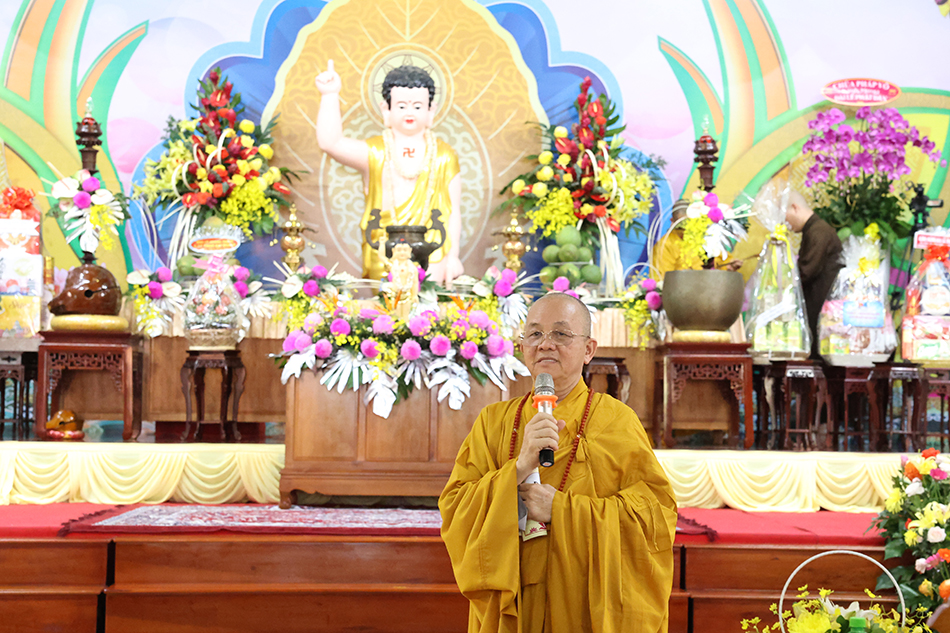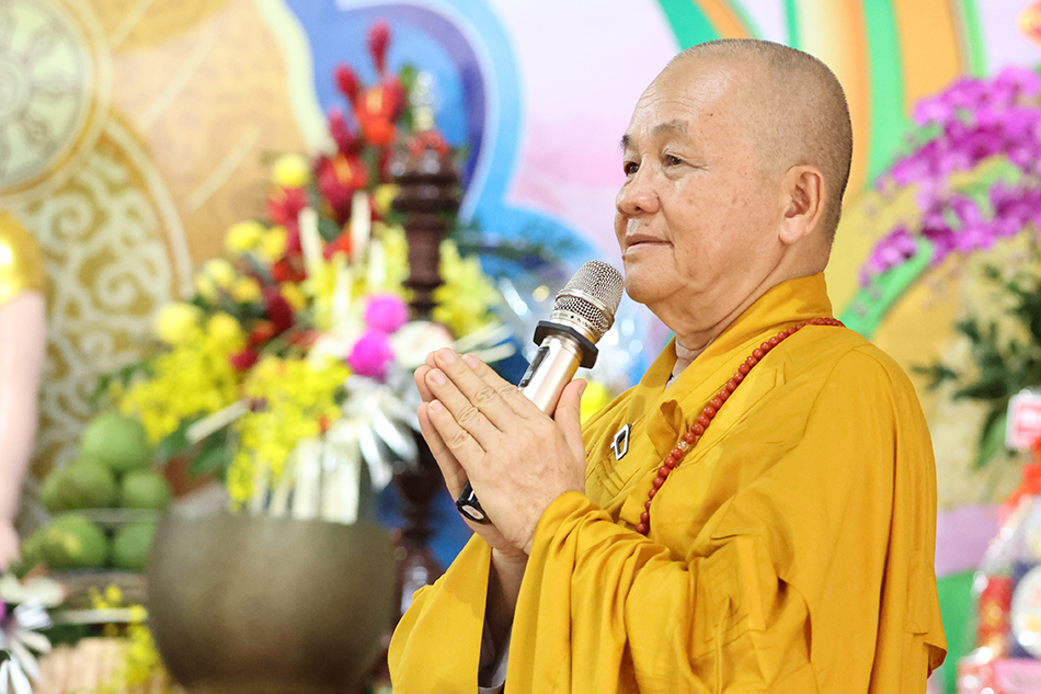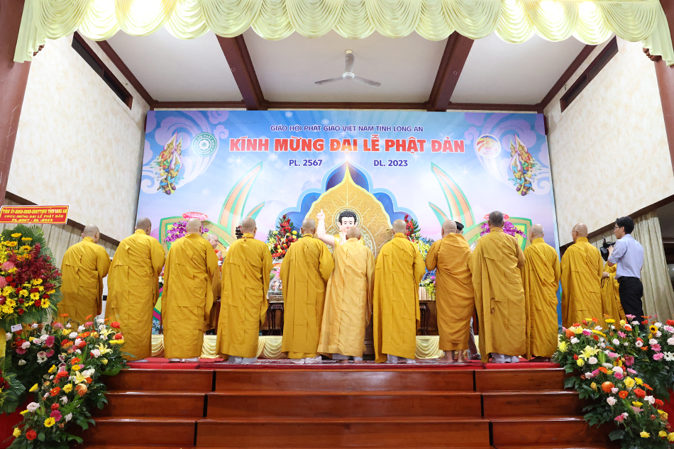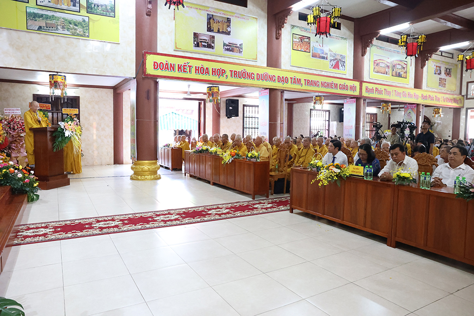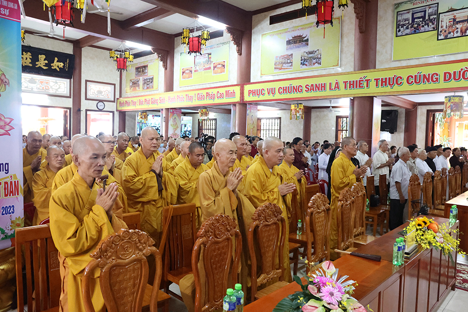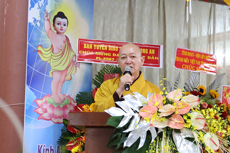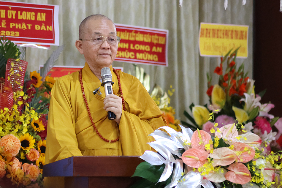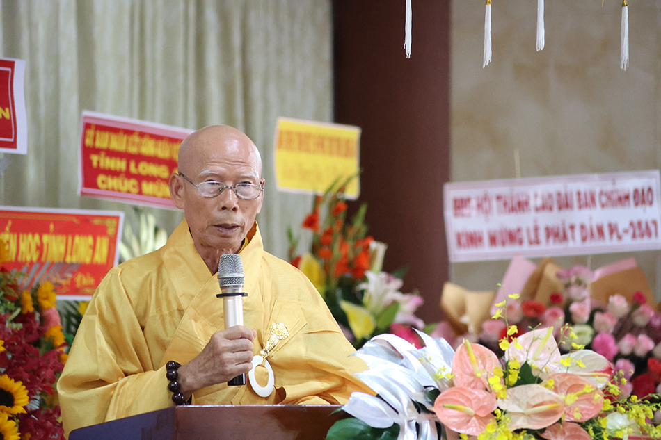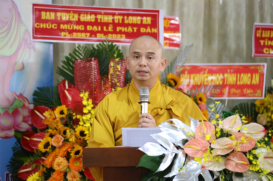 Hòa thượng Thích Minh Thiện – Ủy viên Hội đồng Trị sự GHPGVN, Phó Trưởng ban Hoằng pháp Trung ương, Trưởng ban Trị sự Giáo hội Phật giáo Việt Nam tỉnh Long An tuyên đọc Diễn văn Phật đản PL.2567 của Hòa thượng Chủ tịch Hội đồng Trị sự GHPGVN. “Hơn lúc nào hết, những lời dạy vô giá về tình thương yêu, sự sẻ chia, lòng từ bi, tinh thần bất bạo động, con đường giải thoát khổ đau cho nhân loại chúng sinh của Đức Phật Thích Ca Mâu Ni thực sự là kim chỉ nam đưa đến các giải pháp cho những vấn đề nan giải của con người”, diễn văn Phật đản của Hòa thượng Chủ tịch Hội đồng Trị sự nhấn nhủ đến Tăng Ni, Phật tử.