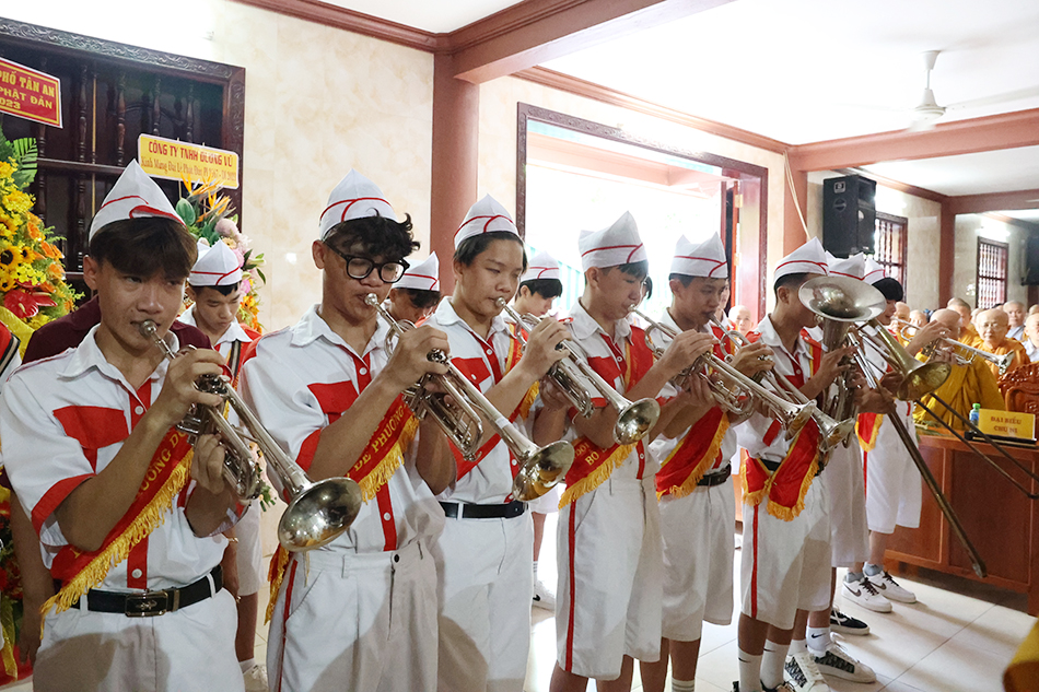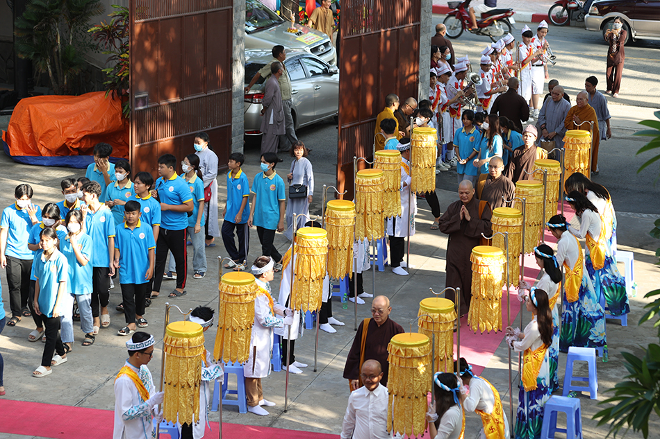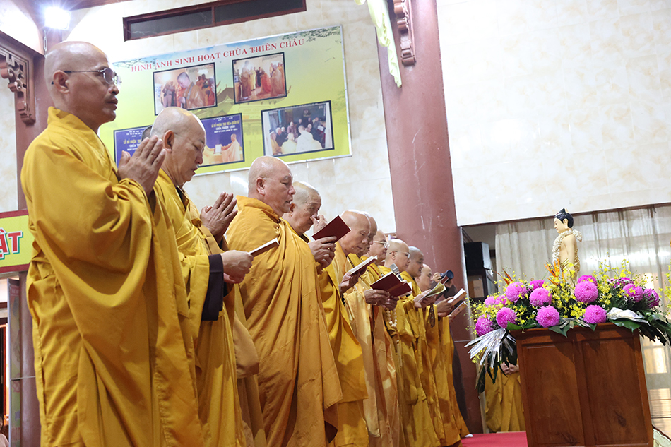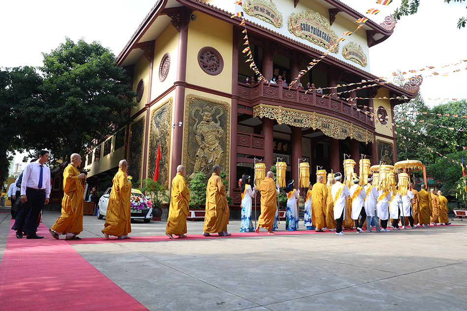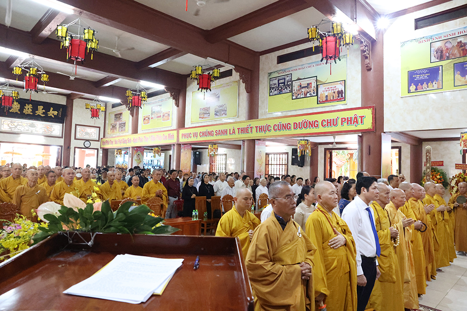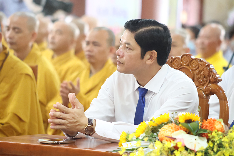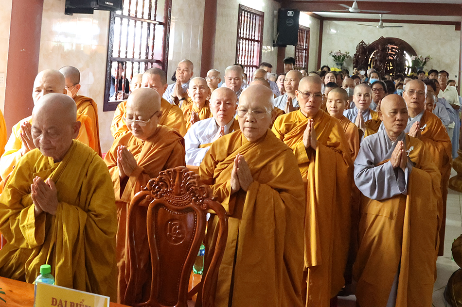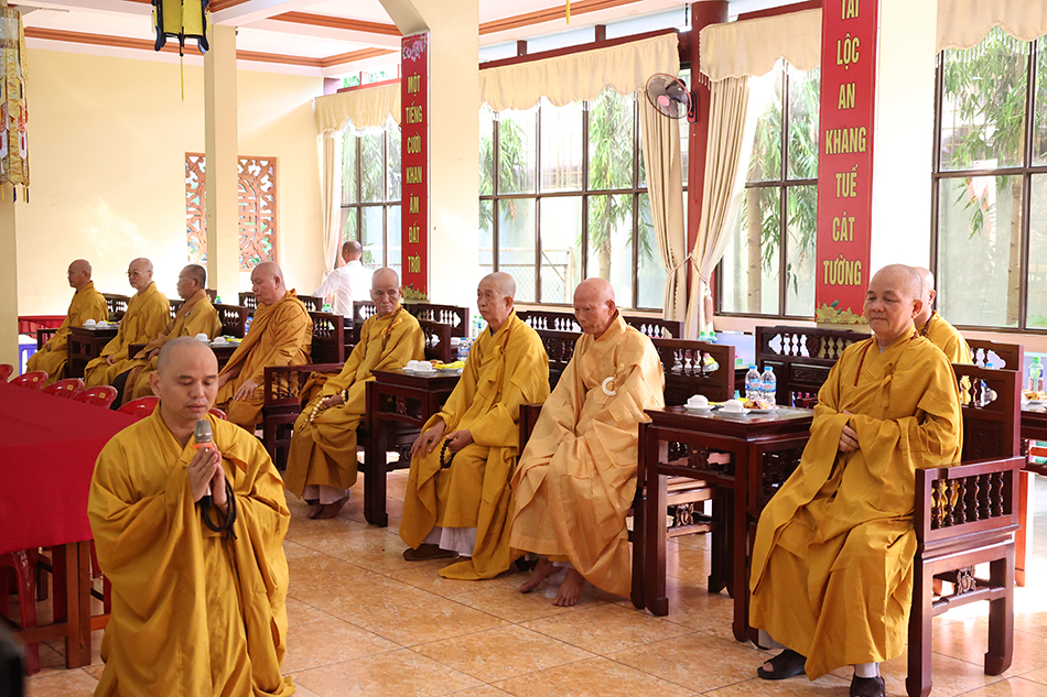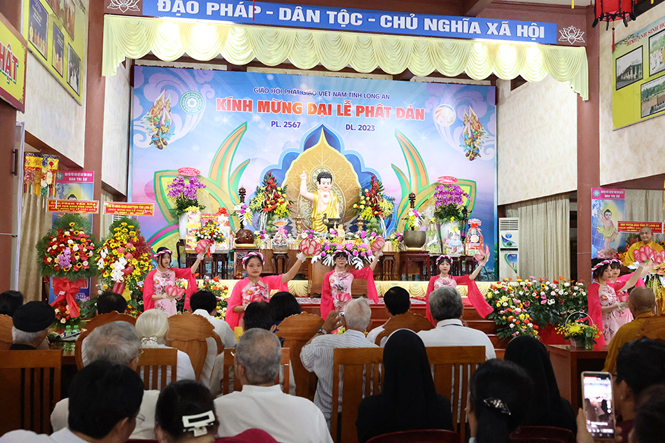 Hòa thượng Thích Minh Thiện – Ủy viên Hội đồng Trị sự GHPGVN, Phó Trưởng ban Hoằng pháp Trung ương, Trưởng ban Trị sự Giáo hội Phật giáo Việt Nam tỉnh Long An tuyên đọc Diễn văn Phật đản PL.2567 của Hòa thượng Chủ tịch Hội đồng Trị sự GHPGVN. “Hơn lúc nào hết, những lời dạy vô giá về tình thương yêu, sự sẻ chia, lòng từ bi, tinh thần bất bạo động, con đường giải thoát khổ đau cho nhân loại chúng sinh của Đức Phật Thích Ca Mâu Ni thực sự là kim chỉ nam đưa đến các giải pháp cho những vấn đề nan giải của con người”, diễn văn Phật đản của Hòa thượng Chủ tịch Hội đồng Trị sự nhấn nhủ đến Tăng Ni, Phật tử.
