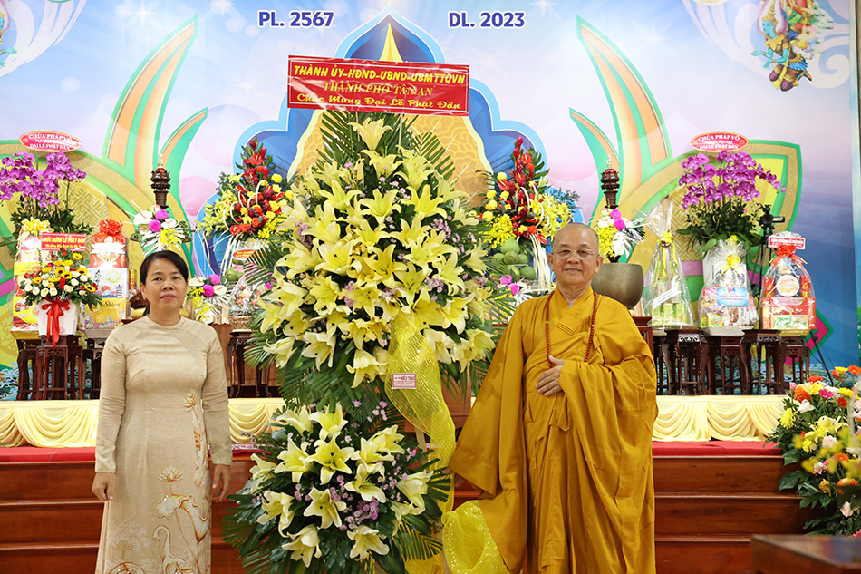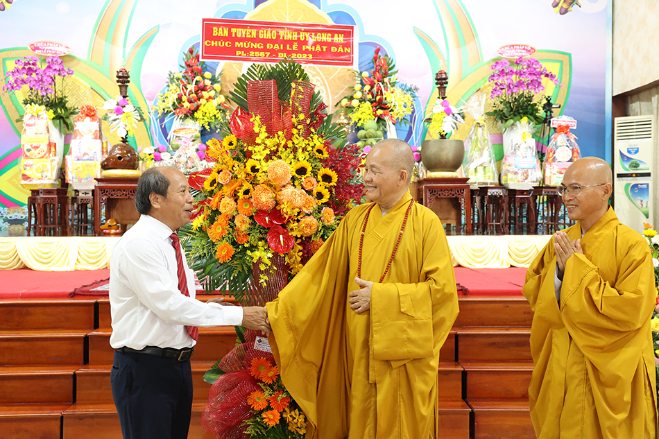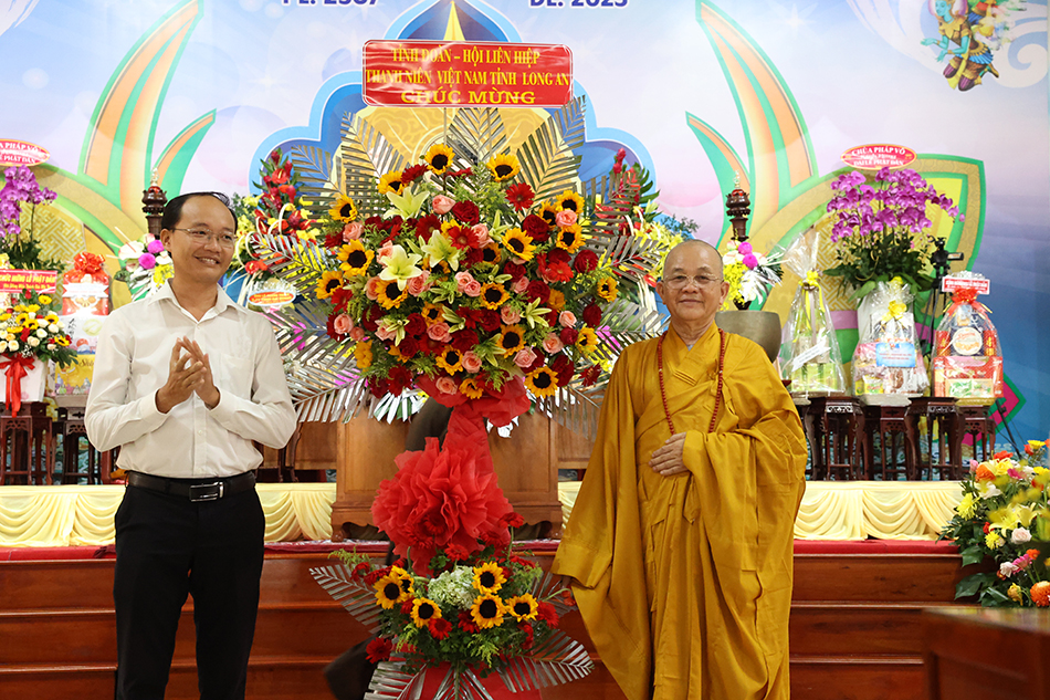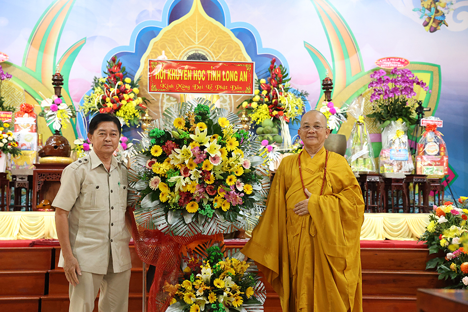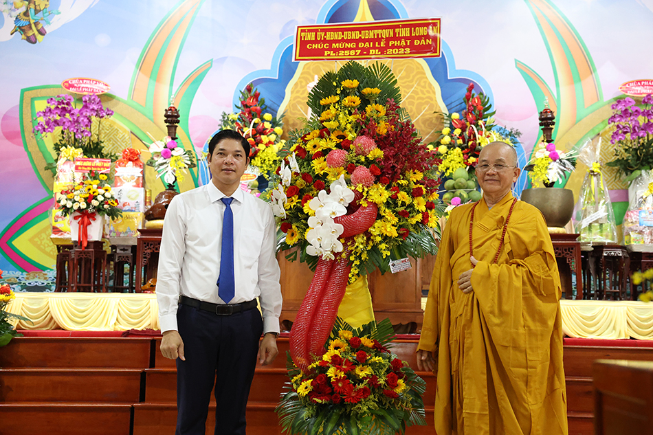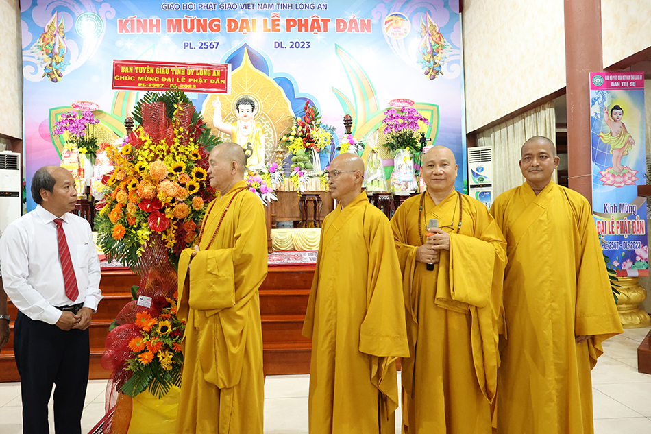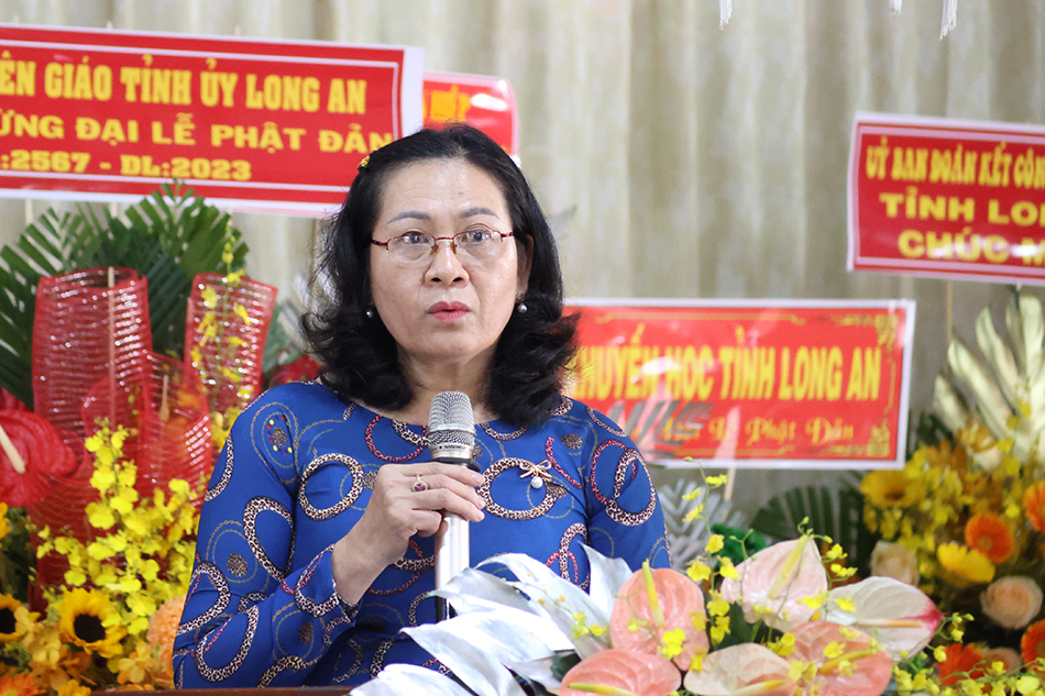 Buổi lễ được đón nhận lời chúc mừng Phật đản của Đại diện Chính quyền Tỉnh ủy, HĐND, UBND, UBMTTQVN tỉnh Long An, bà Phạm Thị Tiệp – Phó Chủ tịch UBMTTQVN tỉnh Long An đã phát biểu chúc mừng, trong lời phát biểu bà đã thông qua lời nói của Chủ tịch Hồ Chí Minh trong việc tri ân Tăng Ni và đồng bào Phật tử cả nước, hai miền Nam Bắc đã luôn thống nhất, đoàn kết để xây dựng khối đại đoàn kết toàn dân tộc, bên cạnh đó ghi nhận những thành tựu tốt đẹp mà Tăng Ni, Phật tử, đồng bào Phật giáo đã đồng hành, cống hiến, chung tay cùng các hoạt động an sinh xã hội, phát huy tính đại đoàn kết dân tộc, chia sẻ các mảnh đời khó khăn, xóa đói giảm nghèo, đặc biệt là thành quả chung tay cùng phòng chống đại dịch Covid 19 đạt kết quả tốt đẹp.