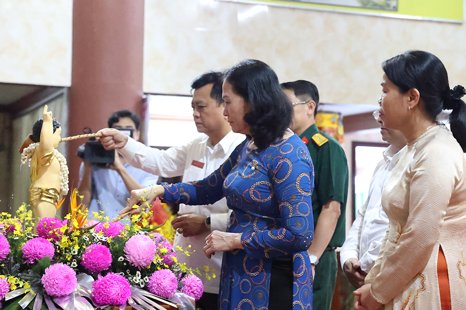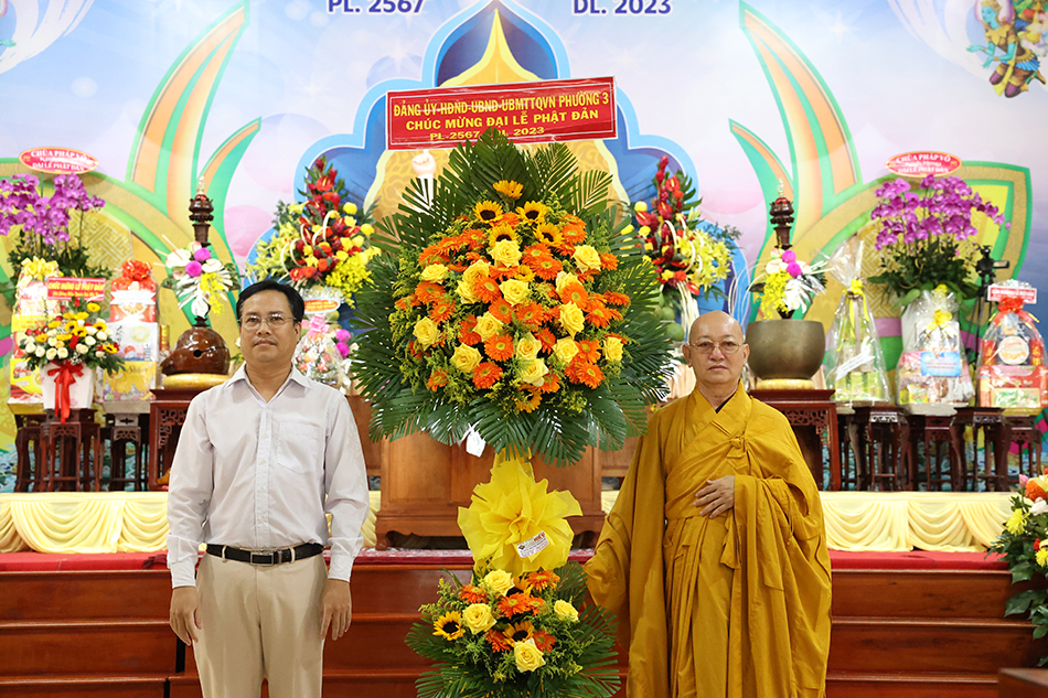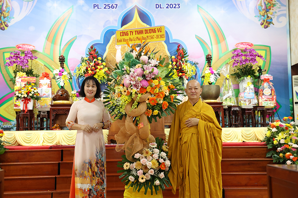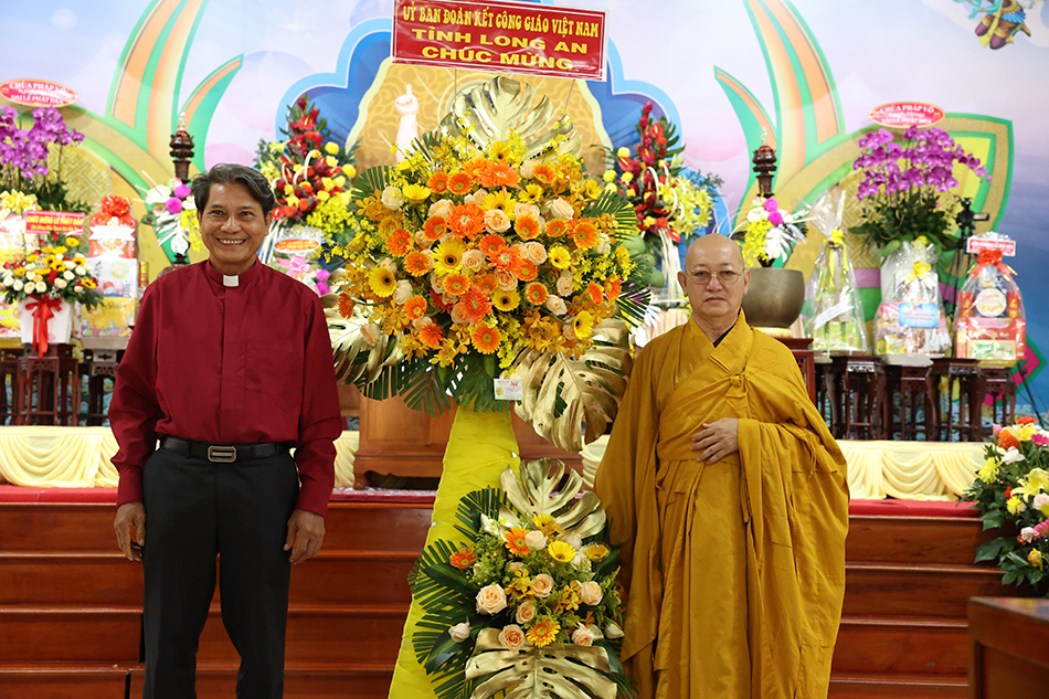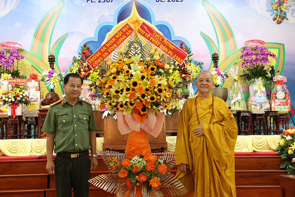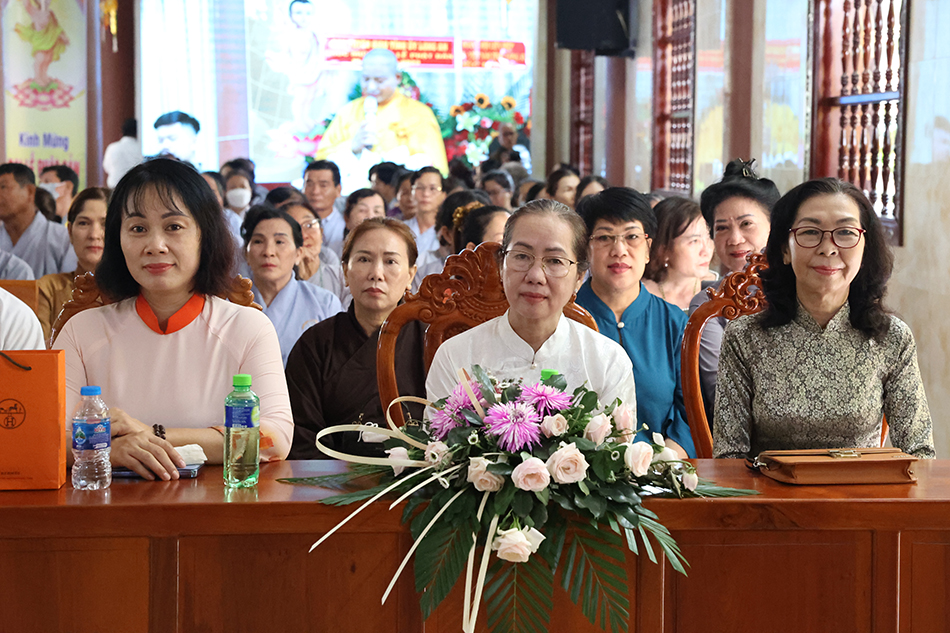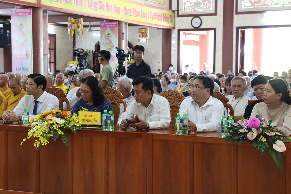 Buổi lễ được đón nhận lời chúc mừng Phật đản của Đại diện Chính quyền Tỉnh ủy, HĐND, UBND, UBMTTQVN tỉnh Long An, bà Phạm Thị Tiệp – Phó Chủ tịch UBMTTQVN tỉnh Long An đã phát biểu chúc mừng, trong lời phát biểu bà đã thông qua lời nói của Chủ tịch Hồ Chí Minh trong việc tri ân Tăng Ni và đồng bào Phật tử cả nước, hai miền Nam Bắc đã luôn thống nhất, đoàn kết để xây dựng khối đại đoàn kết toàn dân tộc, bên cạnh đó ghi nhận những thành tựu tốt đẹp mà Tăng Ni, Phật tử, đồng bào Phật giáo đã đồng hành, cống hiến, chung tay cùng các hoạt động an sinh xã hội, phát huy tính đại đoàn kết dân tộc, chia sẻ các mảnh đời khó khăn, xóa đói giảm nghèo, đặc biệt là thành quả chung tay cùng phòng chống đại dịch Covid 19 đạt kết quả tốt đẹp.