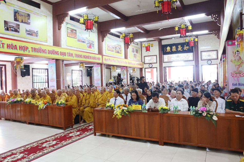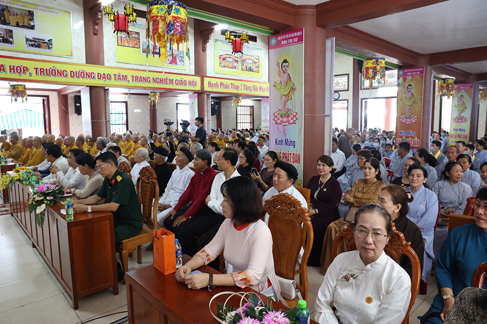 Đại đức Thích Lệ Ngôn – Ủy viên Ban Hoằng pháp TƯ, Phó Trưởng ban Trị sự kiêm Trưởng ban Hoằng pháp Phật giáo tỉnh, đã tuyên đọc Ý nghĩa Phật đản: Trang nghiêm Giáo hội là củng cố ngôi Tăng bảo, duy trì mạng mạch Phật pháp do Hòa thượng Thích Bảo Nghiêm – Trưởng ban Hoằng pháp TƯ GHPGVN biên soạn. Người học Phật cần nhận thức rằng Giáo hội Phật giáo Việt Nam không chỉ trên bình diện là một cơ quan hành chính quản lý Tăng Ni, tự viện mà còn là biểu tượng của Tăng bảo, là đoàn thể hoà hợp chúng lớn mạnh, thực hành hạnh lợi tha với phương châm: “Phục vụ chúng sinh là thiết thực cúng dàng chư Phật”. Bản thể của ngôi Tăng bảo được biểu hiện qua ba đặc tính: Hội chúng thanh tịnh, Hội chúng hoà hợp, Hội chúng bình đẳng. Người đệ tử Phật cần chính tín Tam bảo, khi đã xác quyết với niềm tin bất động nơi Phật, Pháp và Tăng thì tâm bồ-đề phải luôn kiên định, không thoái chuyển.