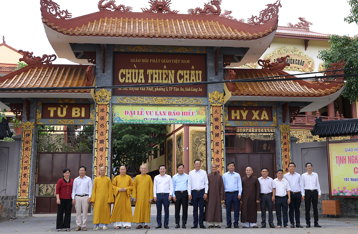 Sáng 15/08/2024( 12/07 Giáp Thìn Chư tôn đức thường trực Ban Trị sự GHPGVN tỉnh Long An đón tiếp ông Phó Bí thư Thường trực Tỉnh ủy Long An trưởng đoàn đại biểu Quốc hội tỉnh Nguyễn Thanh Hải và Phó Chủ tịch ủy ban nhân dân tỉnh ông Phạm Tuấn Hòa cùng lãnh đạo các sở ban ngành đến thăm chúc mừng ban Trị sự giáo hội Phật giáo Việt Nam tỉnh nhân đại lễ vu la năm 2024 tại chùa Thiên Châu thành phố Tân An.