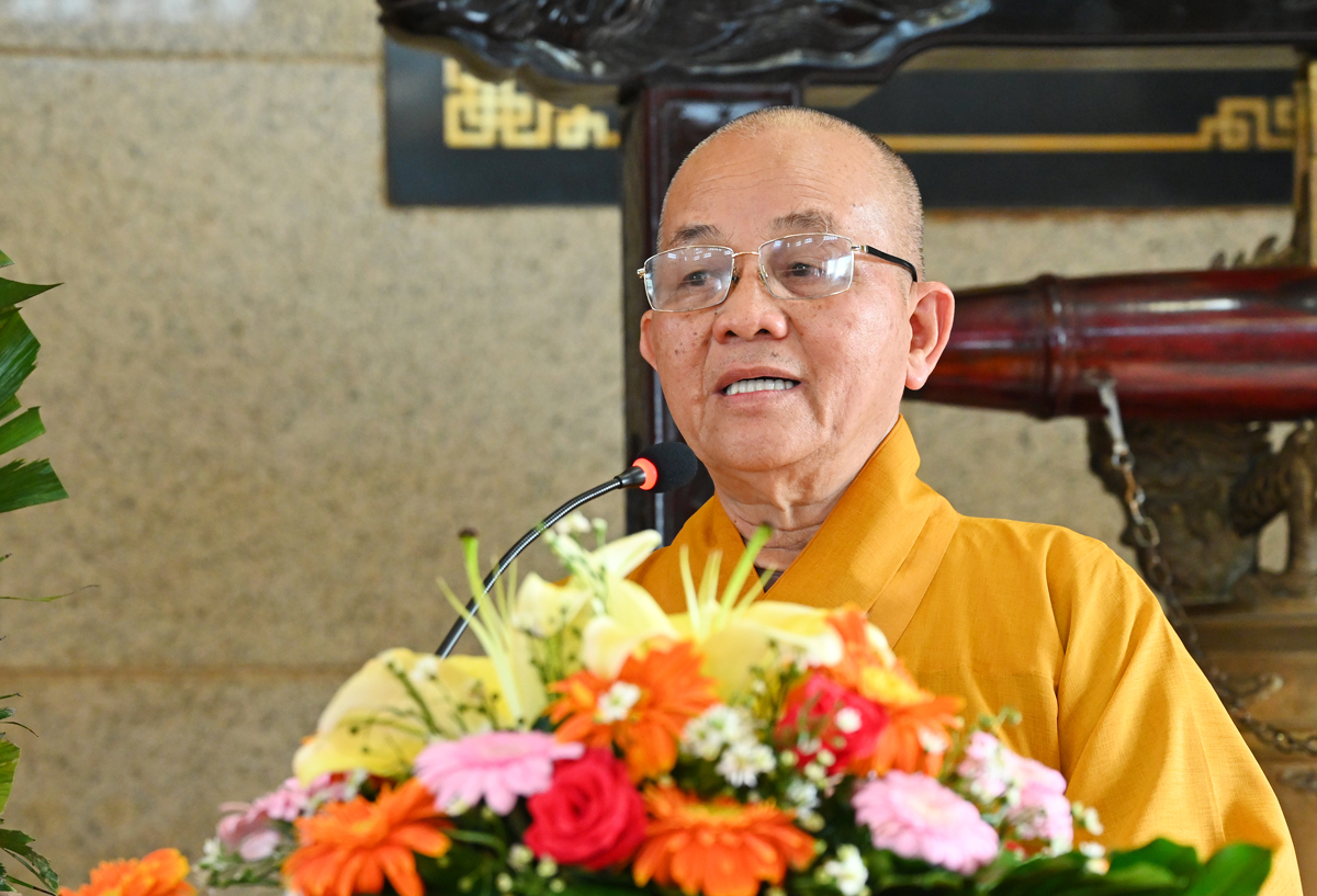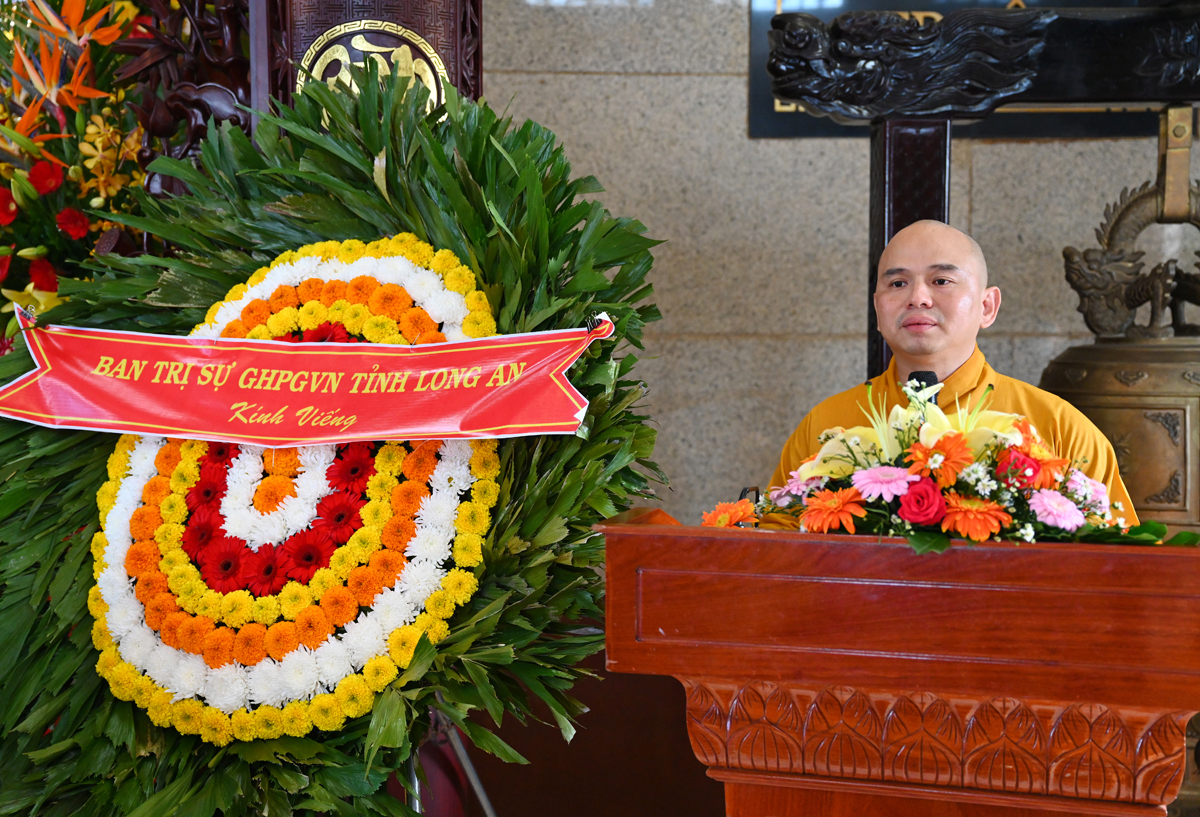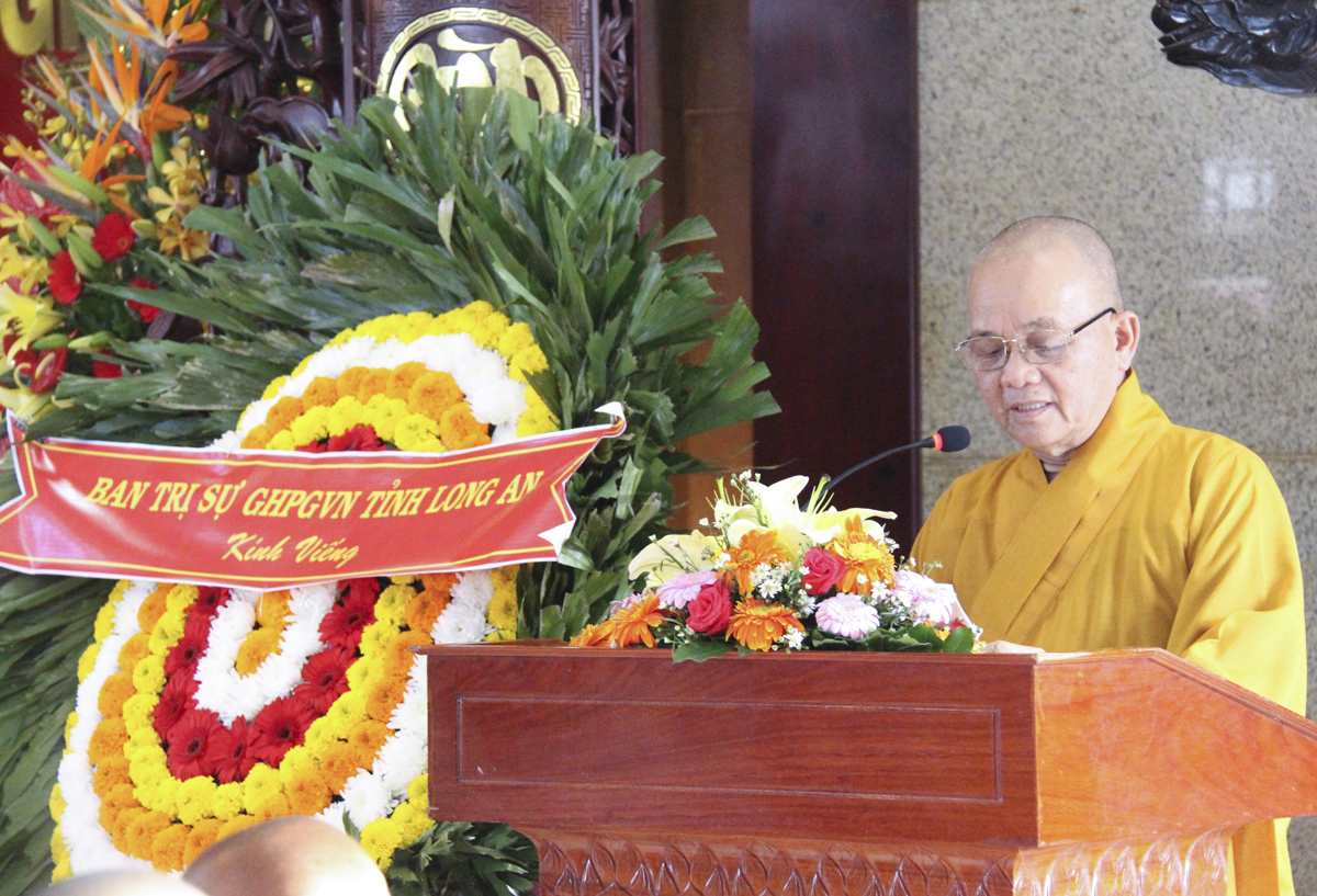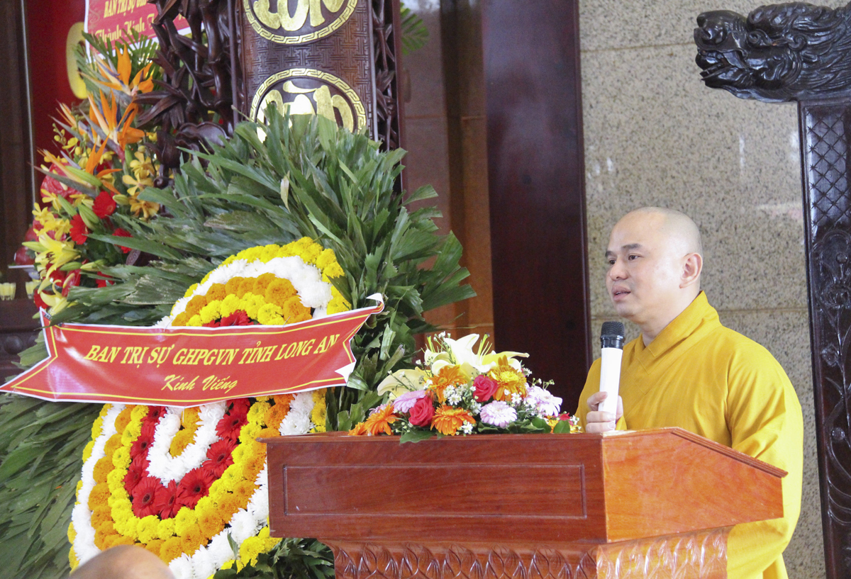 Thay lời cho chư Tôn đức BTS, chư Tôn đức Tăng – Ni của tỉnh Long An Hòa thượng Thích Minh Thiện đã dâng lời tưởng niệm tại buổi lễ. Với truyền thống yêu nước nồng nàn của dân tộc các anh hùng liệt sĩ đã hy sinh thân mình để đem lại hoà bình cho đất nước, Hòa thượng đã nói lên sự hy sinh cao quý của các anh hùng liệt sĩ đã hiến dâng cả tuổi thanh xuân, xả thân cho Tổ quốc, dũng cảm chiến đấu, anh dũng hy sinh, quyết tử cho Tổ quốc trường tồn; máu đào và sự cống hiến của các thương binh, bệnh binh của các anh để cho đất nước được nở hoa. Hòa thượng đã nhắc lại những lời dạy và những lời ca ngợi Bác Hồ, Hòa thượng đặc biệt kính niệm ân những anh hùng chiến sĩ Việt Nam đã không tiếc thân mạng, các Mẹ, các chị đã chịu những tra khảo cùng cực của địch, những mất mát ấy tất cả vì công cuộc giải phóng dân tộc. Hòa thượng nhấn mạnh, dù chiến tranh đã qua đi nhưng những mất mát và đau thương vẫn còn đó, những người VN sẽ mãi ghi nhớ, mãi tự hào về ý chí quật cường của cha ông và sẽ luôn cầu nguyện các anh linh các anh hùng liệt sĩ sớm sanh về cõi Tịnh, các thương binh – bệnh binh cùng gia đình sẽ tiếp tục truyền thống yêu nước của dân tộc, cùng chung tay xây dựng đất nước.