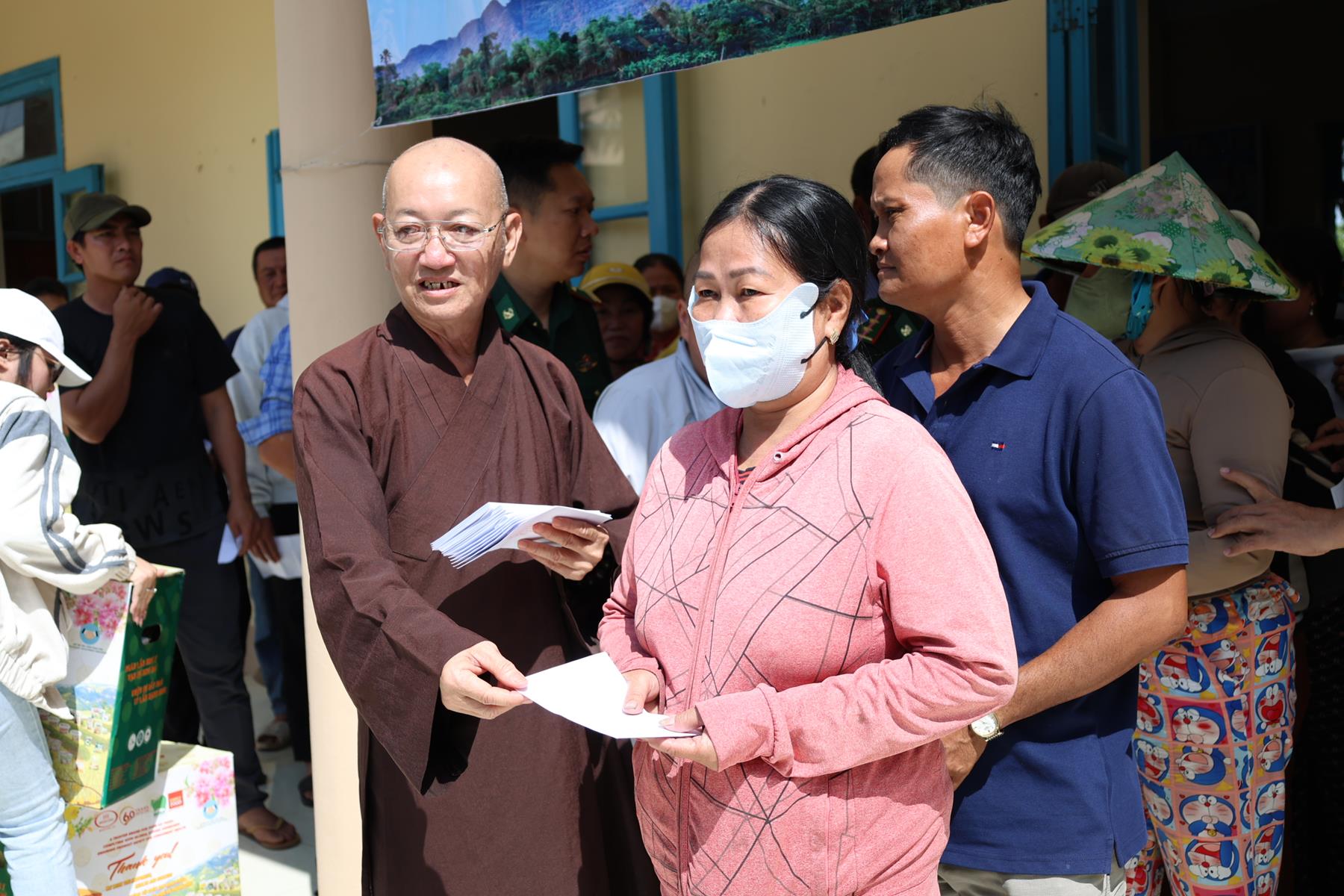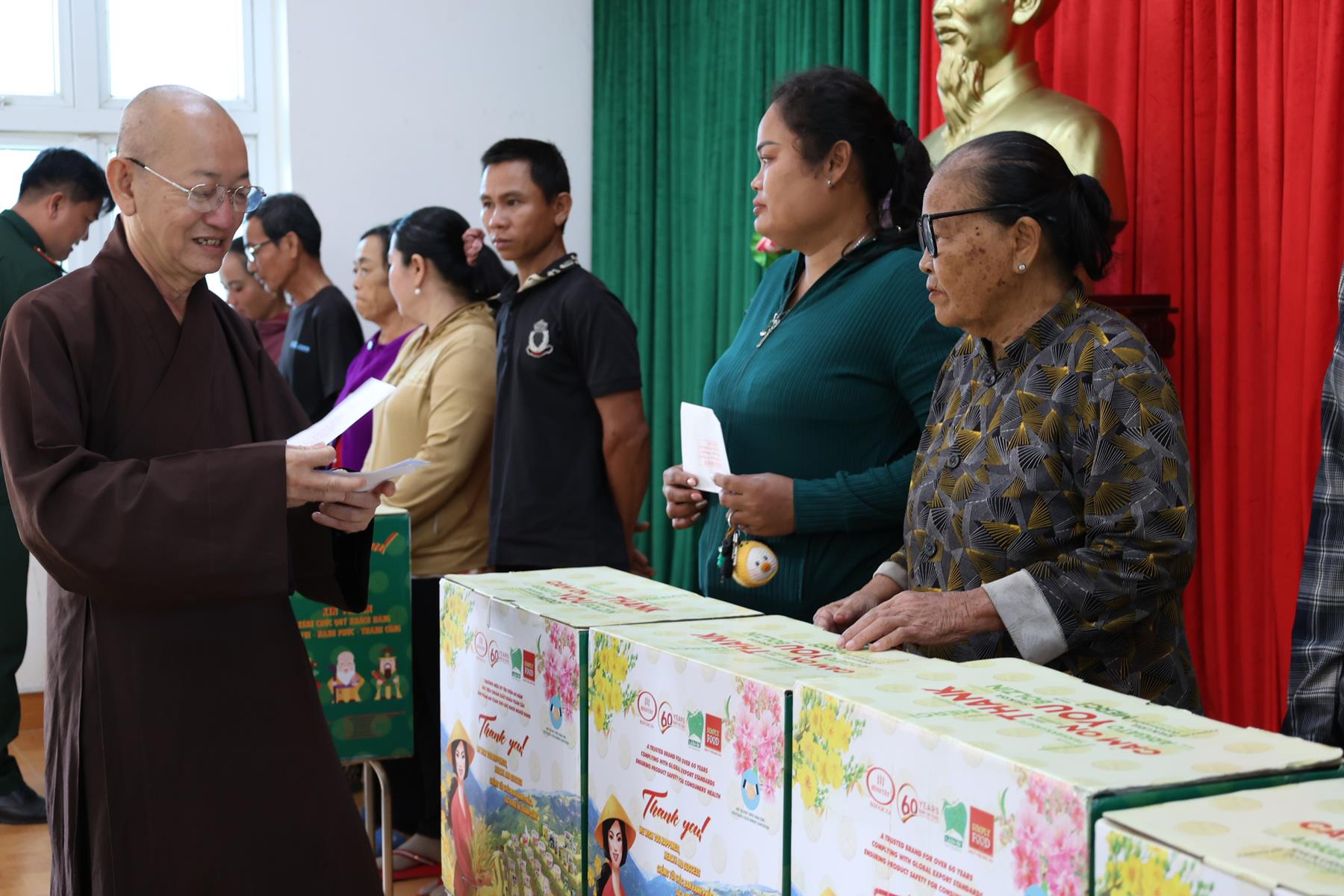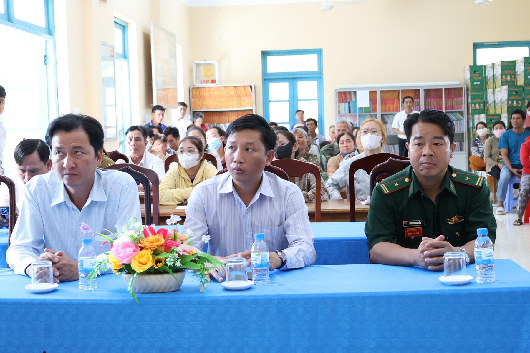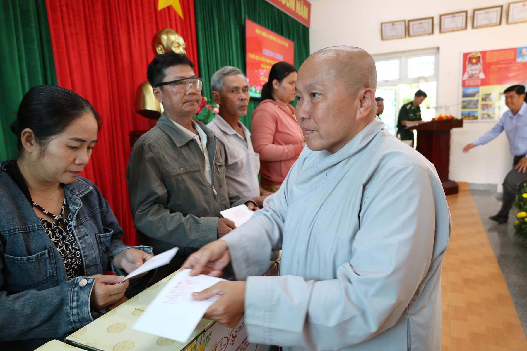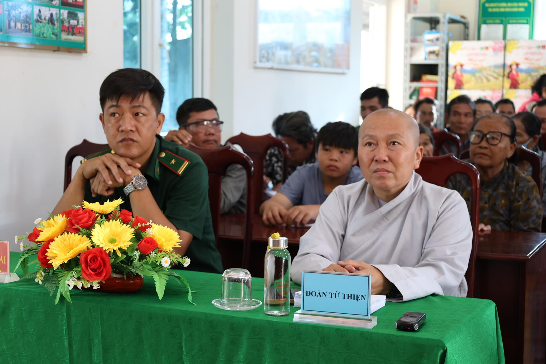 Tham dự buổi phát quà có: TT. Thích Quảng Tâm – UV HĐTS, Phó ban Từ thiện Xã hội TW, Trưởng BTS GHPGVN tỉnh Tây Ninh; NS. TN. Diệu Huệ – UVTT BTS GHPGVN tỉnh; ông Nguyễn Thanh Phú – Chủ tịch UBMTTQVN xã Bình Hiệp; ông Nguyễn Tuân – Nguyên Phó Chỉ huy Trưởng Bộ đội Biên phòng tỉnh Long An; Thiếu tá Phan Đình Huy – Phó Đội trưởng Đội Biên phòng Thạnh Trị; cùng đại diện mạnh thường quân.