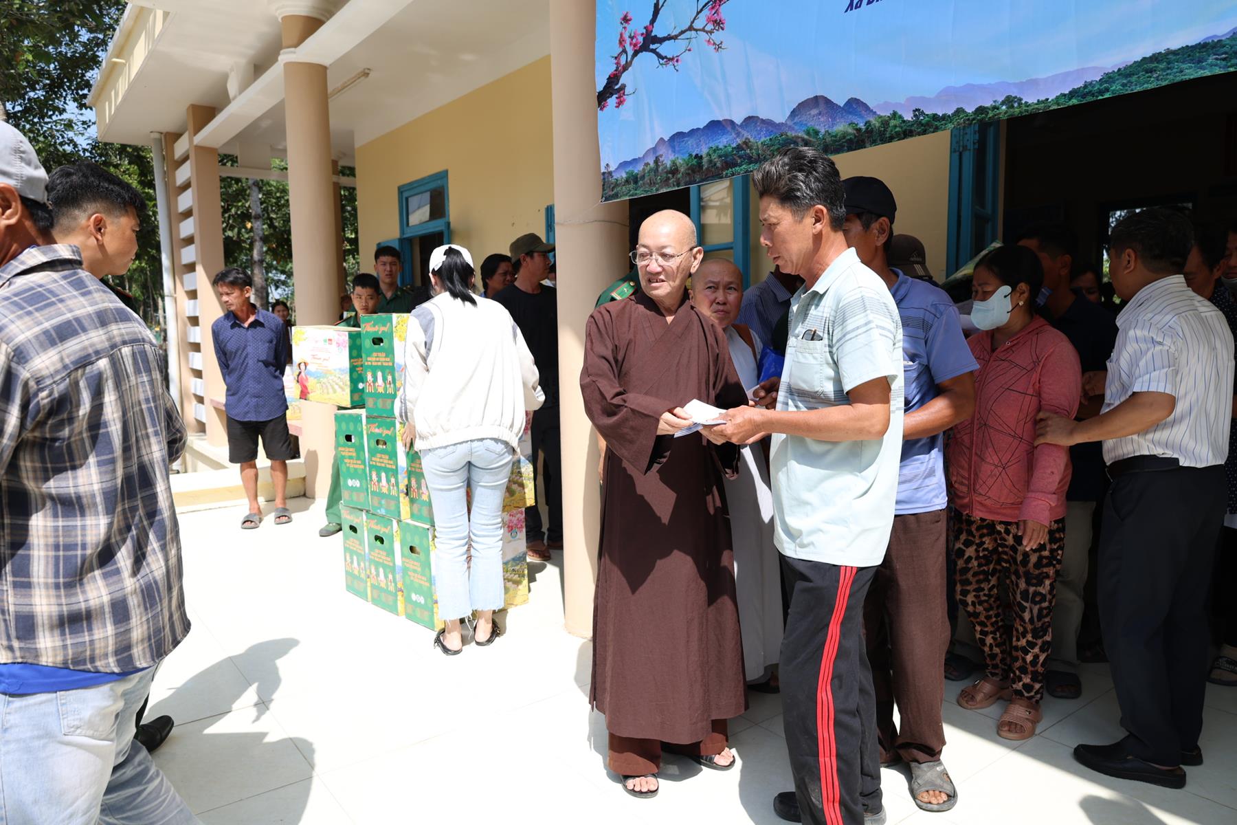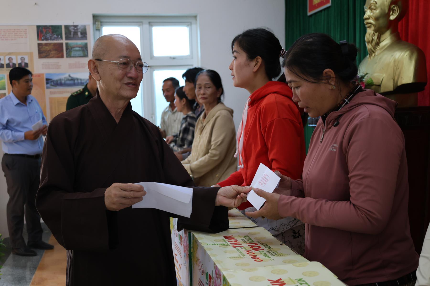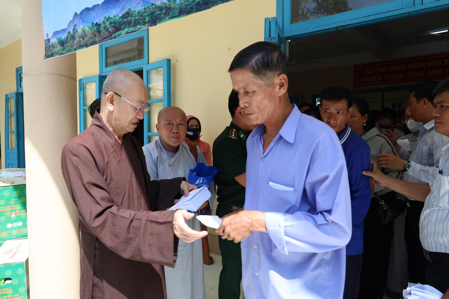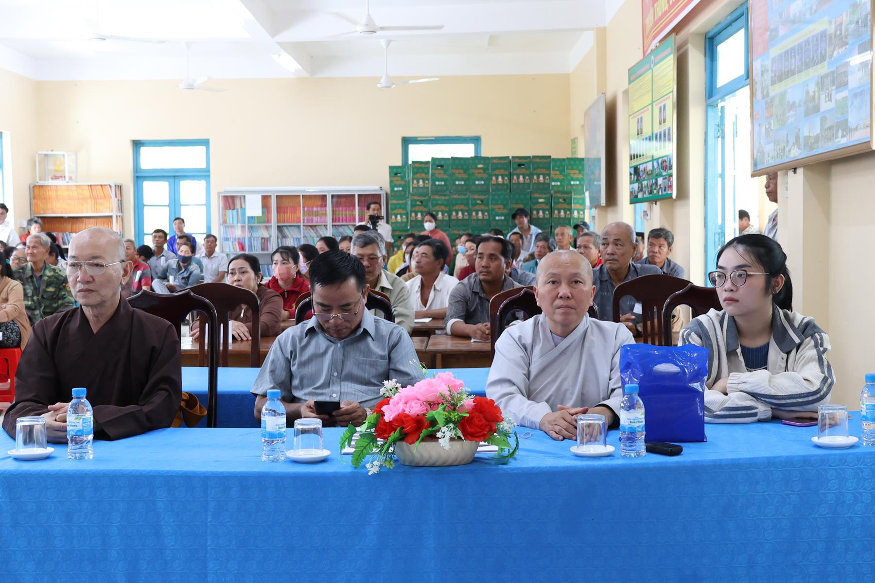 Tham dự buổi phát quà có: TT. Thích Quảng Tâm – UV HĐTS, Phó ban Từ thiện Xã hội TW, Trưởng BTS GHPGVN tỉnh Tây Ninh; NS. TN. Diệu Huệ – UVTT BTS GHPGVN tỉnh; ông Nguyễn Thanh Phú – Chủ tịch UBMTTQVN xã Bình Hiệp; ông Nguyễn Tuân – Nguyên Phó Chỉ huy Trưởng Bộ đội Biên phòng tỉnh Long An; Thiếu tá Phan Đình Huy – Phó Đội trưởng Đội Biên phòng Thạnh Trị; cùng đại diện mạnh thường quân.