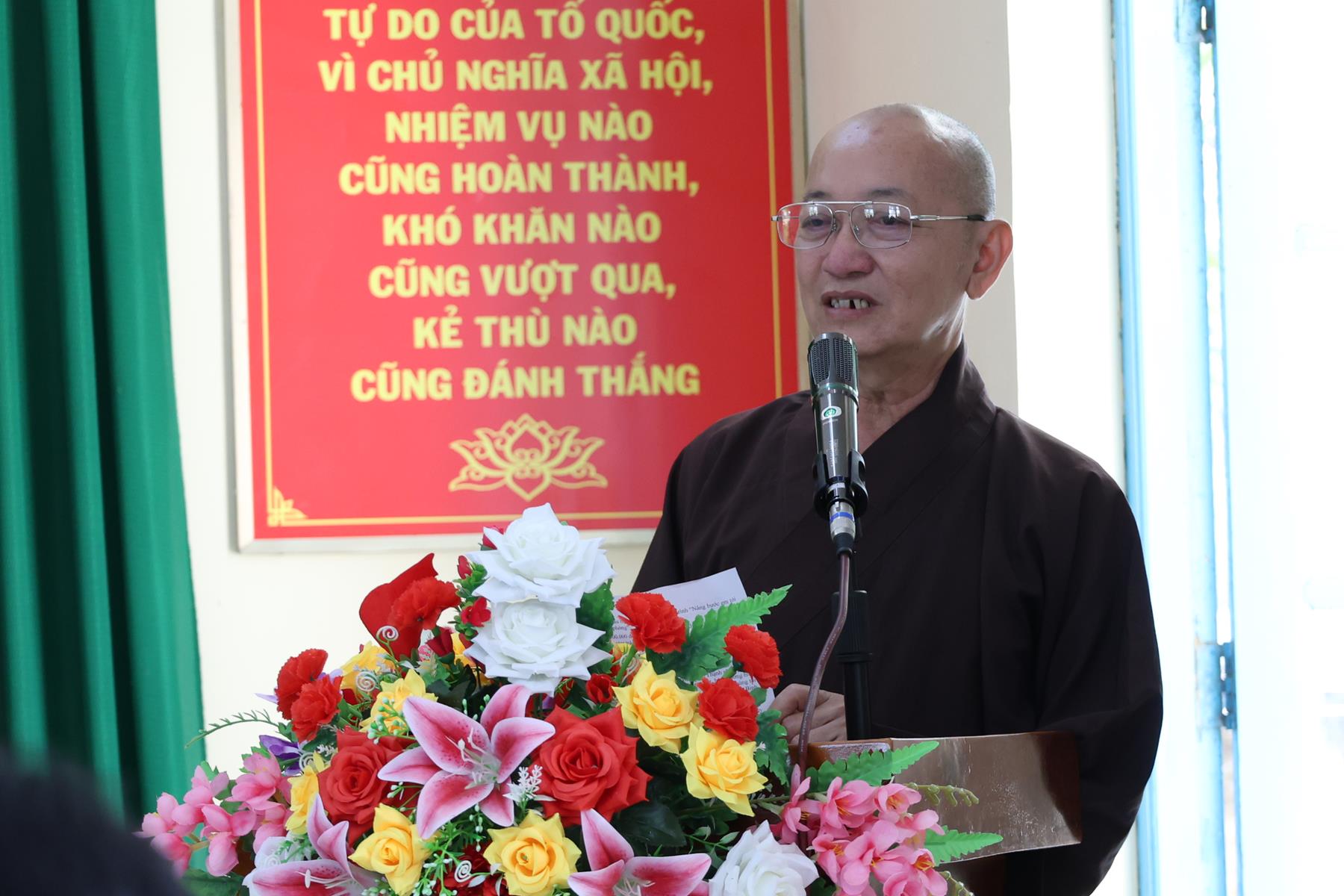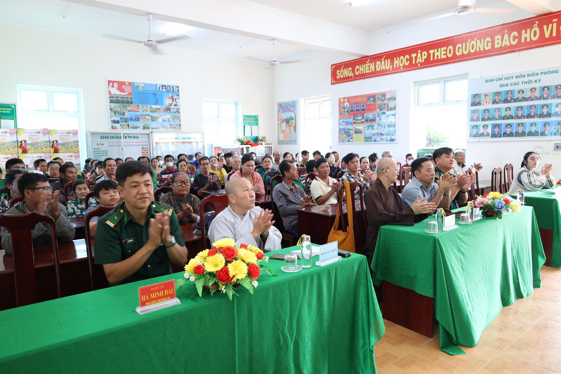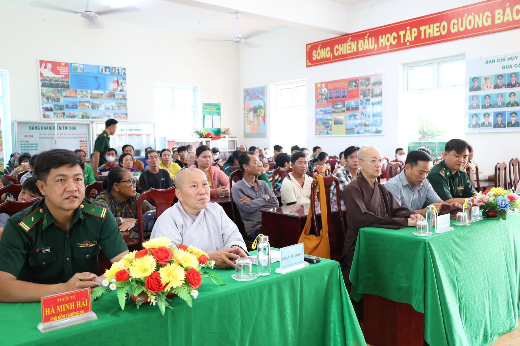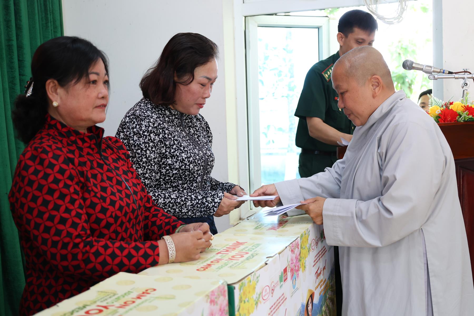 Thay mặt BTS GHPGVN tỉnh Tây Ninh, Thượng tọa Thích Quảng Tâm nhắc lại tinh thần Phật giáo Việt Nam luôn đồng hành cùng dân tộc Việt Nam theo đúng phương châm “Đạo pháp – Dân tộc – Xã hội Chủ nghĩa”, nhiều năm qua, Phật giáo tỉnh nhà đã đồng hành cùng Lực lượng vũ trang tỉnh trong nhiều công tác, nhất là an sinh xã hội. Thượng tọa kính tri ân TT. Thích Thanh Phong – Phó Chủ tịch HĐTS, Trưởng ban Kinh tế Tài chính TW, Trụ trì chùa Vĩnh Nghiêm và bà Mai Thị Hạnh – Phu nhân Nguyên Chủ tịch nước Trương Tấn Sang và nhóm Chia sẻ-Sharing đã đồng hành cùng buổi phát quà hôm nay.