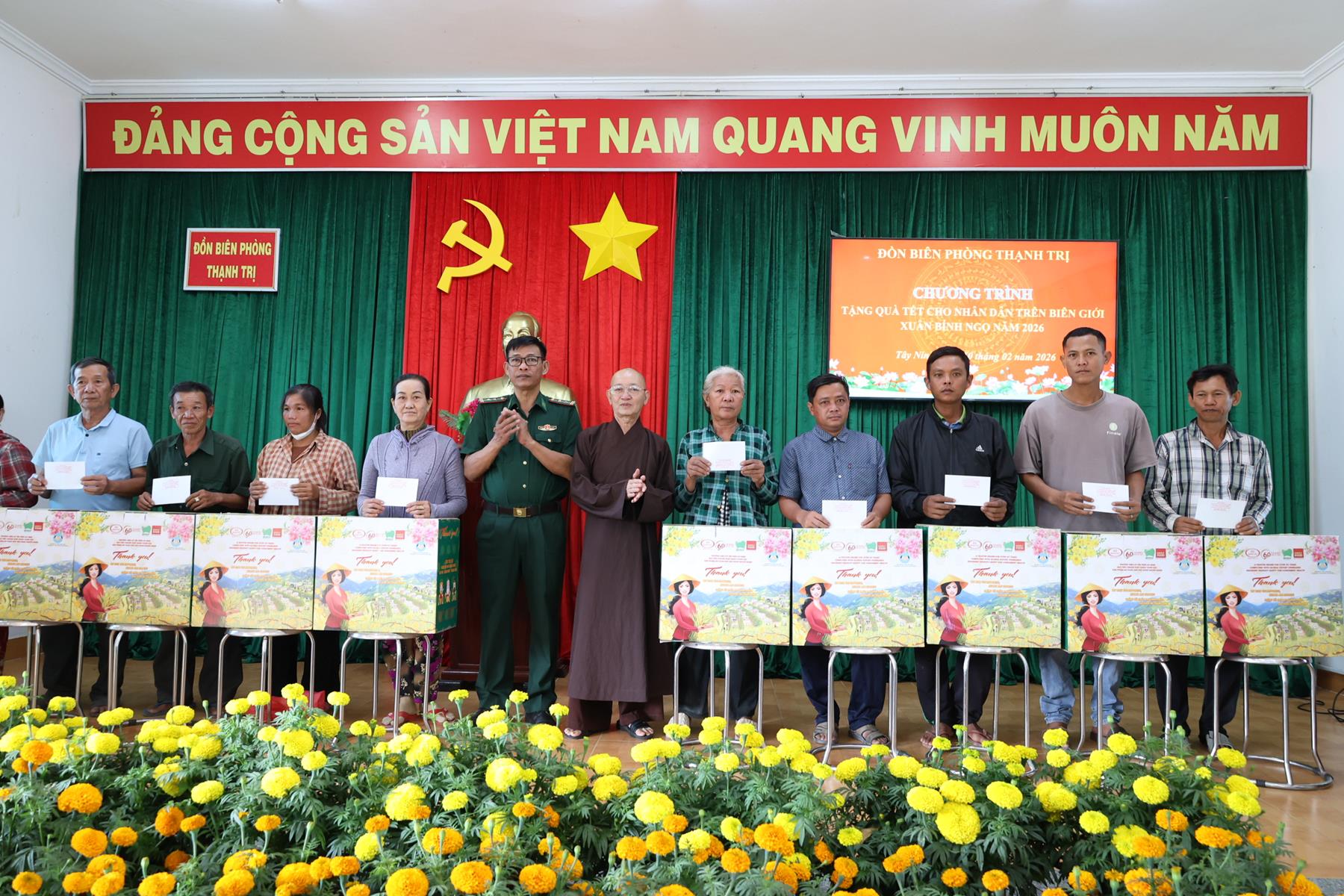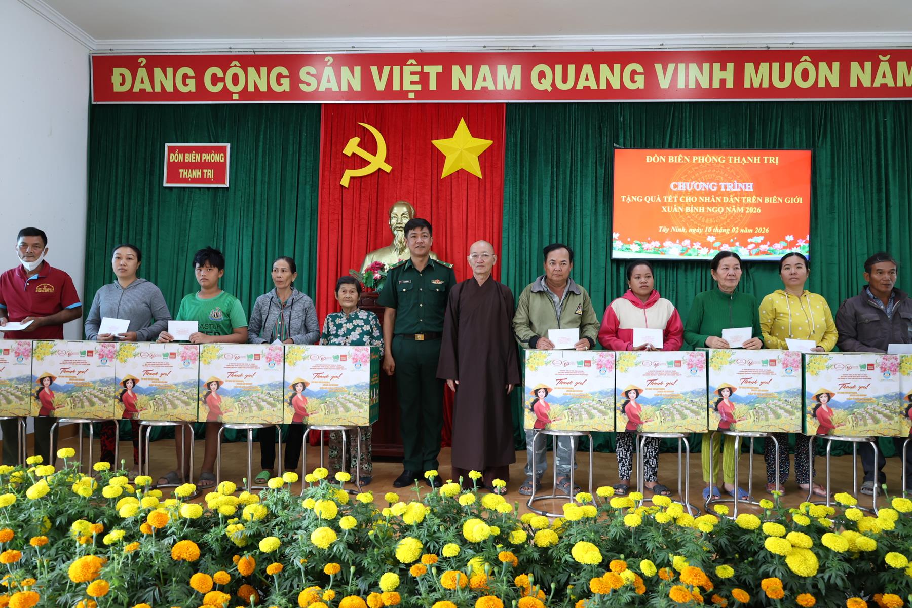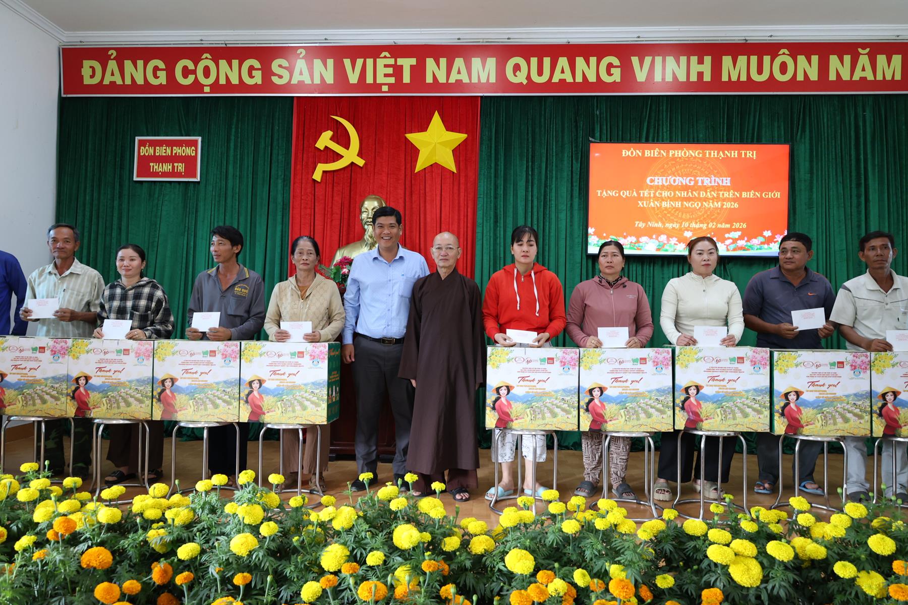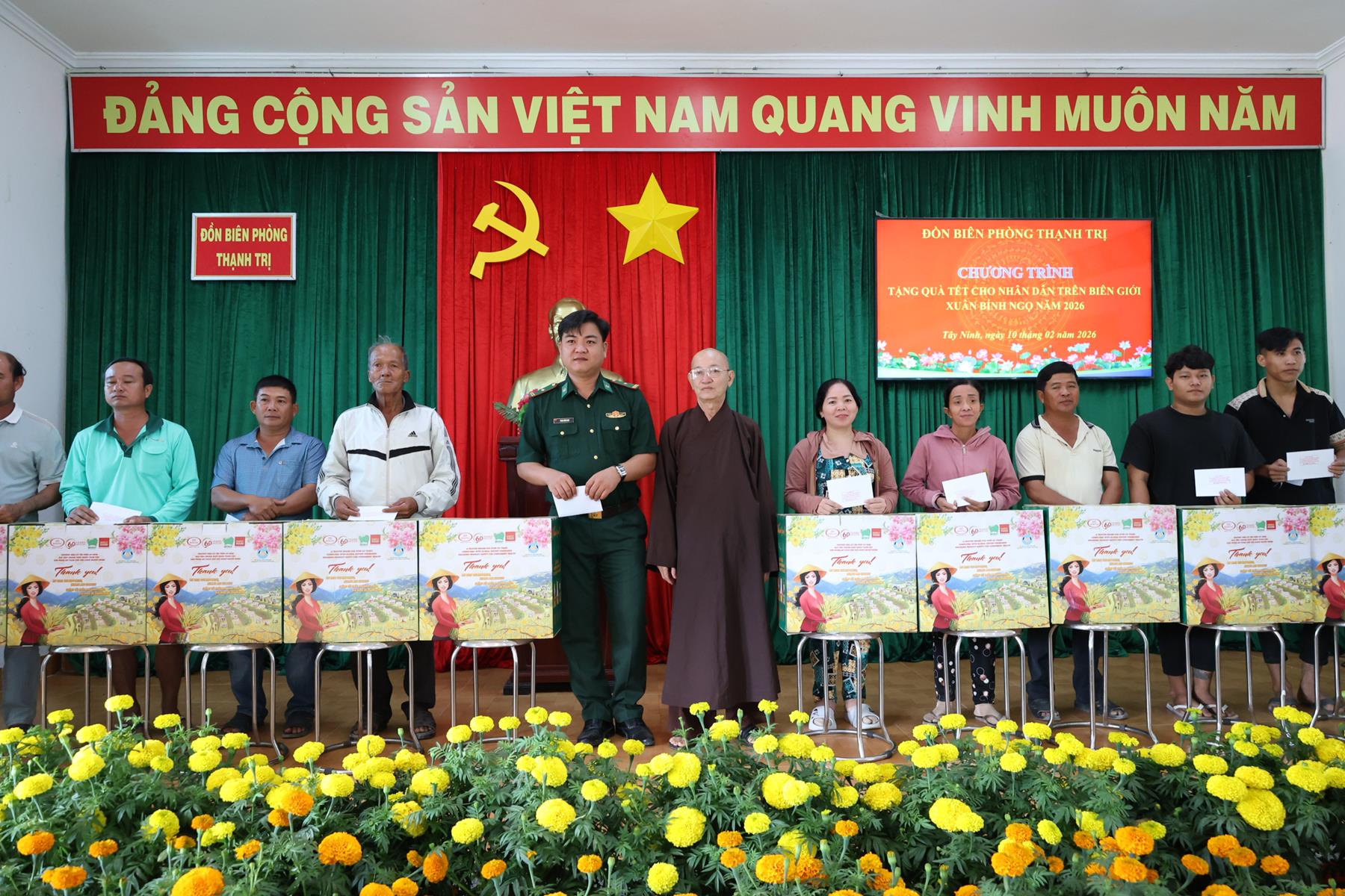 Ngày 10/02/2026, Ban Trị sự Giáo hội Phật giáo Việt Nam tỉnh Tây Ninh phối hợp Đồn Biên phòng Thạnh Trị, xã Bình Hiệp và Đồn biên phòng Bình Thạnh xã Bình Hòa tỉnh Tây Ninh tổ chức trao quà tết cho người dân biên giới nhân dịp Tết Nguyên đán Bính Ngọ năm 2026.