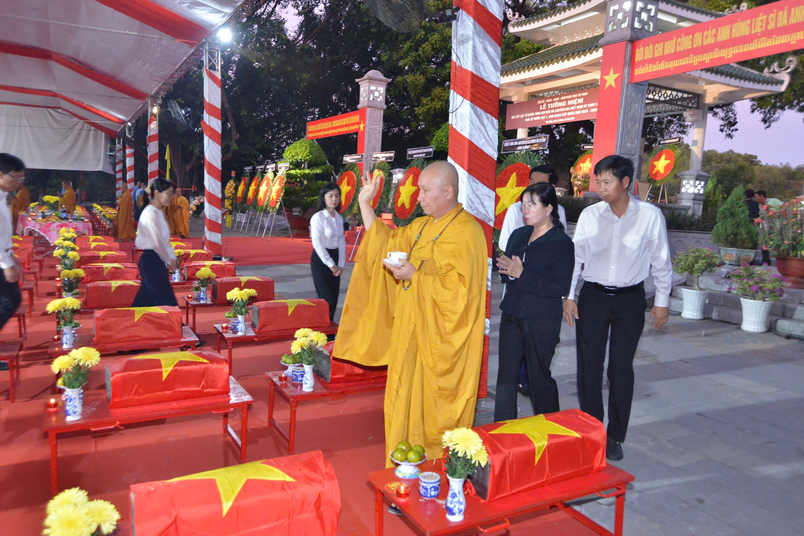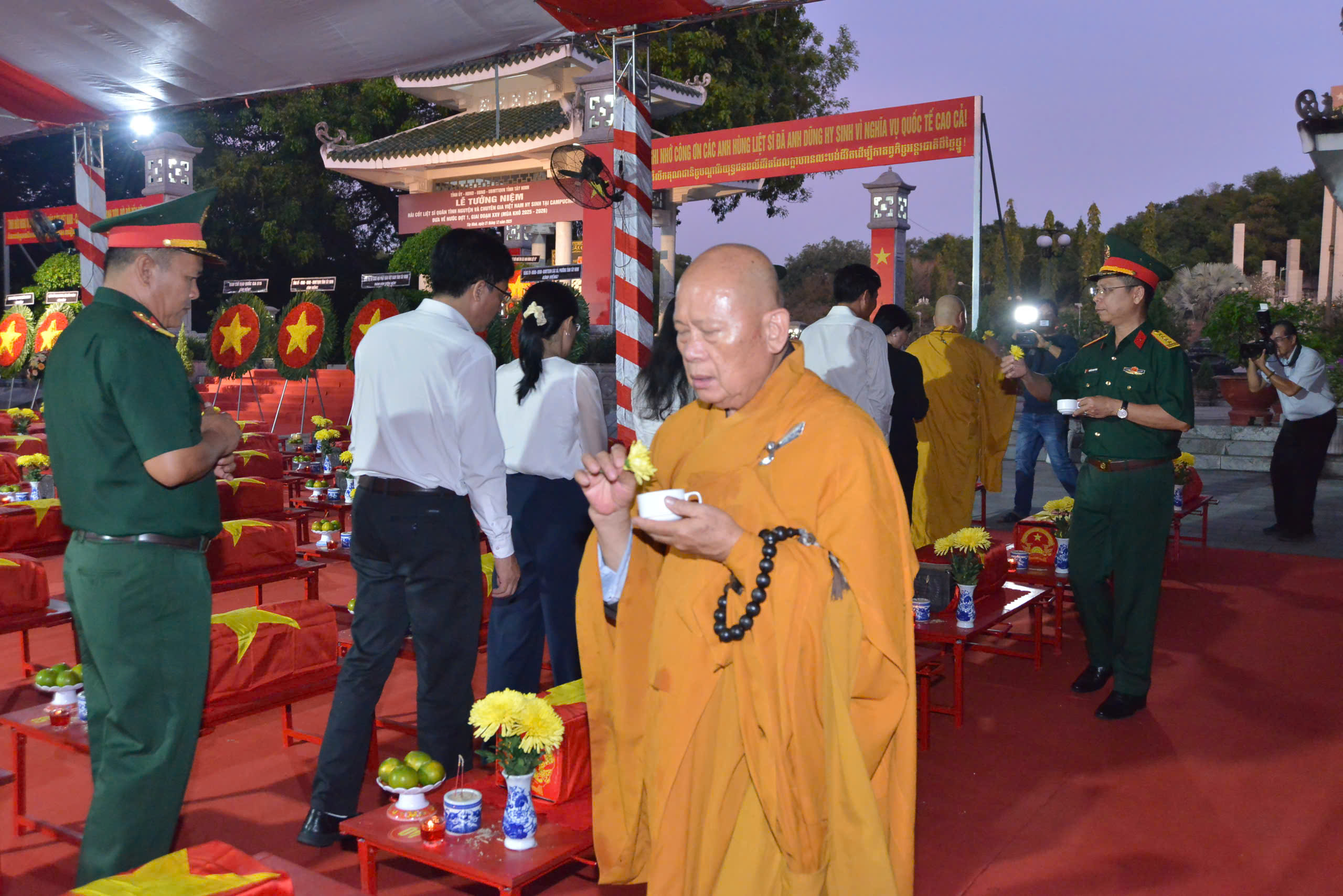 Tại buổi lễ, thay mặt Ban Chứng minh, Ban Thường trực BTS GHPGVN tỉnh Tây Ninh, HT. Thích Minh Thiện đọc văn tế tưởng niệm anh hùng Liệt sĩ quân tình nguyện và chuyên gia Việt Nam hy sinh tại Campuchia đưa về nước đợt 1, gia đoạn XXV (mùa khô 2025-2026) cũng như tất cả anh linh các anh hùng Liệt sĩ đã hy sinh cho sự nghiệp giải phóng dân tộc, thống nhất đất nước. Trong lời văn tế, Hòa thượng bày tỏ niềm tri ân sâu sắc đối với các anh hùng Liệt sĩ nhất là các chiến sĩ anh dũng hy sinh vì nghĩa vụ quốc tế cao cả. Thay mặt Tăng Ni tỉnh nhà, Hòa thượng phát nguyện: “Chúng tôi nguyện khắc ghi, Nguyện sống xứng đáng,Nguyện dựng xây quê hương giàu mạnh, Để không phụ máu xương của các anh hùng liệt sĩ.” Hòa thượng kính cẩn dâng lời cẩn tế: