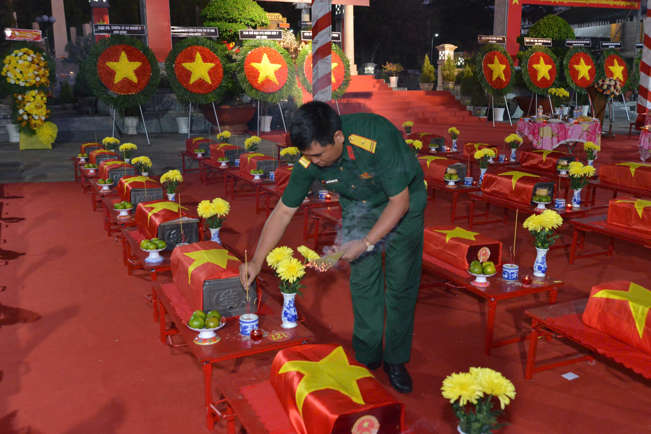 Tại buổi lễ, Đại tá Nguyễn Thanh Phong – Chính ủy Bộ Chỉ huy Quân sự tỉnh, Phó Trưởng ban Thường trực Ban Chỉ đạo 515 tỉnh Tây Ninh thực hiện nghi thức gióng ba hồi chuông chiêu tập anh linh các anh hùng liệt sĩ. Đại diện Quân khu 7, Bộ Chỉ huy Quân sự tỉnh, các sở, ban, ngành, chính quyền địa phương và các hòa thượng kính cẩn nghiêng mình mặc niệm tưởng nhớ các anh hùng liệt sĩ đã anh dũng hy sinh vì sự nghiệp giải phóng dân tộc.