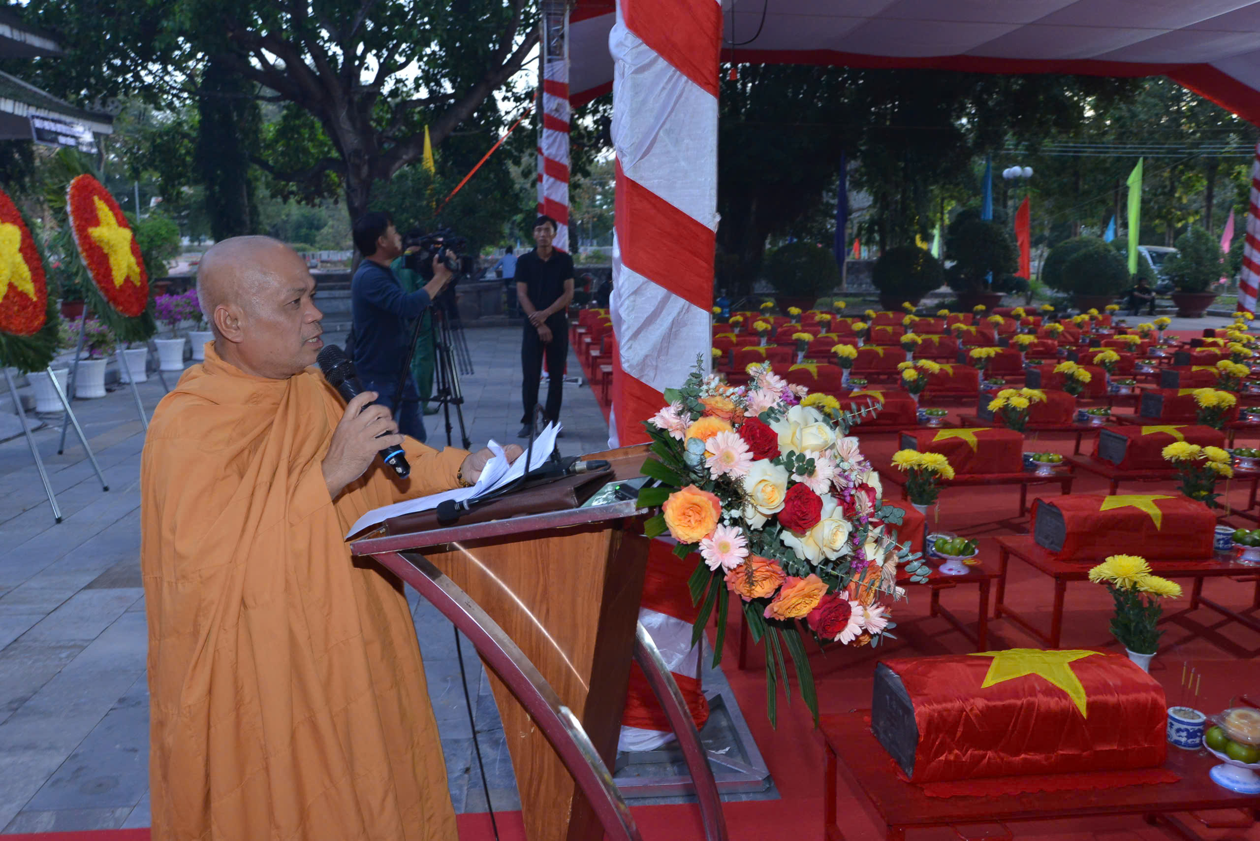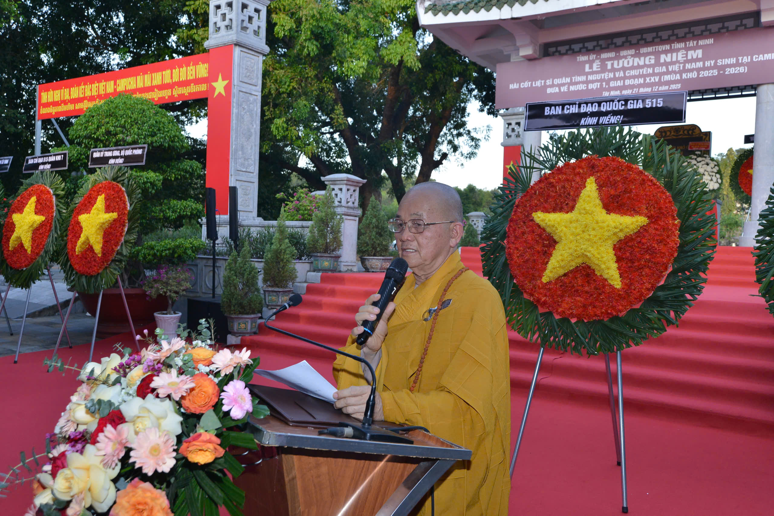 Tại buổi lễ, thay mặt Ban Chứng minh, Ban Thường trực BTS GHPGVN tỉnh Tây Ninh, HT. Thích Minh Thiện đọc văn tế tưởng niệm anh hùng Liệt sĩ quân tình nguyện và chuyên gia Việt Nam hy sinh tại Campuchia đưa về nước đợt 1, gia đoạn XXV (mùa khô 2025-2026) cũng như tất cả anh linh các anh hùng Liệt sĩ đã hy sinh cho sự nghiệp giải phóng dân tộc, thống nhất đất nước. Trong lời văn tế, Hòa thượng bày tỏ niềm tri ân sâu sắc đối với các anh hùng Liệt sĩ nhất là các chiến sĩ anh dũng hy sinh vì nghĩa vụ quốc tế cao cả. Thay mặt Tăng Ni tỉnh nhà, Hòa thượng phát nguyện: “Chúng tôi nguyện khắc ghi, Nguyện sống xứng đáng,Nguyện dựng xây quê hương giàu mạnh, Để không phụ máu xương của các anh hùng liệt sĩ.” Hòa thượng kính cẩn dâng lời cẩn tế: