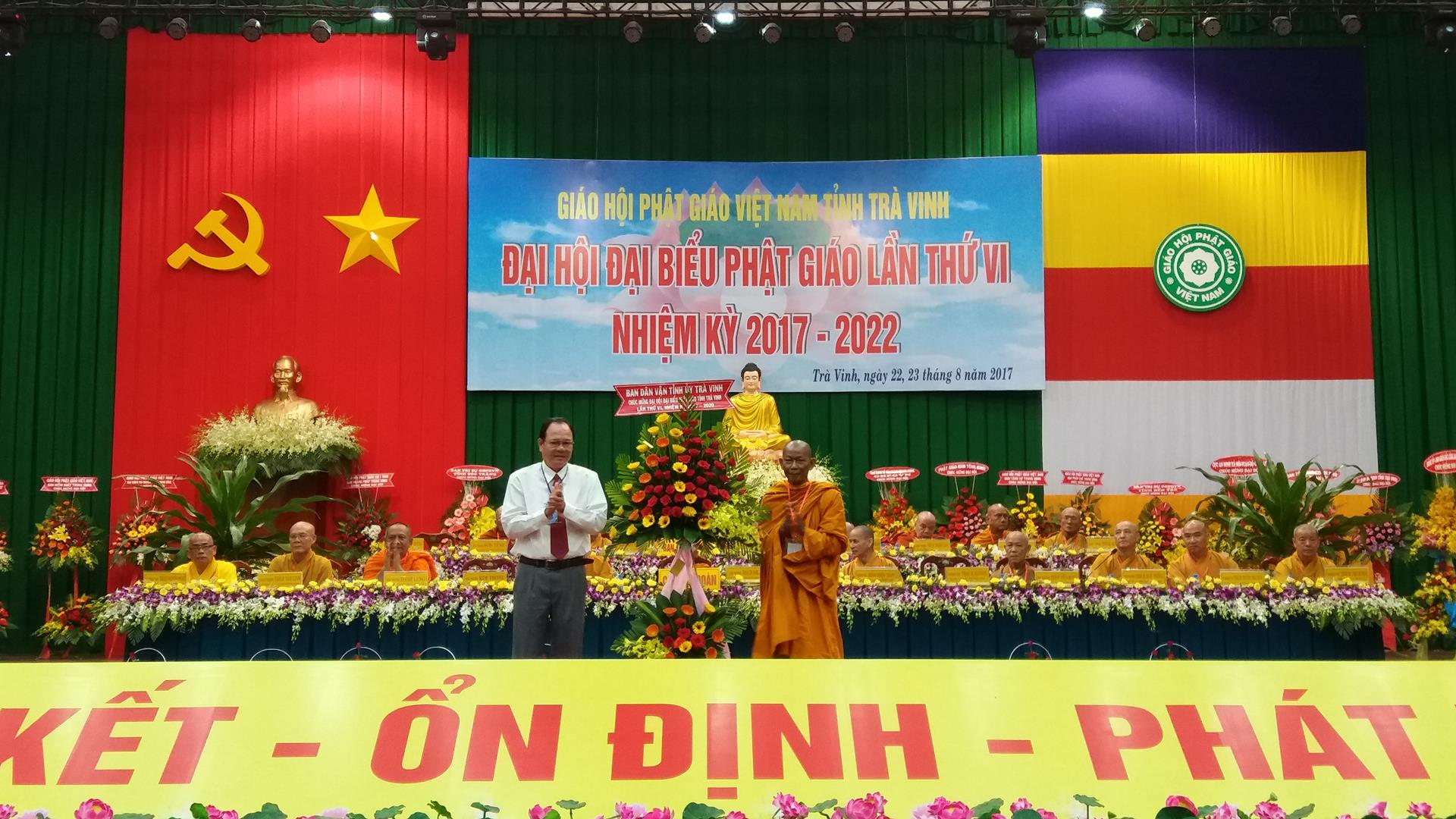 Ông Kim Ngọc Thái: Phó Chủ tịch UBND tỉnh phát biểu chúc mừng Đại hội. Ông đánh giá cao sự đóng góp của Phật giáo Trà Vinh vào công cuộc xây dựng và bảo vệ tổ quốc, luôn đồng hành, gắn bó cùng dân tộc trong nhiệm kỳ V; đặc biệt là hoạt động từ thiện, an sinh xã hội. Ông khẳng định Đảng, Nhà nước sẽ tôn trọng, bảo hộ quyền tự do tín ngưỡng của các tôn giáo. Đồng thời, Ông Thái kêu  gọi Tăng Ni, Phật tử nhiệm kỳ mới hãy tiếp tục hưởng ứng phong trào thi đua yêu nước, thực hiện theo Hiến chương của Giáo hội và chính sách pháp luật của Đảng, Nhà nước; hoạt động Phật sự theo phương châm “Đạo pháp Dân tộc-Chủ nghĩa Xã hội”.