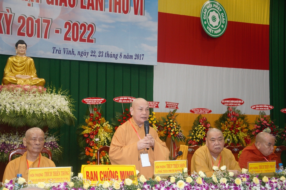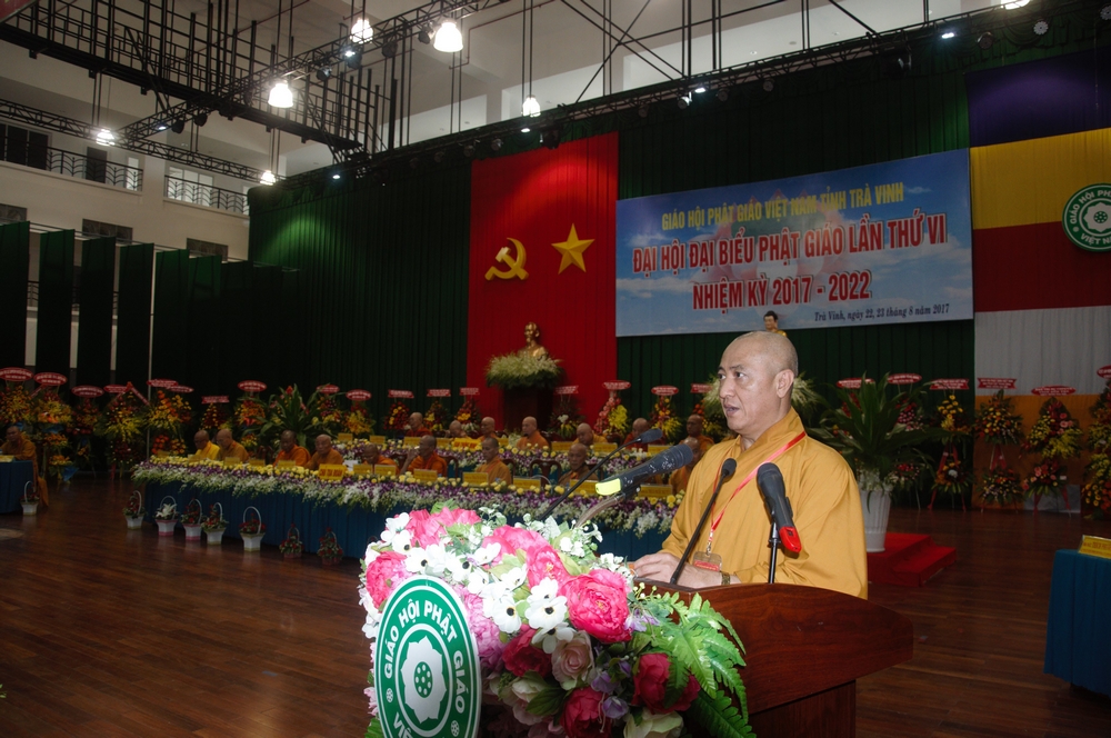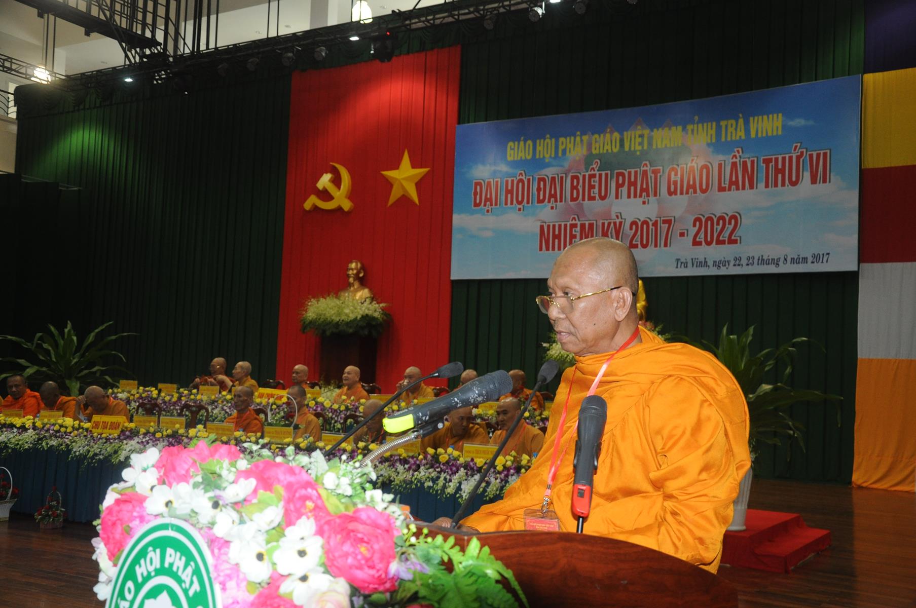 TT Thích Trí Minh: Phó Trưởng ban kiêm Chánh Thư ký GHPGVN tỉnh Trà Vinh Báo cáo tổng kết hoạt động Phật sự lần thứ V, nhiệm kỳ (2012-2017) và phương hướng hoạt động Phật sự lần thứ VI, nhiệm kỳ (2017-2022). Thượng tọa cho biết: Trà Vinh có 250 tự viện, tăng hơn nhiệm kỳ trước 16 tự viện (Nam tông Khmer 143 tự viện; Nam tông kinh 04 tự viện; Bắc tông: 94 tự viện; khất sĩ: 09 tự viện; bổ nhiệm trụ trì có 29 Tăng Ni;