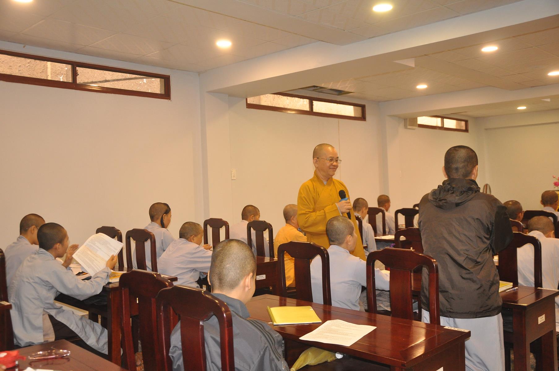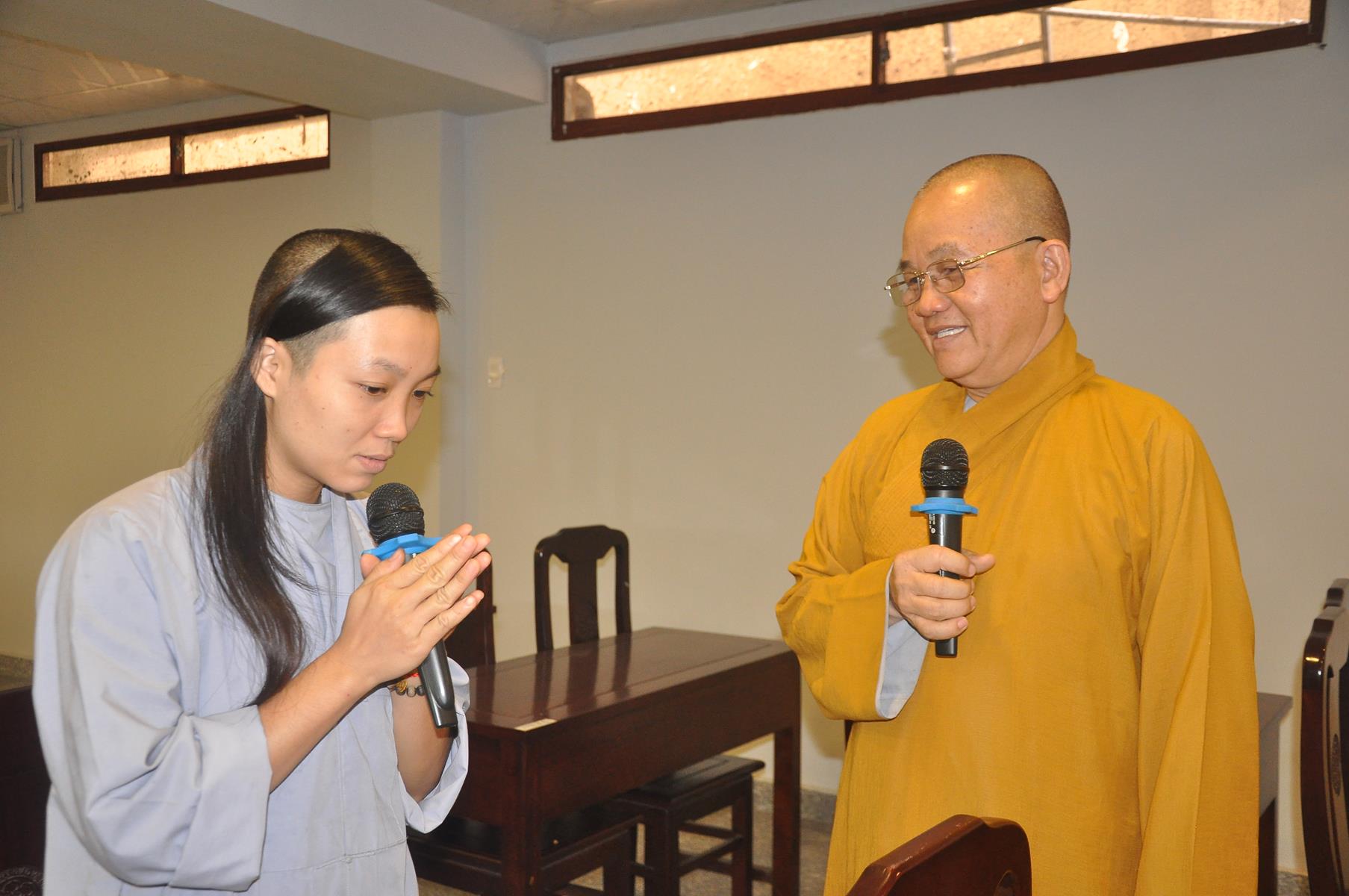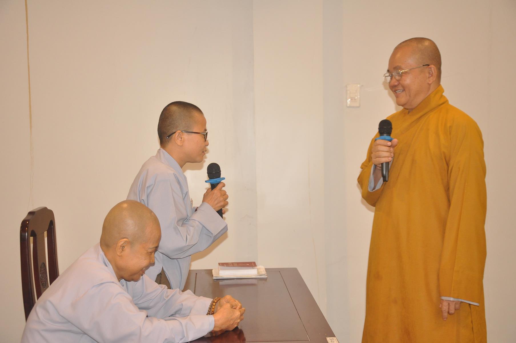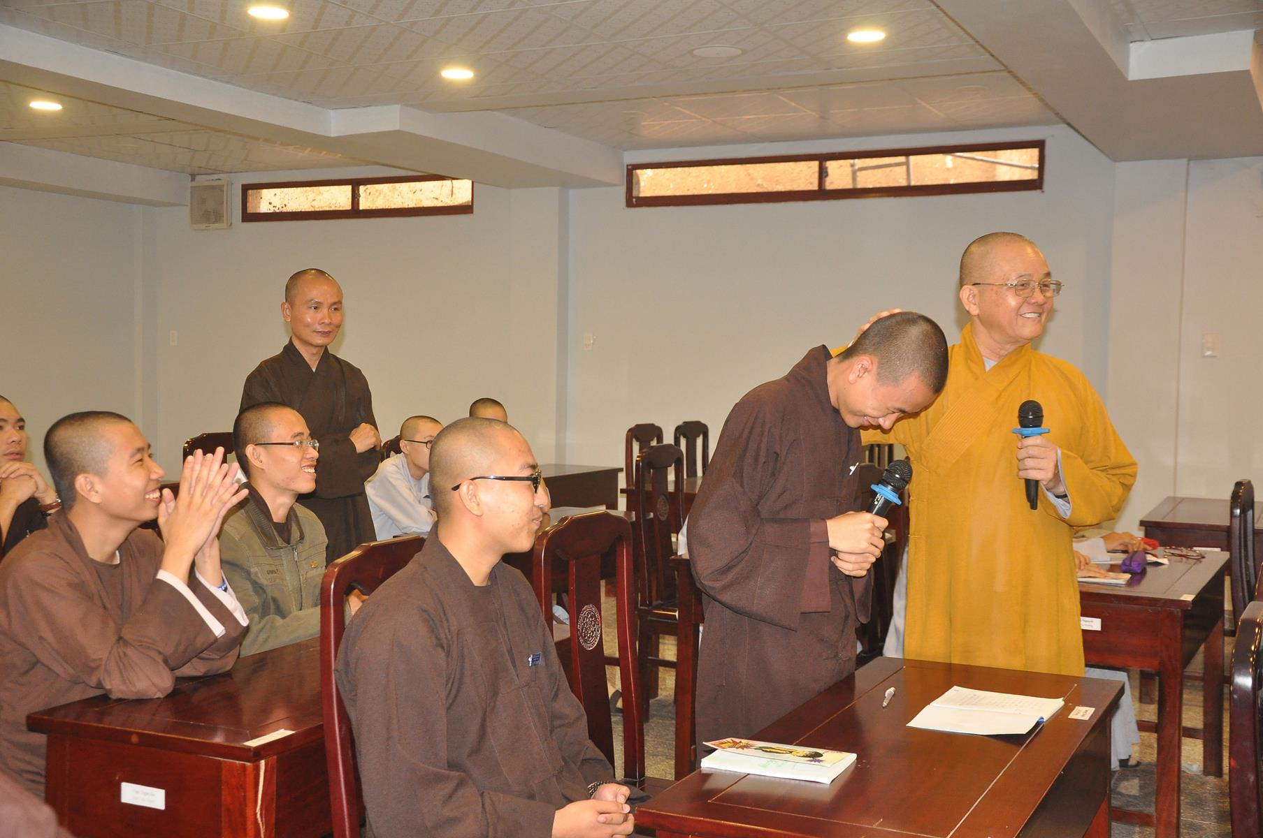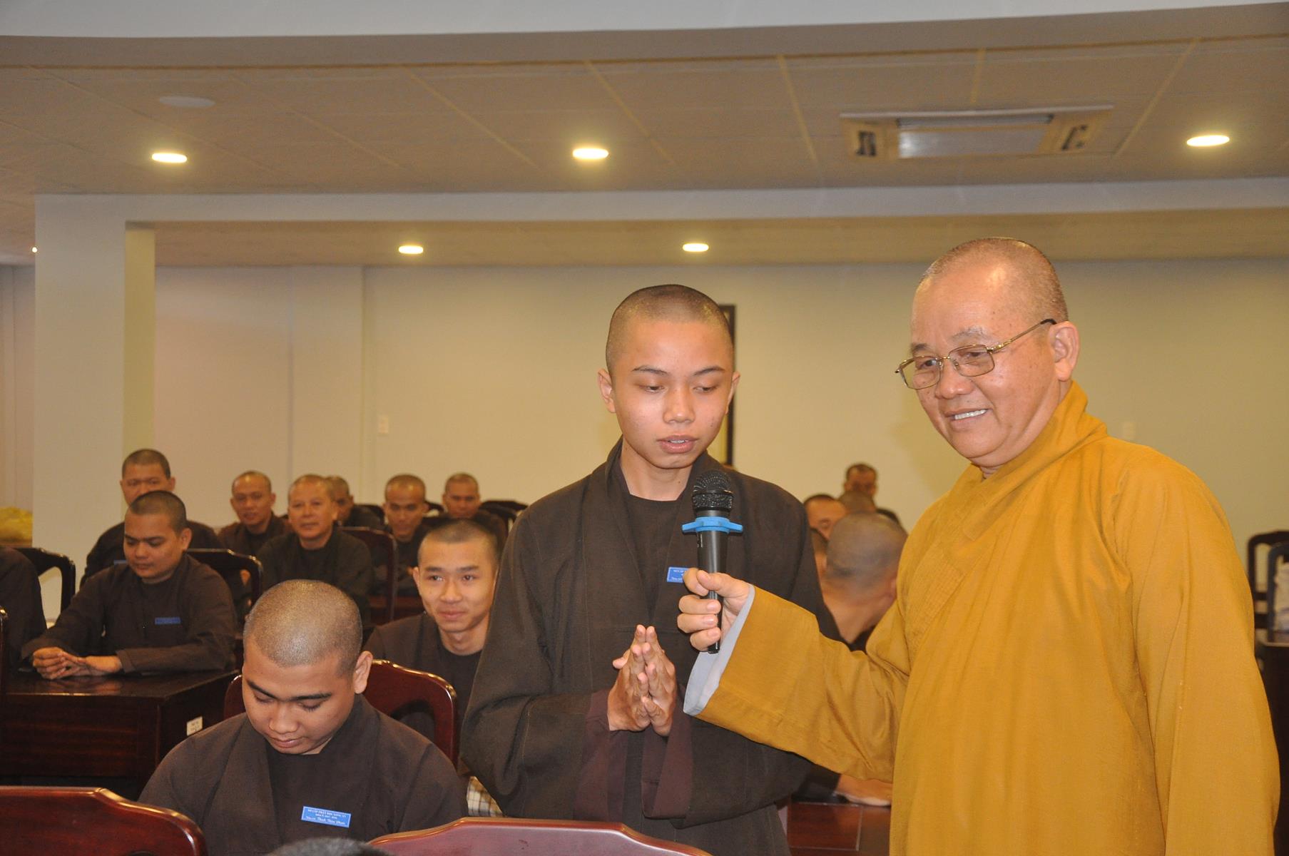 Sau những lời thăm hỏi, động viên, khích lệ đầy thương yêu, Hòa Thượng đã có những chia sẻ thật xúc động, ‘hôm nay Thầy về đây dành thời gian để chia sẻ cùng với các con sự tu, sự học. Nếu có thể gọi các con là con, thì Thầy sẽ xem các con là con của mình; nếu có thể gọi các con là em, thì Thầy sẽ xem các con là em của mình, năm nay Thầy tuổi đã ngoài 60, nhưng Thầy vẫn thấy sự học của mình chưa bao giờ là đủ, sự tu vẫn còn thiếu. Do đó, việc gì có thể làm lợi ích cho đàn hậu tấn, Thầy đều phát nguyện làm tròn công việc đó và Thầy gởi trọn niềm tin vào thế hệ tương lai, những người kế thừa sự nghiệp hoằng dương Phật pháp tại lớp Sơ Cấp này, mong các con ghi nhớ. Thầy trò chúng ta đang tiếp nhận năng lượng của Phật tổ, những vị tiền bối đối với mình, ai cũng mong muốn chúng ta làm tròn lời nguyện ban đầu’ “Hủy hình thủ chí tiết, cát ái từ sở thân, xuất gia hoằng thánh đạo, nguyện độ nhất thiết nhân”.