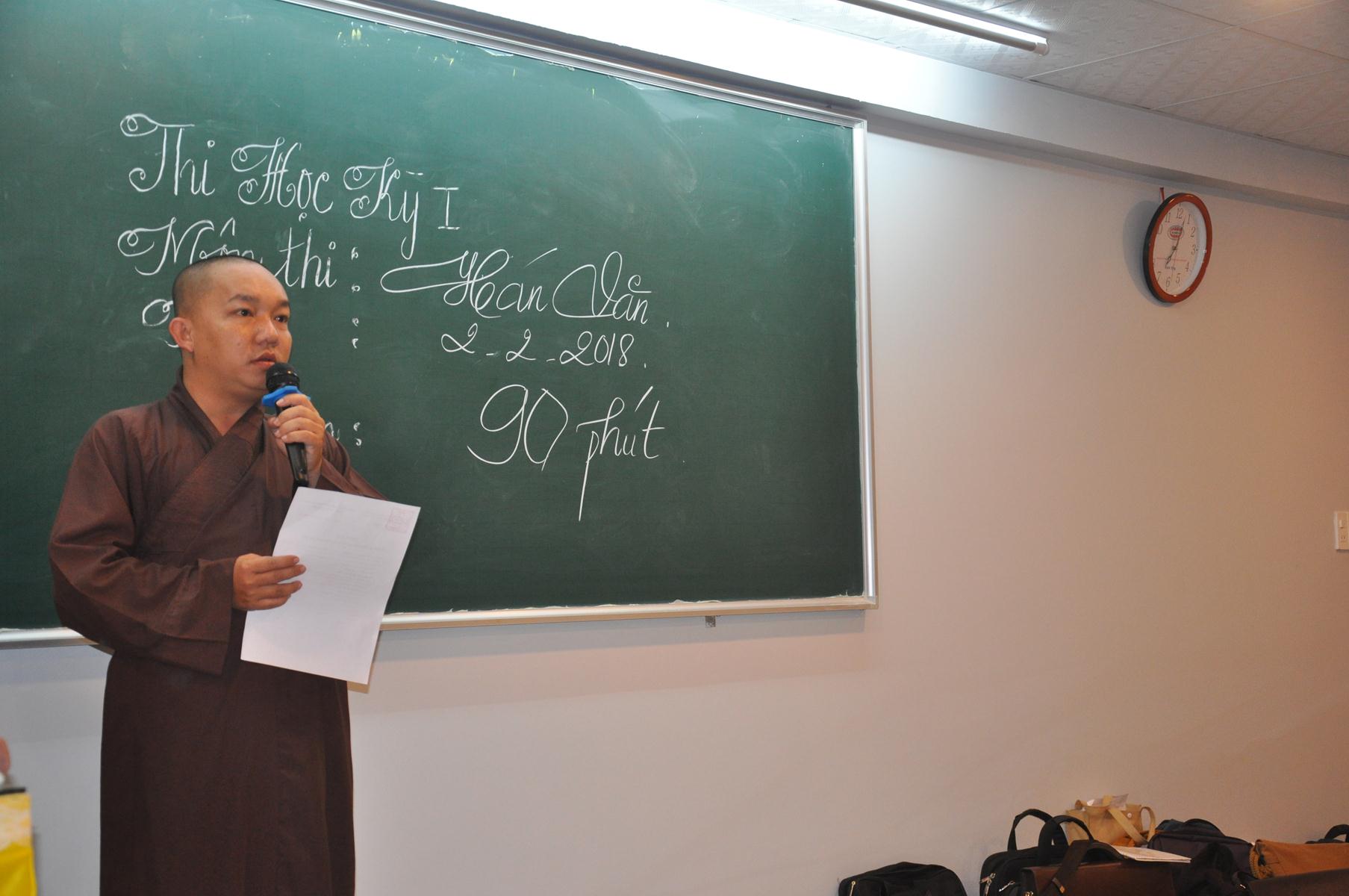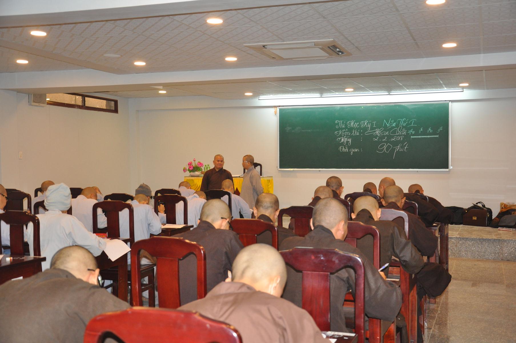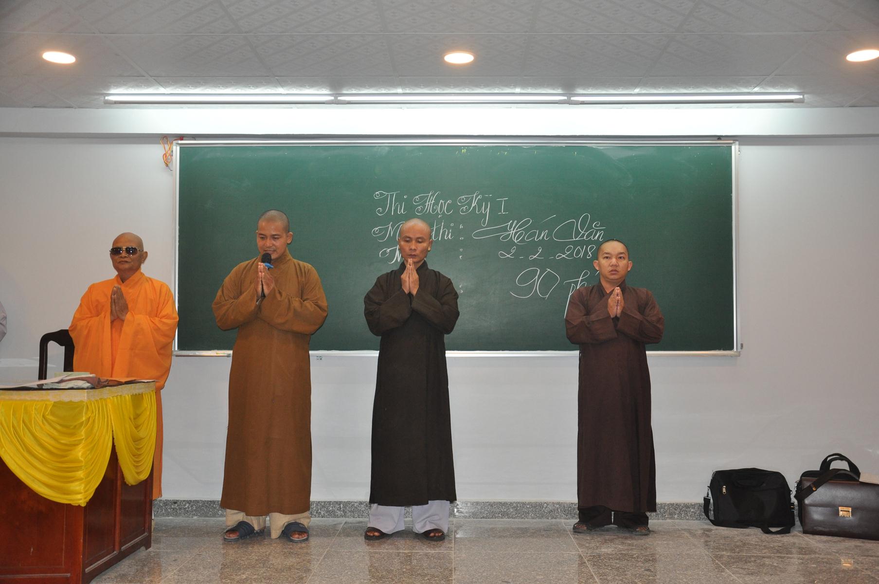 Thi học kỳ I diễn ra từ ngày 02 đến 07 tháng 2 năm 2018, với các môn thi như sau: Hán văn, Khuyến phát Bồ đề Tâm văn, Sơ đẳng Phật học Giáo khoa thư, Phật học Danh số, Kinh Pháp cú, Luật Tỳ Ni, Nhị khóa hiệp giải, Việt văn và Anh văn.