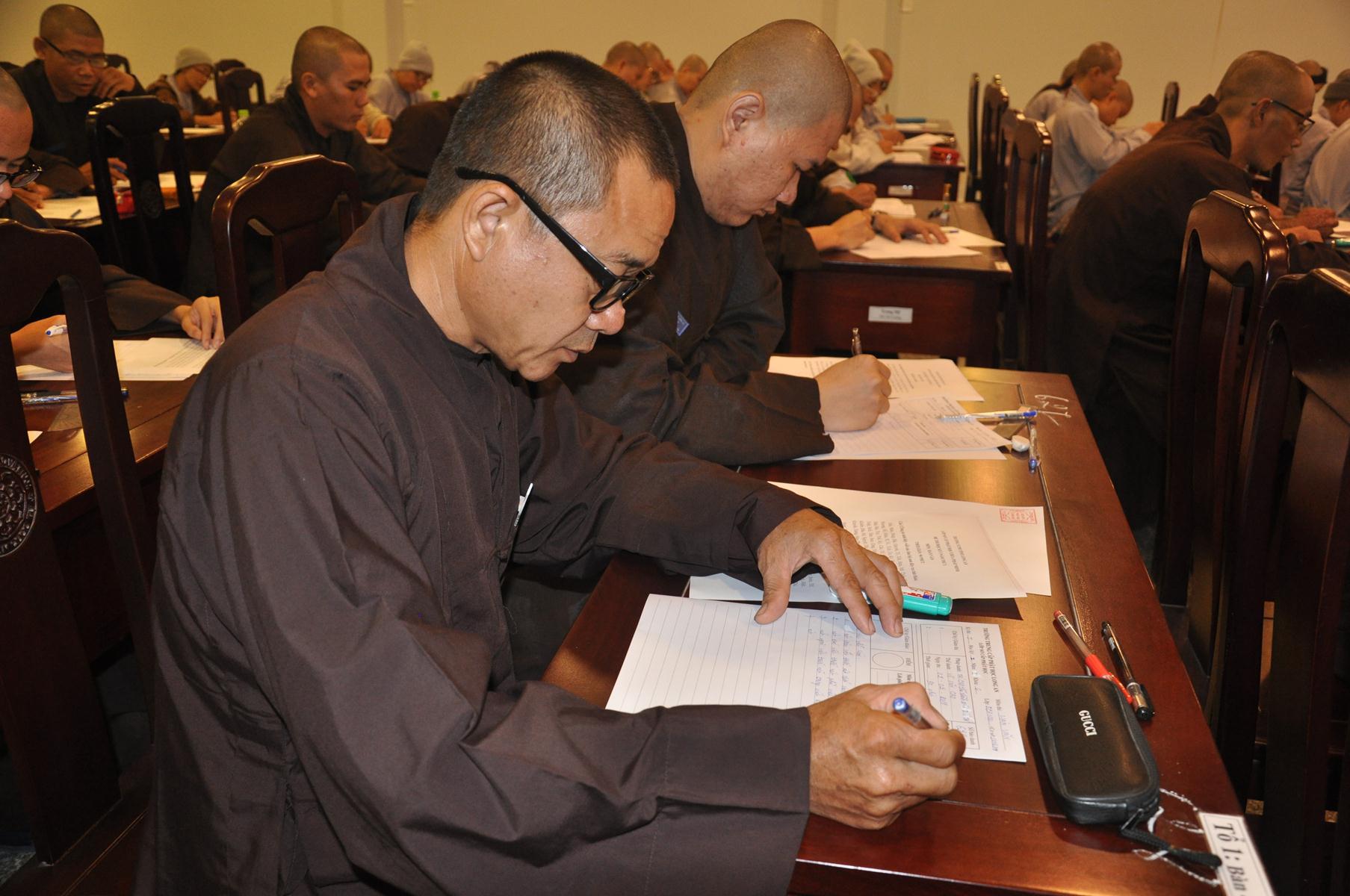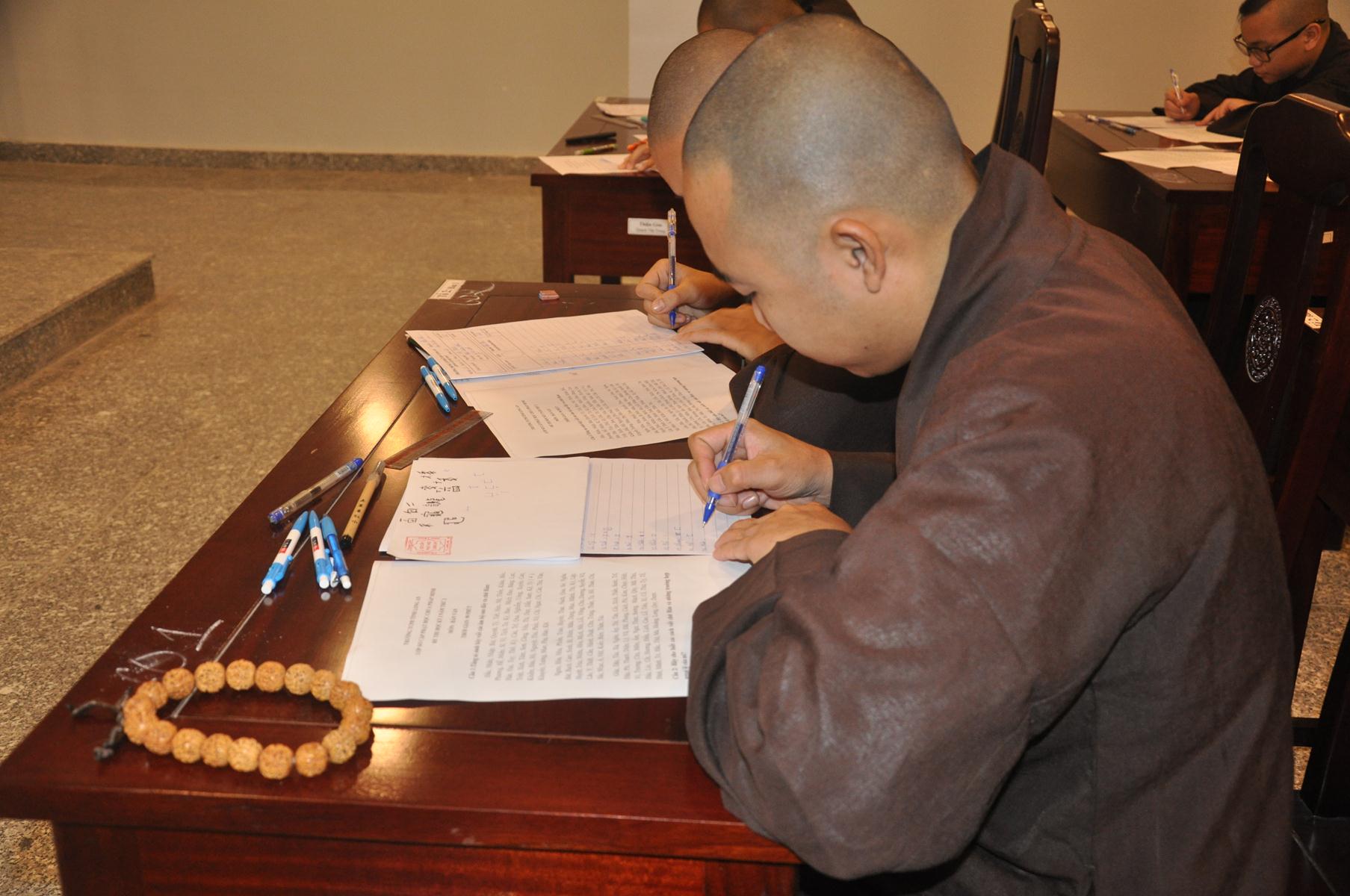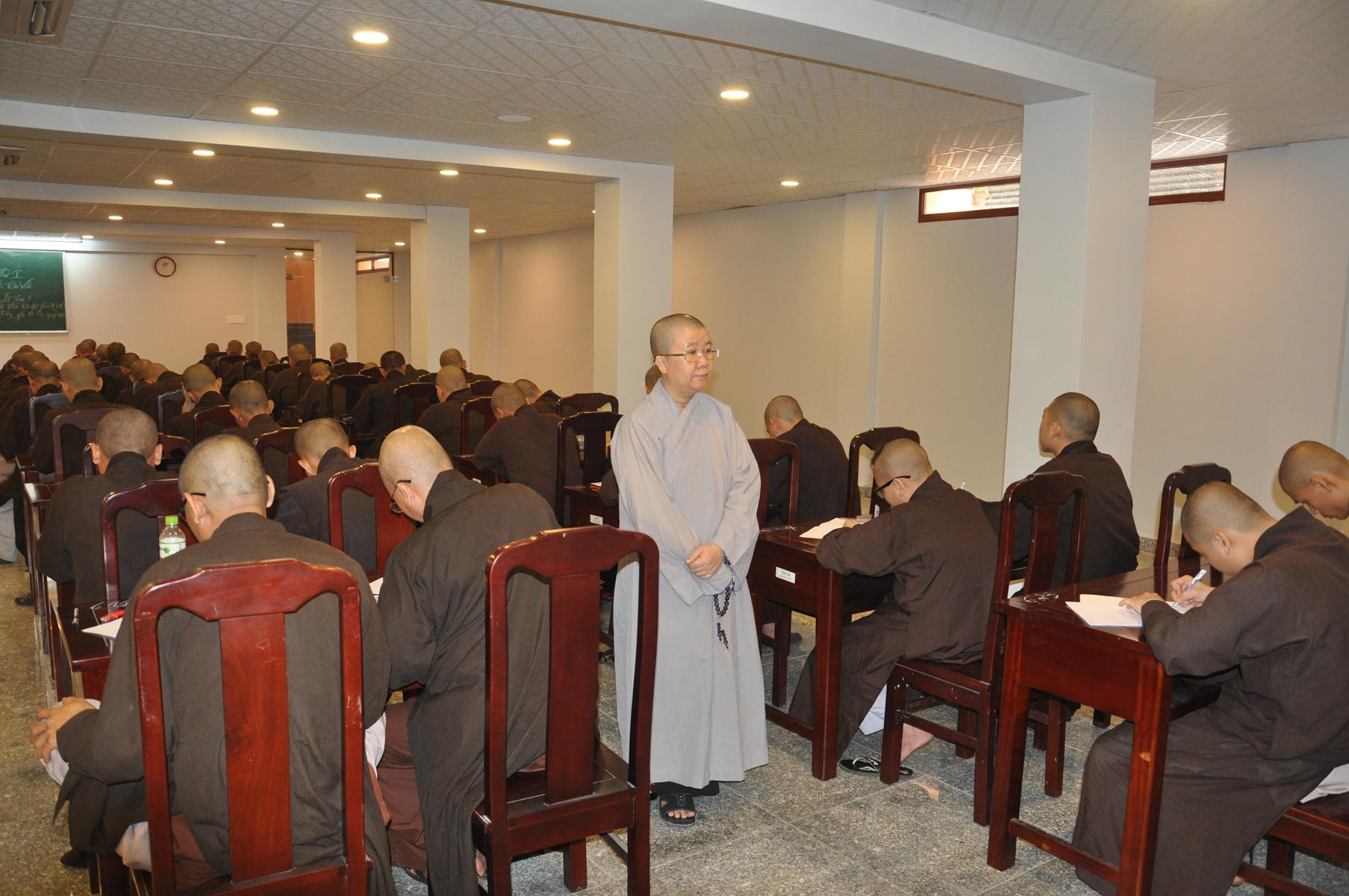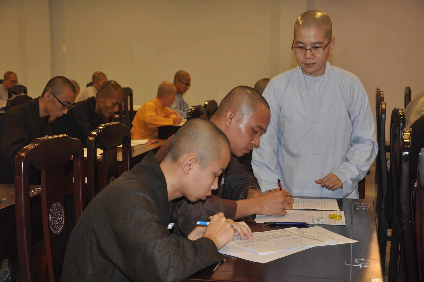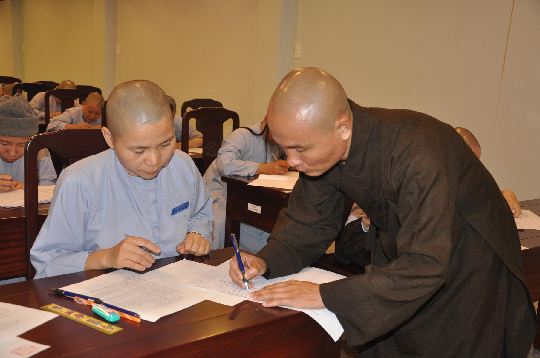 Vì đây là buổi thi đầu tiên nên chư Tăng Ni vô cùng hồi hộp và bỡ ngỡ lo âu, chính vì thế sự quan tâm của Hòa Thượng Trưởng Ban Trị Sự Phật giáo liên huyện và Chư Tôn đức trong Ban chủ nhiệm, như một nguồn động viên lớn để cả lớp yên tâm hơn trong một tuần thi. Hòa Thượng đã có lời sách tấn thiết thực cho Tăng Ni sinh trước kỳ thi. Đại đức Thích Minh Trí đã thay mặt Chư Tôn Đức Ban Chủ Nhiệm thông qua nội quy kỳ thi.