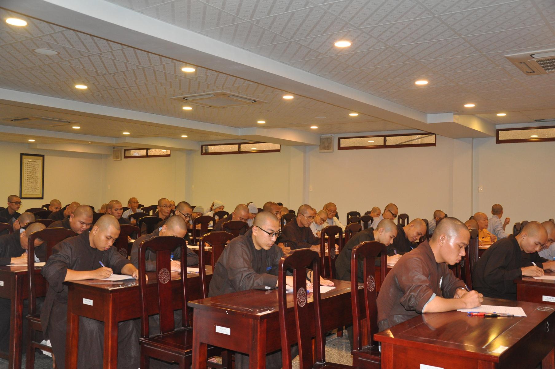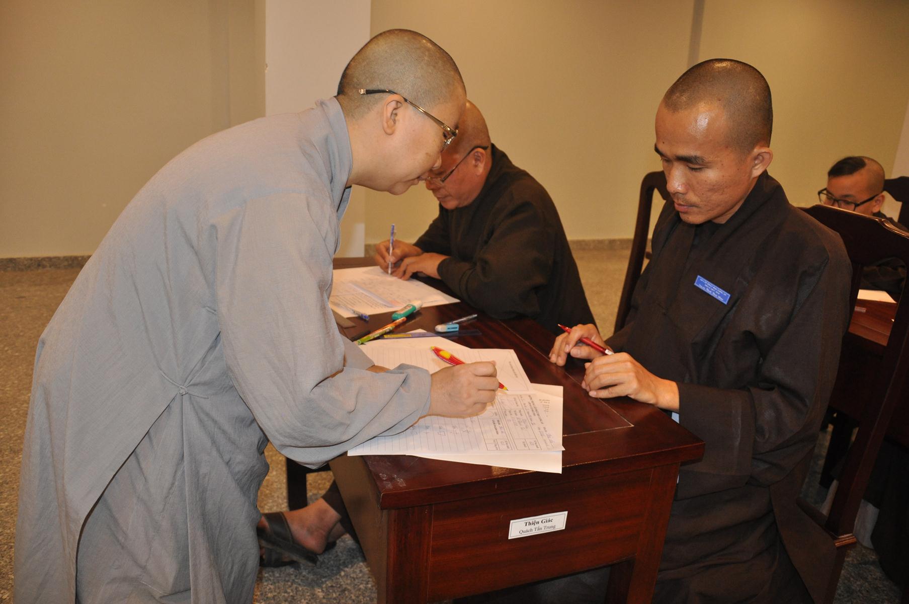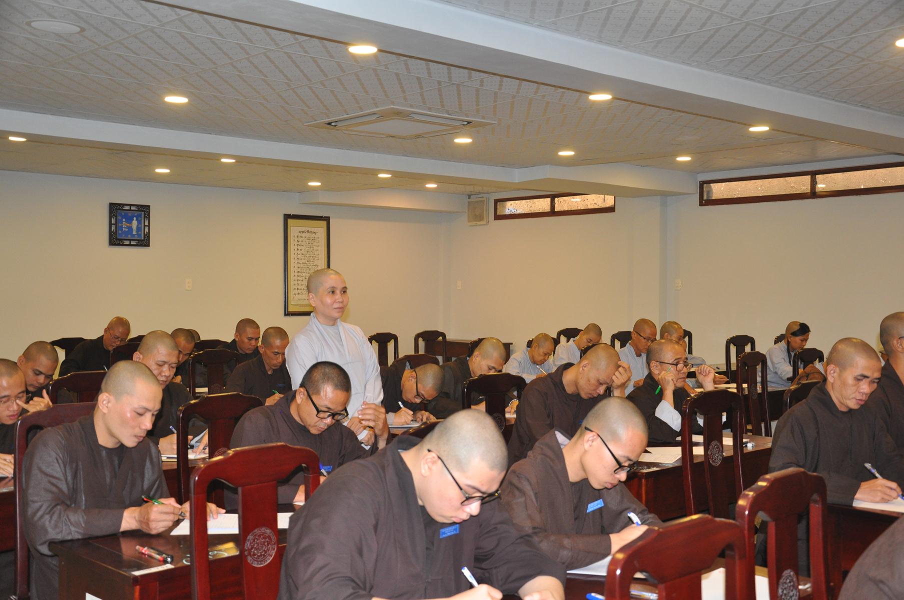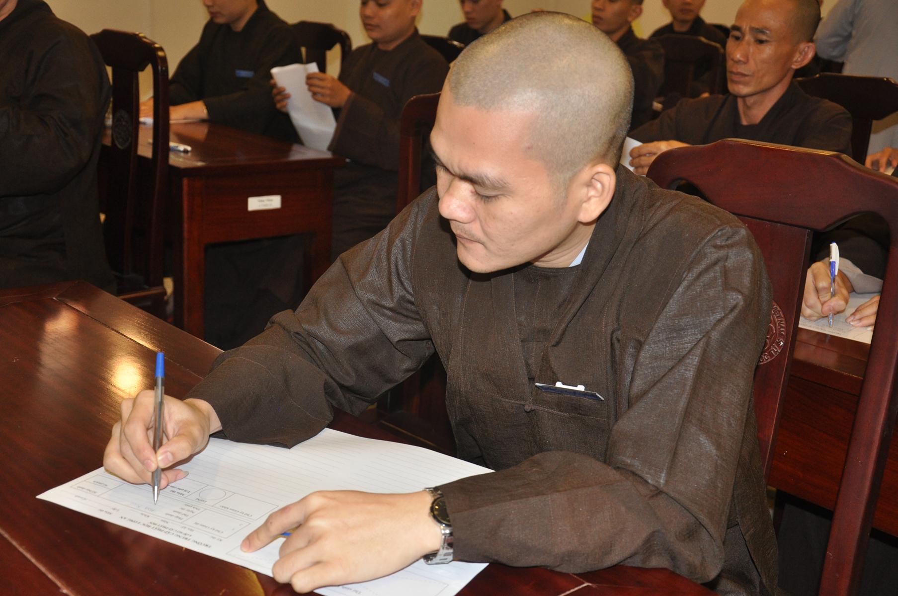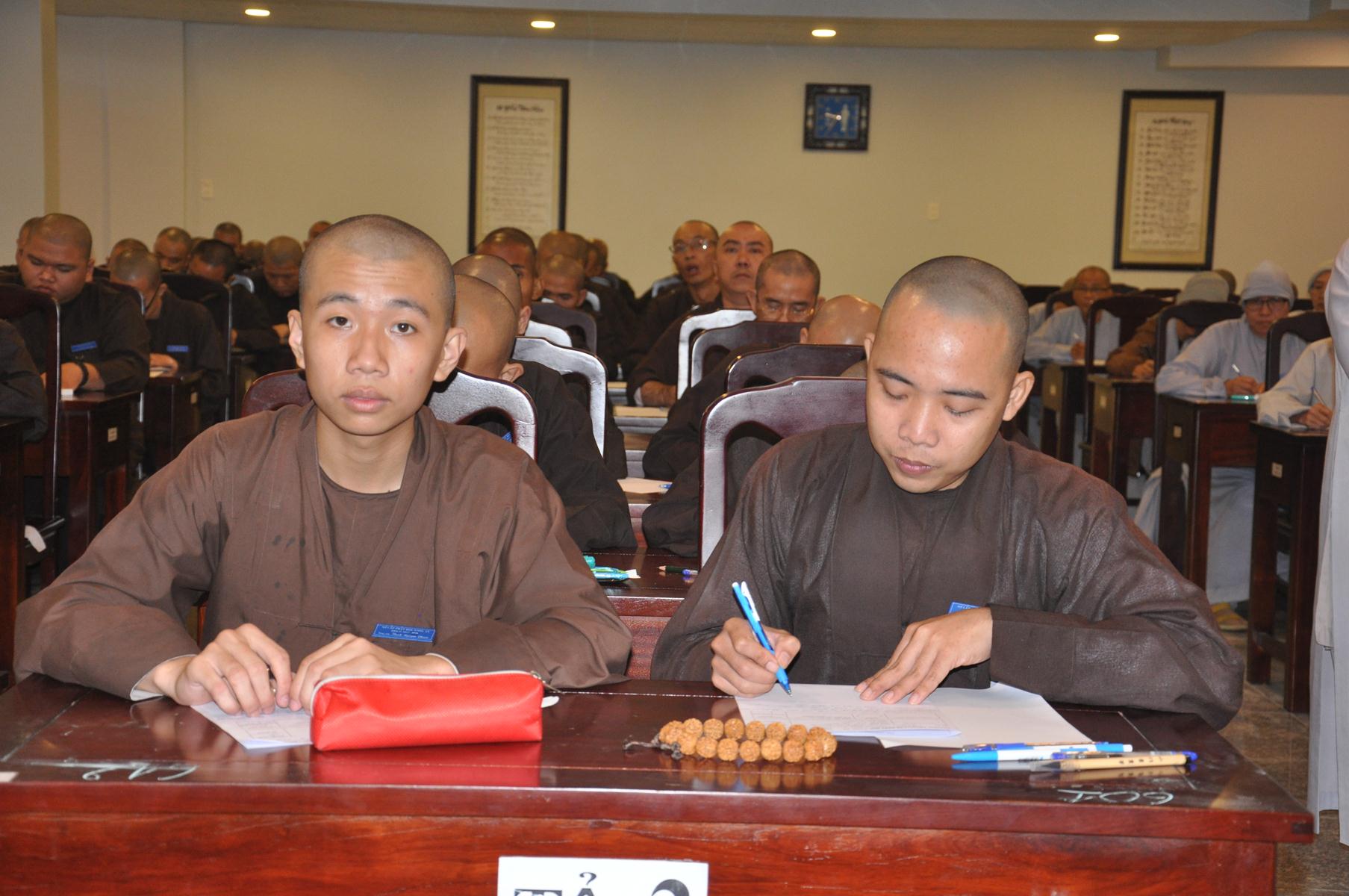 Vì đây là buổi thi đầu tiên nên chư Tăng Ni vô cùng hồi hộp và bỡ ngỡ lo âu, chính vì thế sự quan tâm của Hòa Thượng Trưởng Ban Trị Sự Phật giáo liên huyện và Chư Tôn đức trong Ban chủ nhiệm, như một nguồn động viên lớn để cả lớp yên tâm hơn trong một tuần thi. Hòa Thượng đã có lời sách tấn thiết thực cho Tăng Ni sinh trước kỳ thi. Đại đức Thích Minh Trí đã thay mặt Chư Tôn Đức Ban Chủ Nhiệm thông qua nội quy kỳ thi.