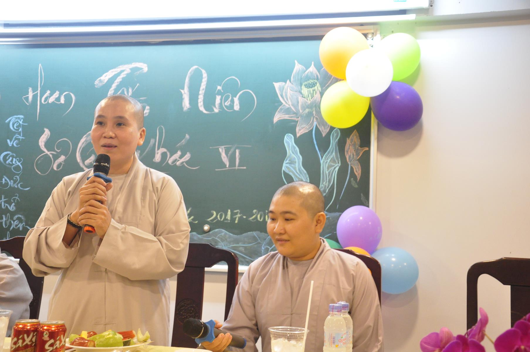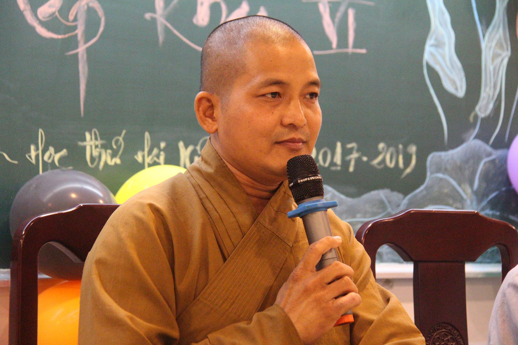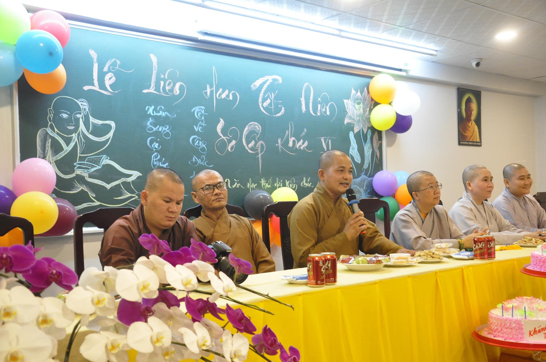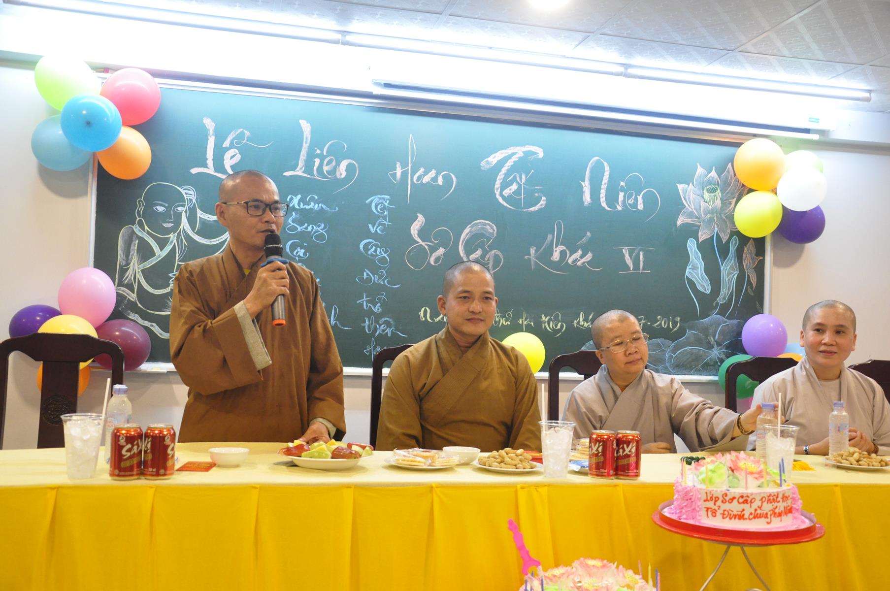 Đại đức Thích Lệ Duyên, Chánh Thư ký-Trưởng ban Phật giáo Quốc tế Ban trị sự GHPGVN tỉnh Long An, Phó trưởng ban trị sự GHPGVN liên huyện Đức Hòa-Đức Huệ- Chủ nhiệm Lớp Sơ cấp Phật học tỉnh Long An thay mặt chư tôn đức Ban Chủ nhiệm đã có lời huấn từ vô cùng cao quý, Đại đức khen ngợi về tinh thần tri ân và báo ân của tất cả Tăng Ni sinh “Thầy mong mỏi Tăng Ni sinh ý thức nhiều hơn nữa trong việc tu học và hành trì, với những kiến thức cơ bản học được ở Lớp Sơ cấp sẽ là nền tảng vững chắc cho Tăng Ni sinh trên con đường học Phật phía trước.Chúng ta đã đi hết 3/4 đoạn đường chỉ còn một học kỳ nữa là đã hoàn thành xong 2 năm học Sơ cấp, các Tăng Ni sinh sẽ bước lên một thềm thang mới với những kiến thức rộng hơn và với những Thầy Cô và những người bạn mới. Với Thầy cũng như quý chư tôn đức trong Ban Chủ nhiệm, chư tôn đức giáo thọ sư không mong đợi ở những món quà bên ngoài mà sẽ vô cùng hoan hỷ khi được nhìn thấy những người học trò của mình ngày một lớn hơn, trưởng thành hơn, ý thức trách nhiệm về bổn phận của người xuất gia có đầy đủ nhân cách đạo đức, biết khiêm cung, lễ phép, hiểu được giá trị của việc xuất gia là vô cùng cao thượng. Thầy mong sẽ được nhìn thấy các Tăng Ni sinh trong hình ảnh của những vị Tăng vị Ni trẻ năng nỗ, hy sinh, cống hiến góp phần tích cực phụng sự vào ngôi nhà Phật pháp”.