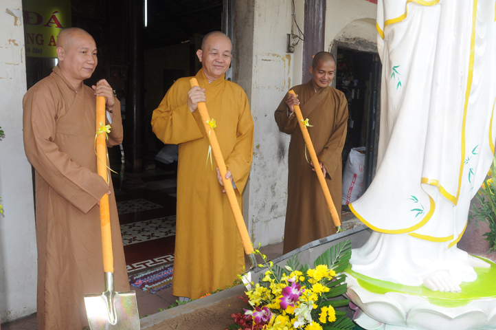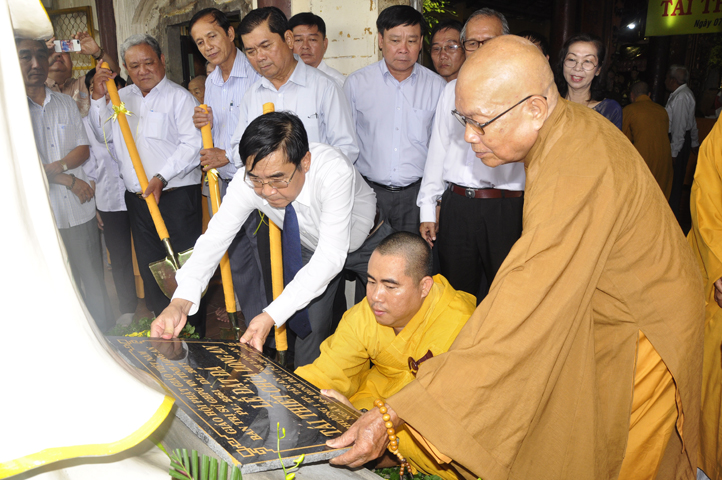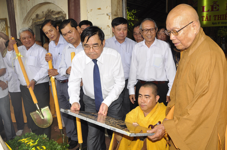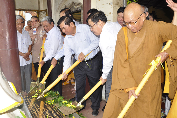 Sau phần lễ nghi hành chánh, ban Tô chức cung thỉnh quý chư tôn đức cùng quý vị lãnh đạo đặt viên đá khởi công tái thiết.