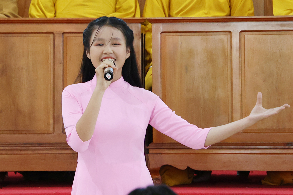 Sau nghi thức niệm Phật cầu gia hộ, chào Quốc kỳ, Đạo kỳ, Bài hát “Ước nguyện dưới chân Người” do Phật tử Hòa Nhân Hạnh biểu diễn cúng dường Chư tôn đức cùng toàn thể các em khóa sinh.