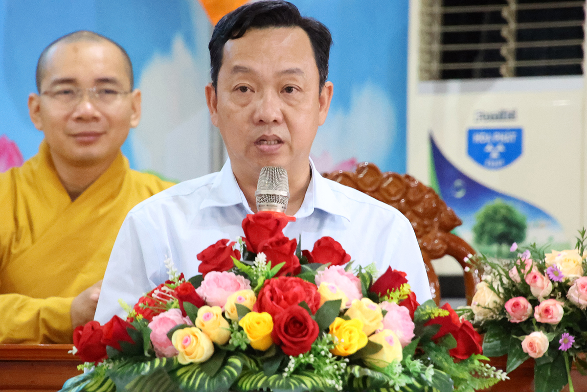 Đại diện các cấp lãnh đạo chính quyền, ông Nguyễn Thanh Sơn có lời phát biểu. Đầu tiên, ông gửi lời vấn an sức khỏe chư tôn đức và lời chúc tốt đẹp đến toàn thể hội chúng. Khóa tu mùa hè là nơi nuôi dưỡng thân tâm của các em sau một năm học dài, là sân chơi thiết thực mang lại lợi ích lớn. Ngoài lời động viên các em khóa sinh, ông còn có lời nhắc nhở Ban Tổ chức quan tâm sâu sắc đến sức khỏe của các em khóa sinh.