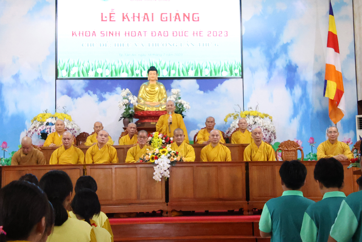 HT. Thích Minh Thiện có lời sách tấn tại buổi lễ. Lời đầu tiên, Hòa thượng có lời vấn an trân trọng, tri ân và lời chúc tốt đẹp nhất đến toàn thể hội trường. Khóa tu mùa hè tại chùa Thiên Châu diễn ra với mục đích nêu cao tinh thần từ bi, trí tuệ của đạo Phật, hướng các em trở thành một công dân có ích, có lòng yêu nước, biết ơn và đền ơn theo truyền thống của dân tộc Việt Nam. Ngoài ra còn bồi dưỡng cho các em một số kỹ năng có ích trong cuộc sống đời thường. Hòa thượng mong muốn sau khóa tu, các em sống với tinh thần: “Không làm các việc ác, siêng làm các việc lành, giữ tâm ý thanh tịnh, mới là chơn Phật tử”.