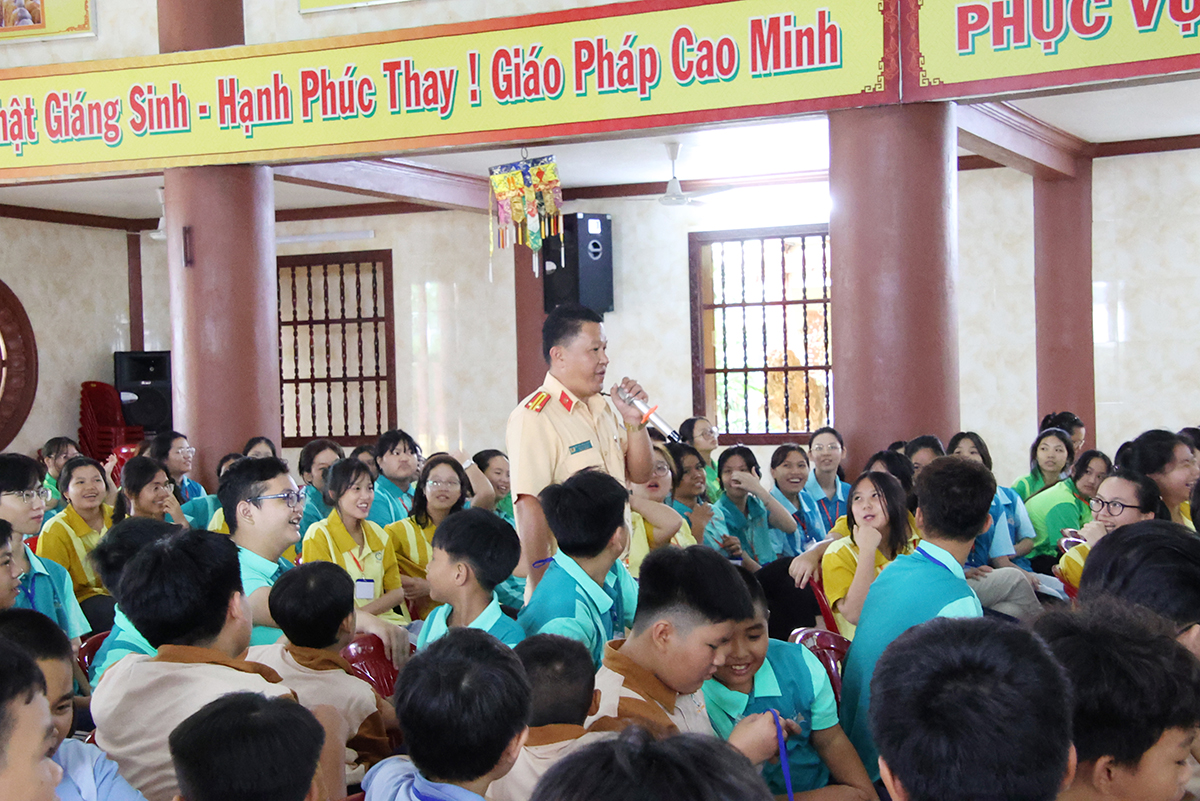 ĐĐ. Thích Pháp Huân thay mặt Ban Tổ chức đọc diễn văn khai mạc và báo cáo công tác tổ chức khóa Đạo đức hè năm 2023 tại chùa Thiên Châu. Đại đức trình bày khái quát về mục đích của việc tổ chức khóa đạo đức nhằm giúp các em biết thương yêu, đối xử tốt với mọi người, có tình yêu thiên nhiên, đất nước, con người trở thành một người công dân có ích cho xã hội. Theo đó, có gần 300 khóa sinh đăng ký sinh hoạt trong năm nay. Đại đức kính tri ân Hòa thượng trụ trì chùa Thiên Châu, chư Tăng và Phật tử, các cấp lãnh đạo chính quyền và quý mạnh thường quân đã phát tâm hỗ trợ để khóa học được diễn ra. Sau đó, Đại đức đã trình bày về nội dung của khóa học bao gồm: Giá trị của sự vâng lời, kính cha mẹ, cảm hóa bạn xấu, tôn kính Phật, nói không với game, nâng cao thể lực, tập luyện võ thuật, văn hóa kỹ năng,…. Khóa học có 50 huynh trưởng tham gia hỗ trợ.