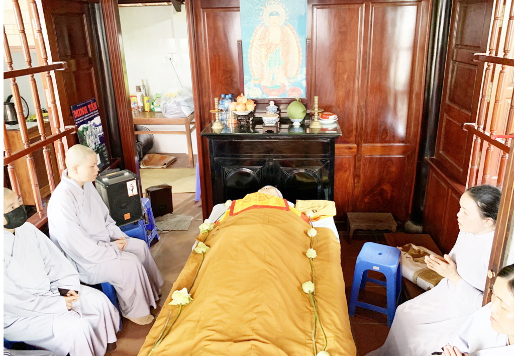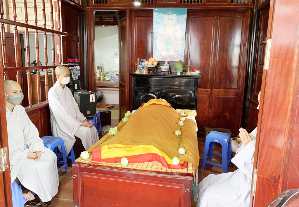 Tại Giác linh đường, Hòa thượng Thích Thiện Tài đã thực hiện nghi thức trị quan, sái tịnh đàn tràng, đồng nhất tâm niệm danh hiệu Đức Phật A Di Đà. Trong tiếng niệm Phật của toàn thể Tăng Ni, Phật tử, chư Hoà thượng đến phương trượng thực hiện cử hành nghi lễ truyền thống, môn đồ pháp quyến cung thỉnh nhục thân Ni trưởng từ phương trượng đến Giác linh đường để nhập kim quan trong tiếng niệm Phật trầm hùng của đại chúng.