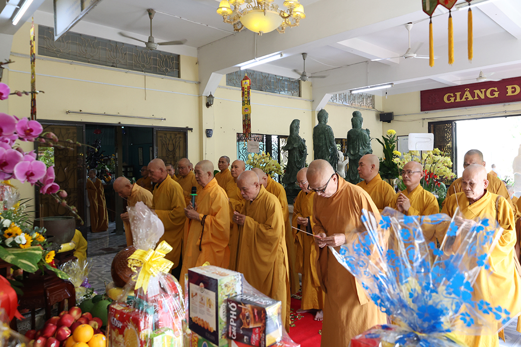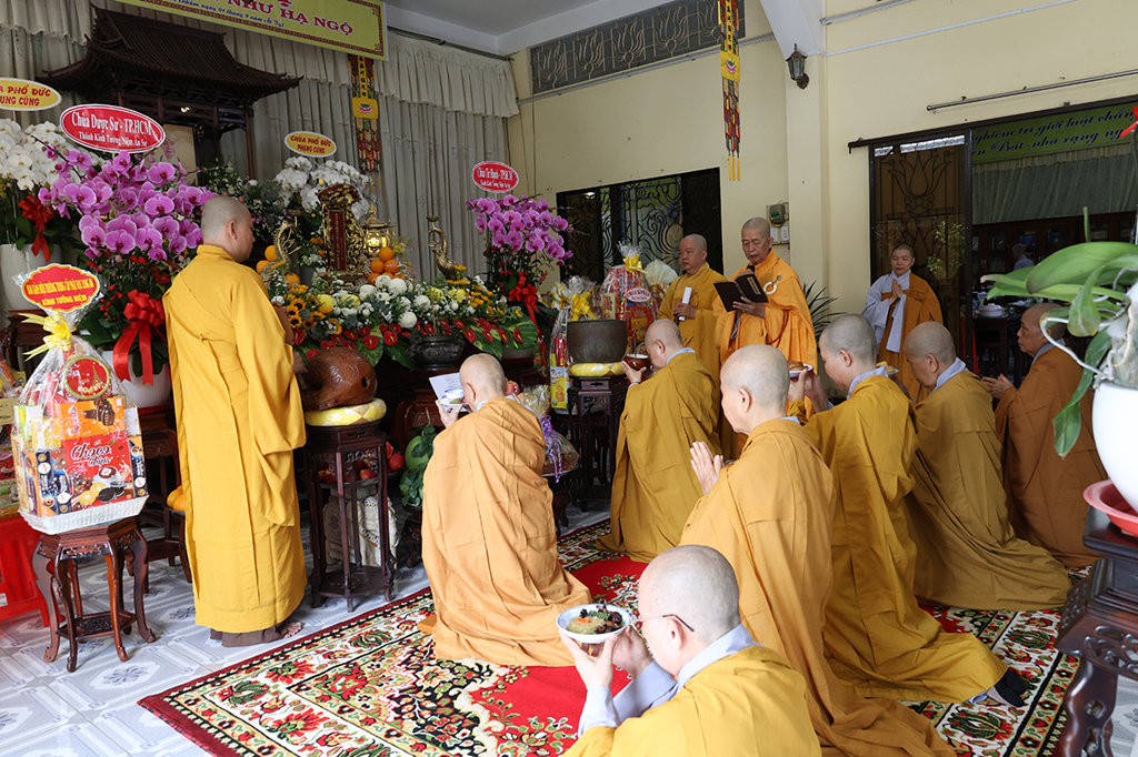 Tại buổi lễ, Chư Tôn đức Ban kinh sư quang lâm Phật điện tác pháp cúng ngọ, hồi hướng công đức cúng dường.