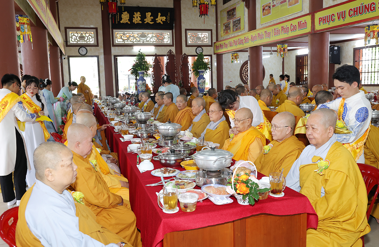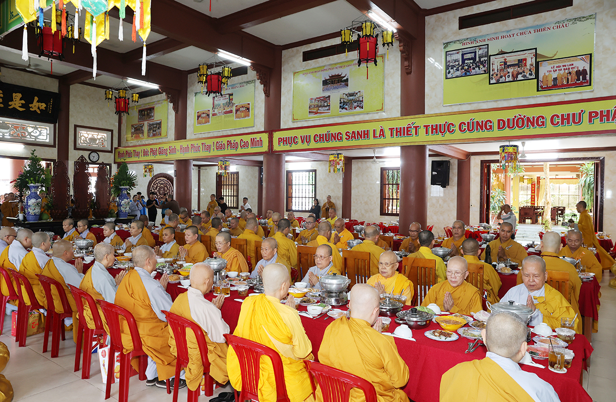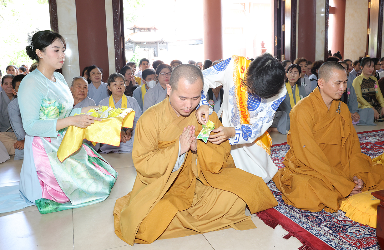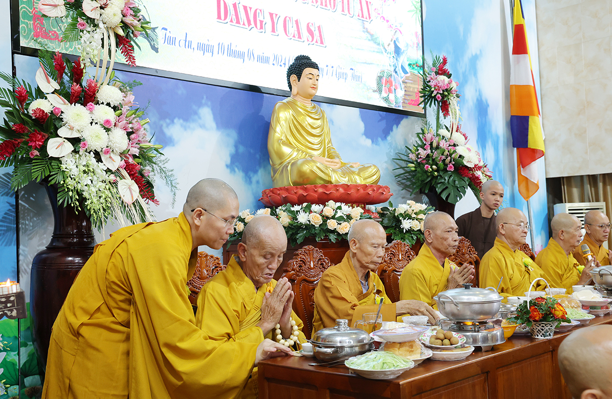 Nối tiếp chương trình Đại lễ là nghi thức tác bạch mừng khánh tuế dâng lên Chư Tôn đức chứng minh của đại diện Chư tăng, Phật tử chùa Thiên Châu. Quý Phật tử đồng kính mừng khánh tuế Chư tôn đức giáo phẩm sau mùa An cư Kiết hạ PL. 2568 – DL. 2024. Kính mừng quý Ngài tăng trưởng Hạ lạp, đồng thời bày tỏ lòng tri ân của những người con Phật đối với bậc xuất gia. Quý Phật tử trang nghiêm dâng Pháp y cúng dường lên Chư tôn đức hiện tiền.