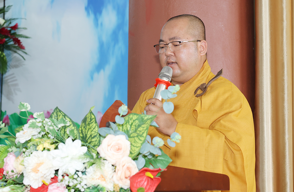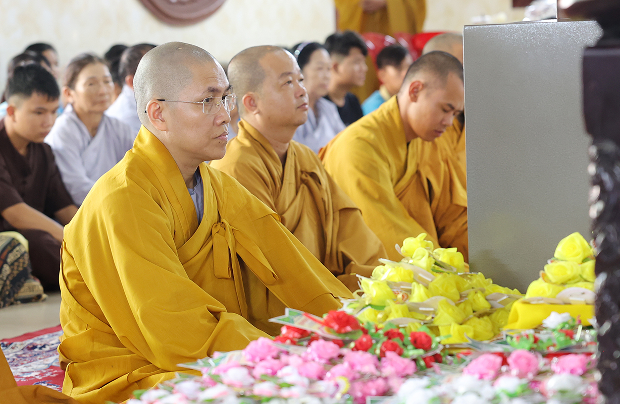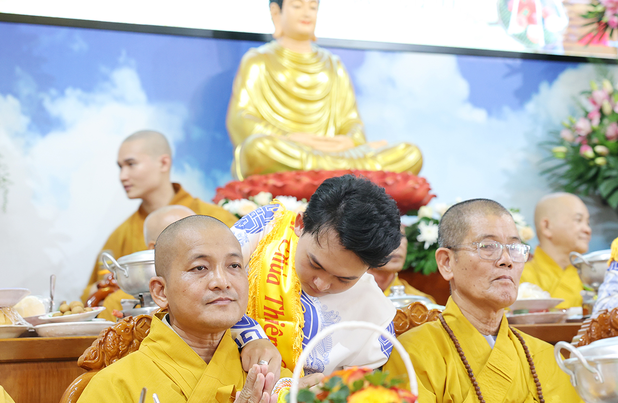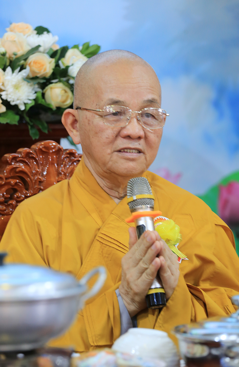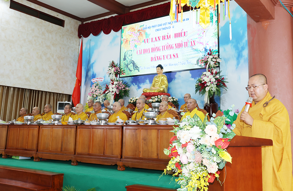 Đãi lao Chư tôn đức Chứng minh, Hòa thượng Thích Minh Thiện có lời đạo từ tại buổi lễ. Hòa thượng nhắc lại truyền thống tốt đẹp của người dân Việt Nam là hiếu thảo, cần cù sáng tạo, anh hùng bất khuất. Đại lễ Vu Lan Báo Hiếu là dịp vô cùng đặc biệt để những người con Phật bày tỏ lòng hiếu kính đến hai đấng sinh thành của mình, đồng thời cũng là dịp phát huy đức tính hiếu hạnh truyền thống của con người Việt Nam. Hoà thượng nhắc về ý nghĩa của 3 tháng an cư của Chư Hành giả an cư. Ngày Vu Lan cũng là ngày Chư Tăng Ni hoàn tất 3 tháng an cư kiết hạ, thúc liễm thân tâm, trau dồi giới định tuệ nhằm tăng trưởng đạo tâm, là nơi nương tựa của hàng Phật tử. Hoà thượng nói về ý nghĩa của Tứ trọng ân, qua đó chỉ dạy Quý Phật tử cần phải chuyên làm việc thiện, tránh xa những việc ác để hướng công đức đến thâm ân của mình. Cuối lời, Hoà thượng có lời tán thán đến lòng hiếu tâm của Quý Phật tử và gửi lời chúc tốt đẹp nhất trong mùa Vu Lan đến toàn thể đạo tràng.
