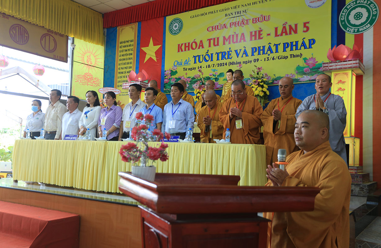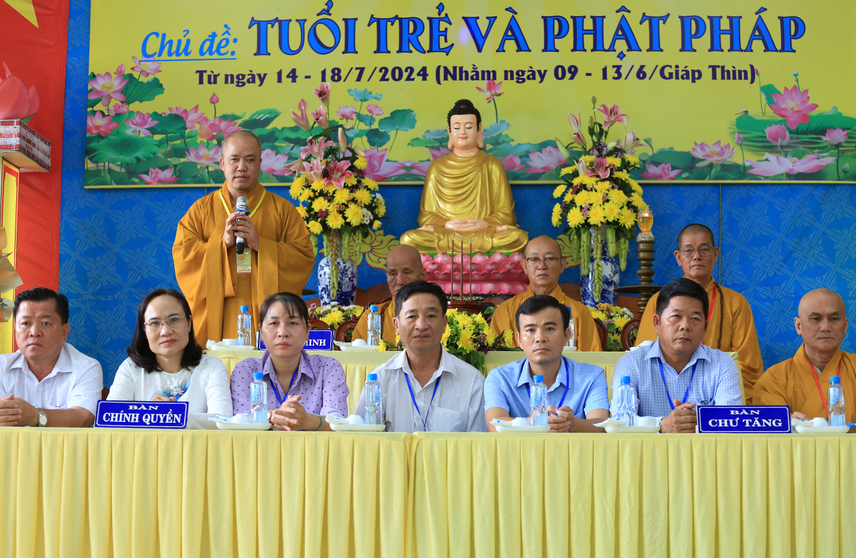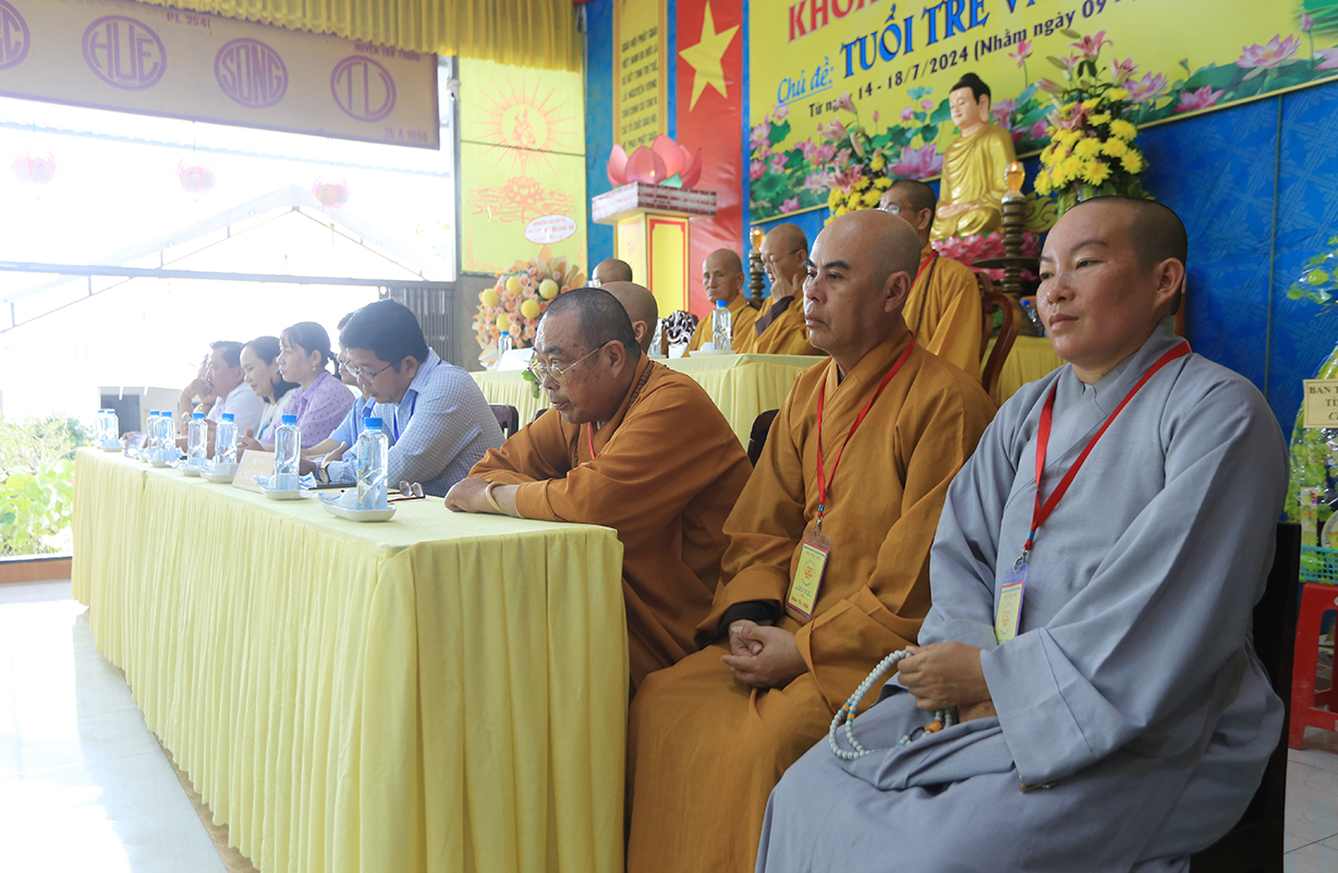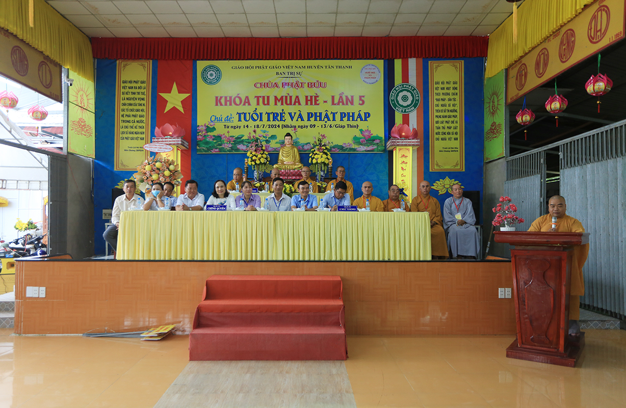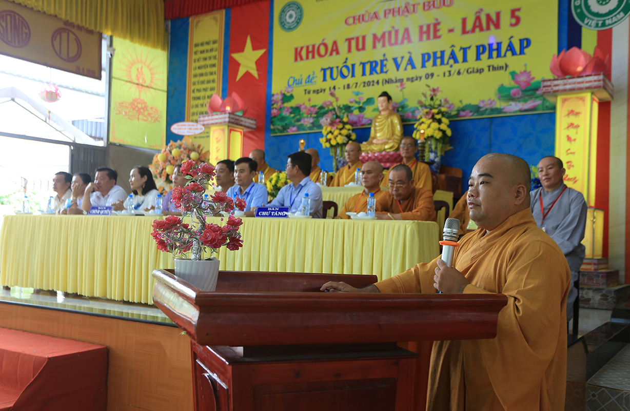 Phát biểu Khai mạc buổi lễ, Thượng tọa Thích Lệ Tấn – Trưởng BTS GHPGVN huyện, Trưởng Ban Tổ chức Khóa tu đã nêu lên ý nghĩa của việc tổ chức khóa tu mùa hè, nhằm hướng thanh thiếu niên hướng tới lối sống tích cực trong cộng đồng, trước làn sóng phát triển công nghệ hiện đại, sự suy hóa về đạo đức và ảnh hưởng của công nghệ thông tin mạng, cần có định hướng nhân cách đạo đức, Phật hóa đời sống của con người để xây dựng tương lai tốt đẹp cho mọi người và hướng con người hướng đến nhận thức mới, lối sống mới trong thời đạo mới.